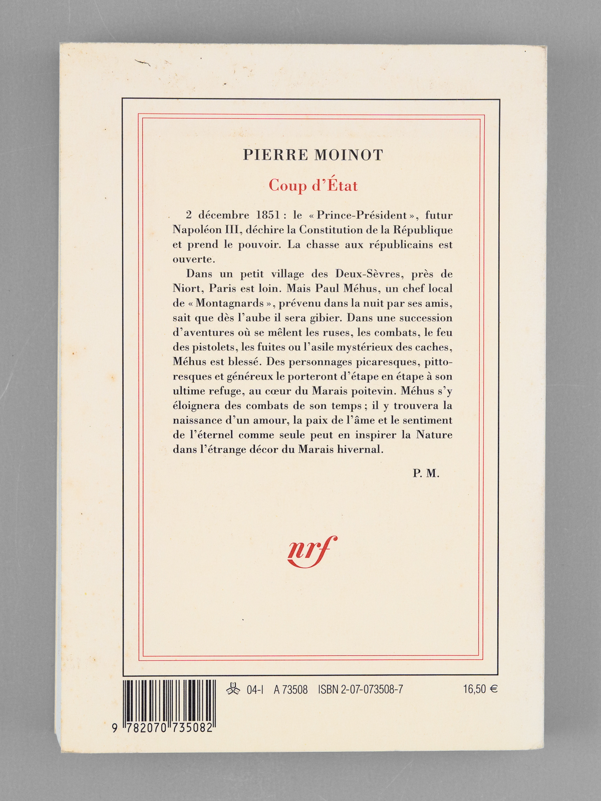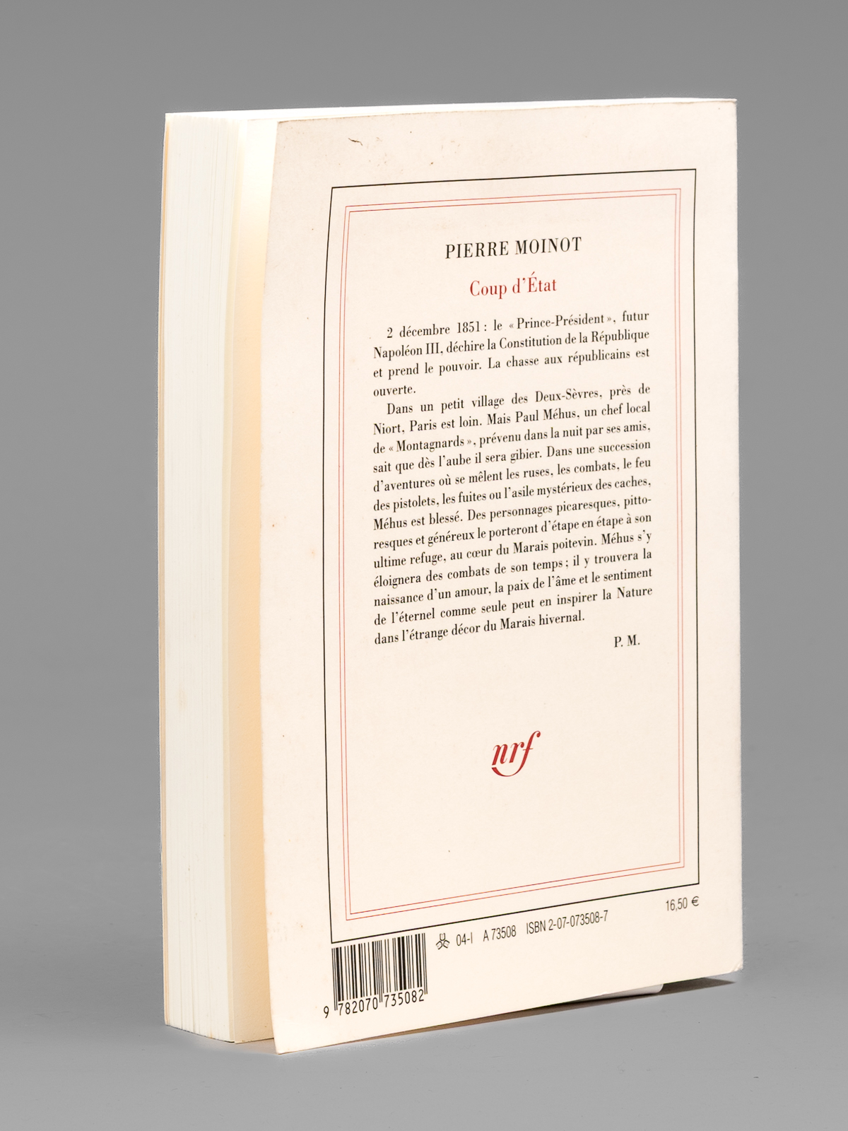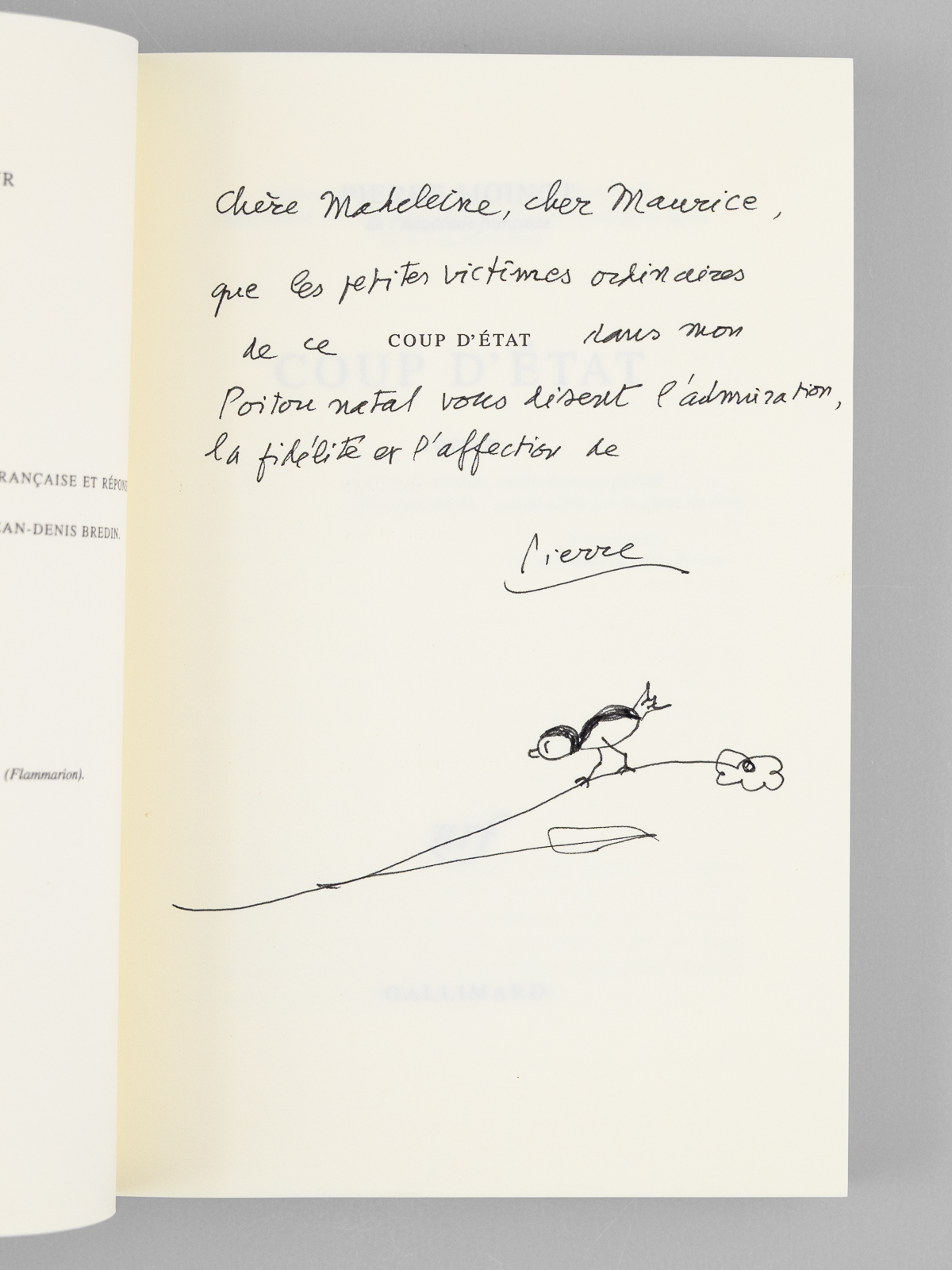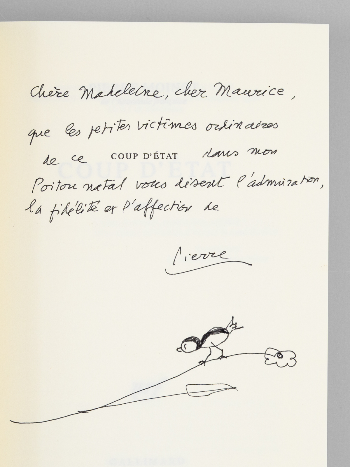 1 vol. in-8 br., NRF Gallimard, 2003, 230 pp. Commentaire : Envoi illustré de l'auteur à Maurice Druon et à son épouse : 'Chère Madeleine, cher Maurice, Que les petites victimes ordinaires de ce coup d'Etat dans mon Poitou natal vous disent l'admiration, la fidélité et l'affection de Pierre [dessin de moineau]'. Bon état. Maurice Druon (1918-2009), neveu de Joseph Kessel, fut résistant, écrivain auteur notamment de la saga des Rois maudits, homme politique. Elu à l'Académie Française en 1968, il en devint le Secrétaire Perpétuel en 1985. Quant à Pierre Moinot, résistant puis haut-focntionnaire, il fut élu à l'Académie en 1982. Exemplaire avec un bel envoi à un destinataire prestigieux.