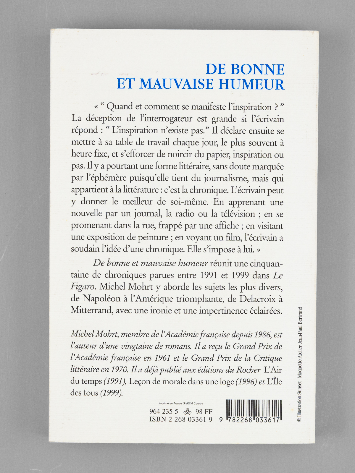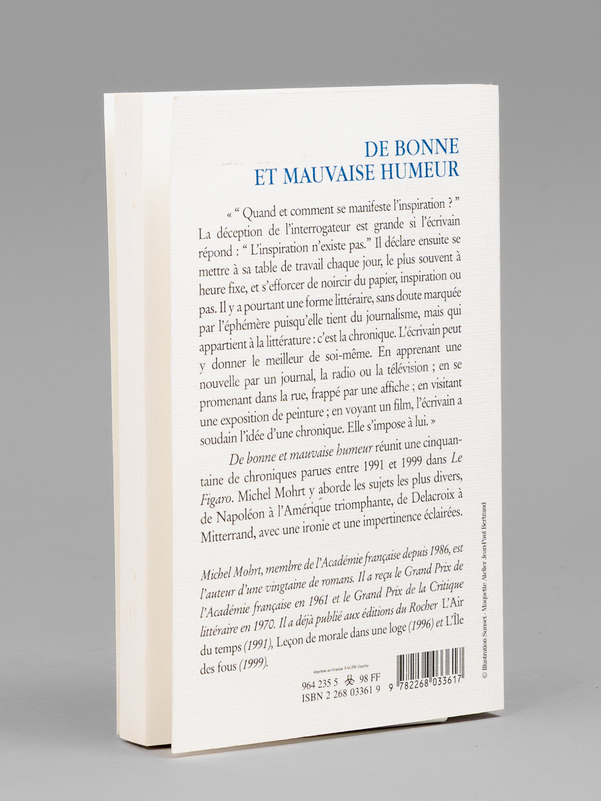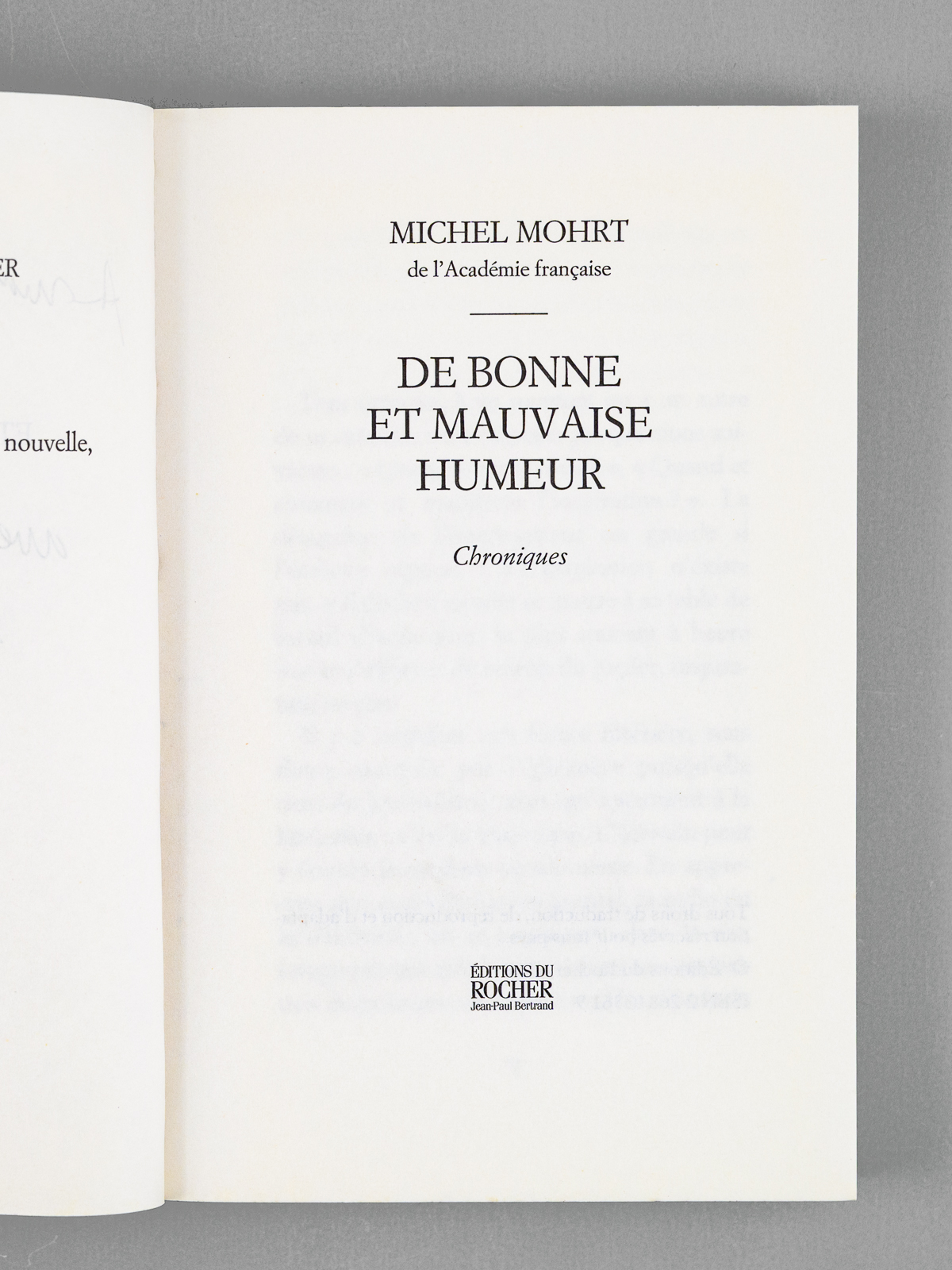 Envoi ms. de l'auteur, 1 vol. petit in-8 br., Editions du Rocher, Paris, 1999, 207 pp. Commentaire : L'ouvrage, dédicacé à Maurice Druon 'A mon Secrétaire Perpétuel Maurice Druon, avec mon amitié la plus fidèle'), réunit le texte d'une cinquantaine de chroniques de Michel Mohrt parues dans Le Figaro entre 1991 et 1999. Romancier, écrivain et historien de la littérature, Michel Mohrt (1914-2011) fut élu en 1985 membre de l'Académie française au Fauteuil 33, le fauteuil de Voltaire, où il succède à Marcel Brion. Bon état (qq. rouss. sur tranche en tête).
