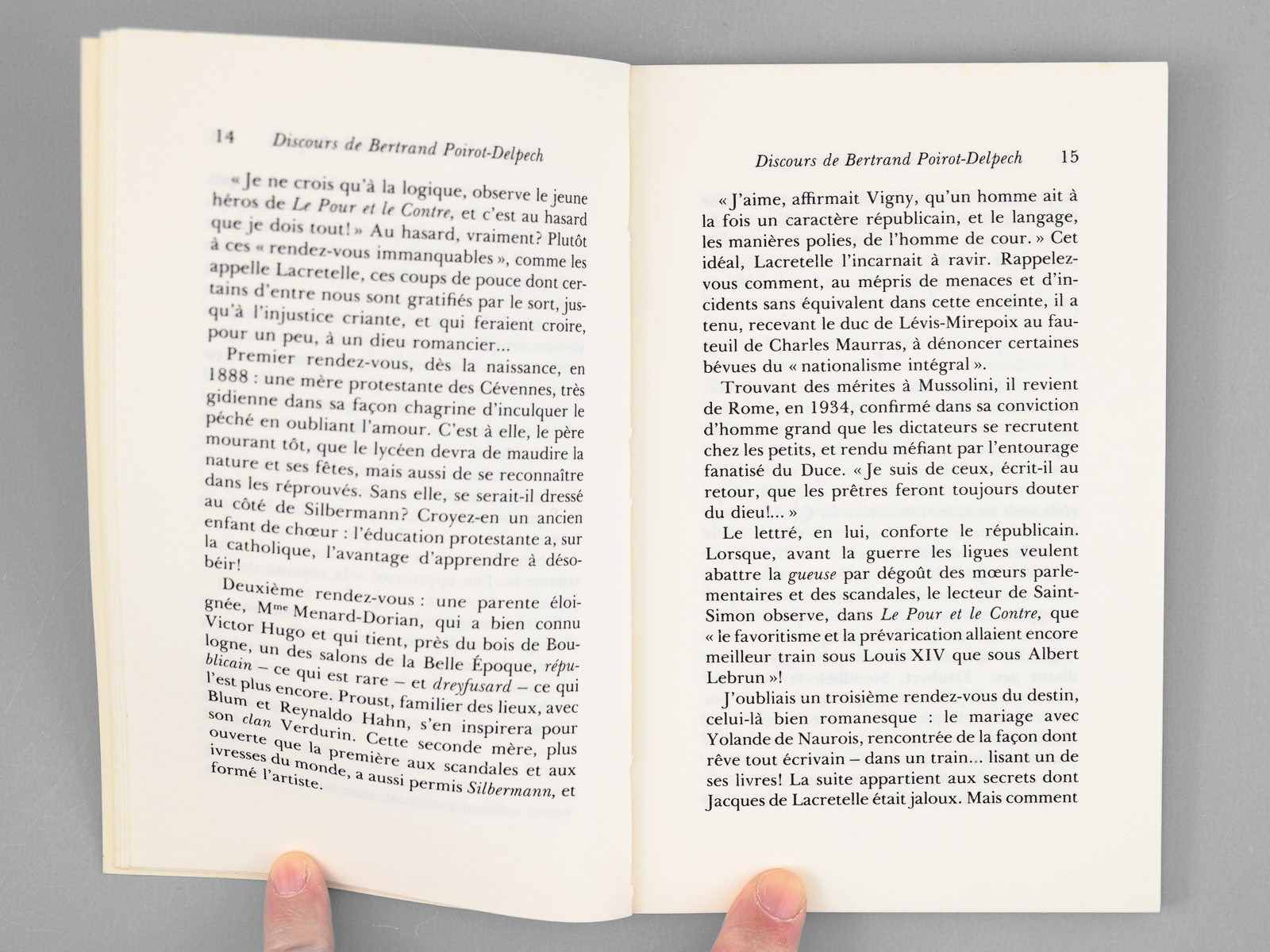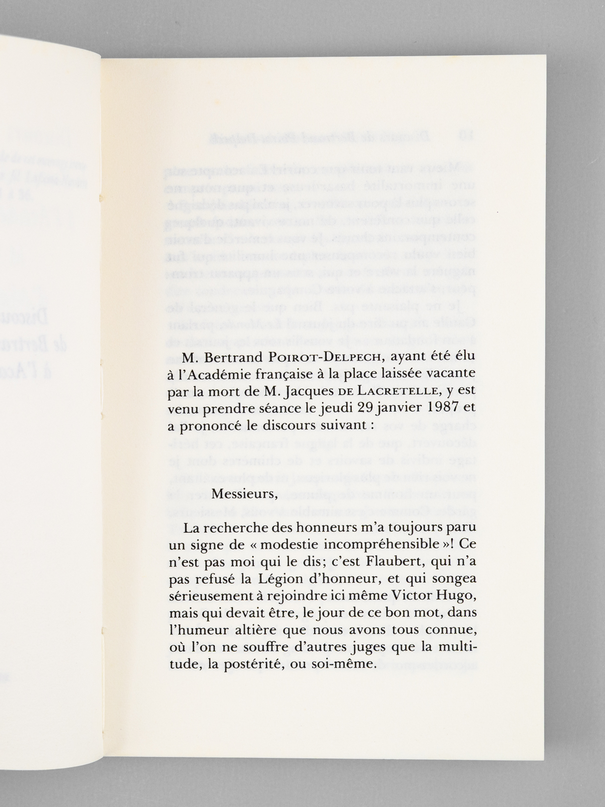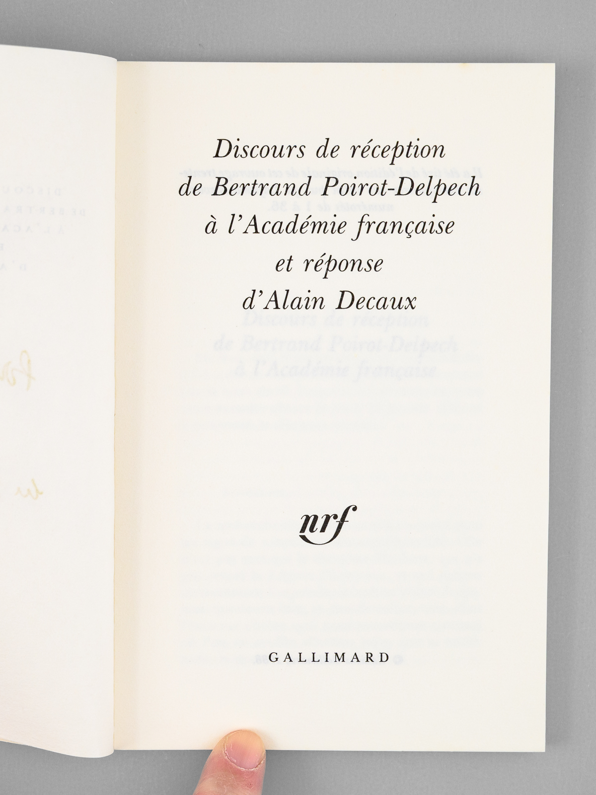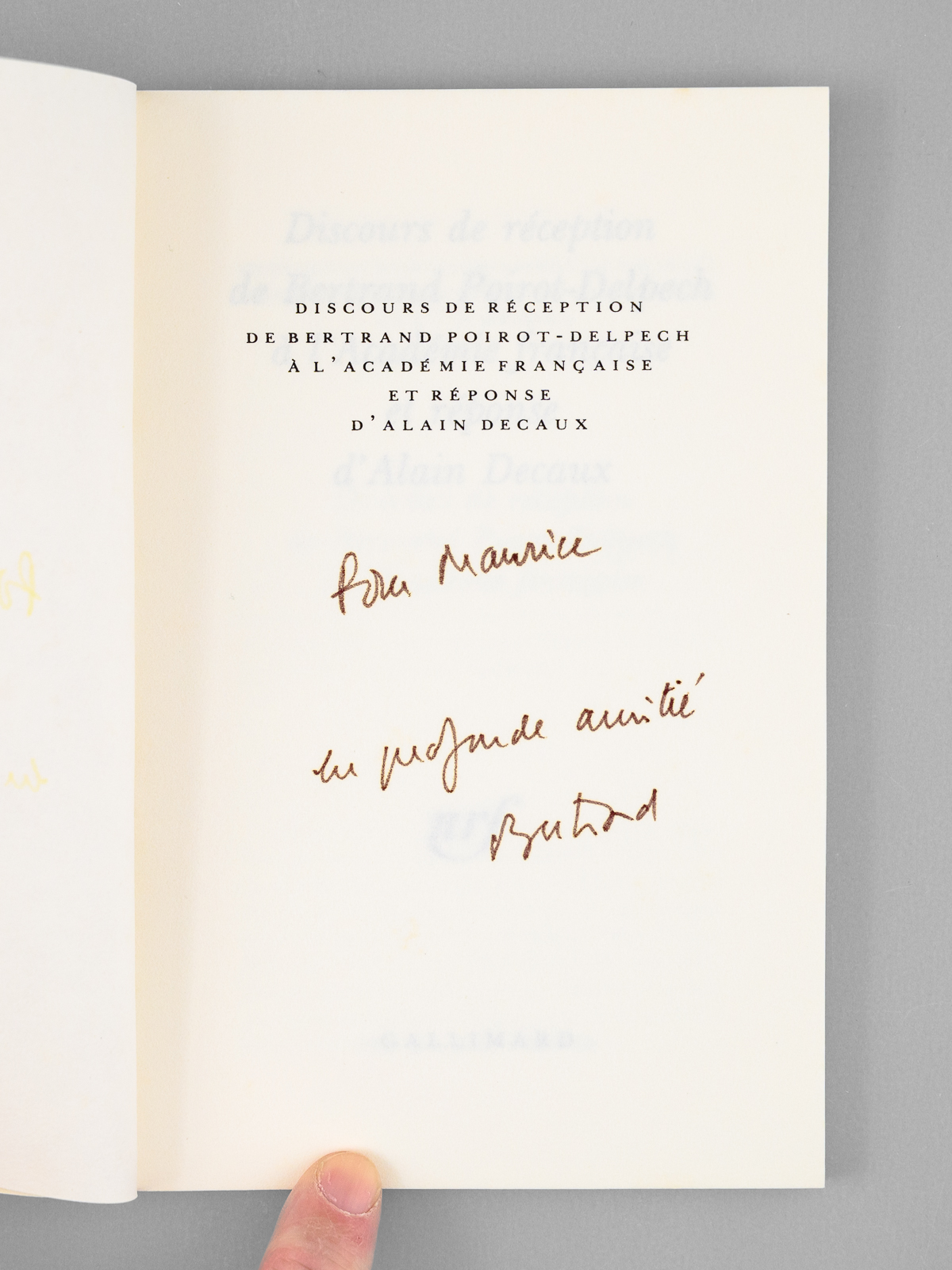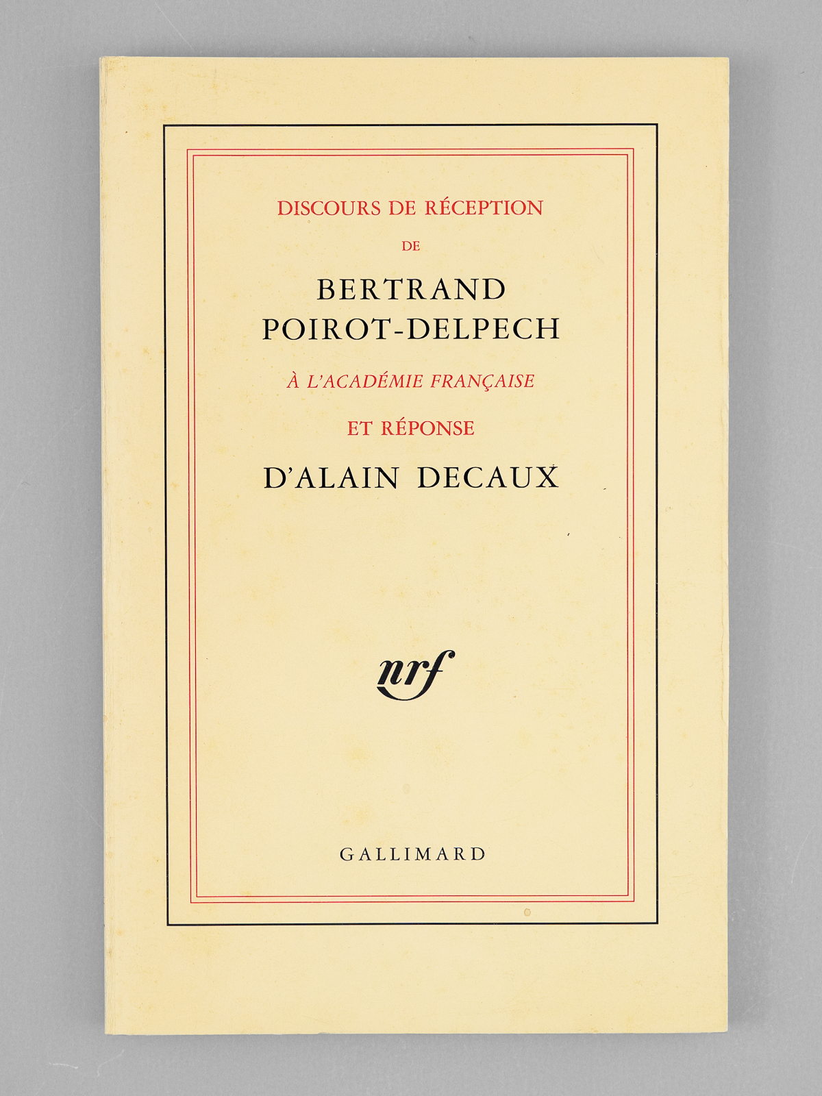 Discours de Réception de Bertrand Poirot-Delpech à l'Académie Française et réponse d'Alain Decaux [ Edition originale - Livre dédicacé par l'auteur à Maurice Druon ]