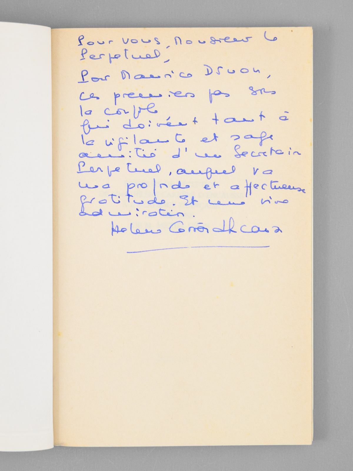 Envoi ms. de l'auteur, 1 vol. in-8 br., Fayard, Paris, 1992, 91 pp. Commentaire : Superbe envoi d'Hélène Carrère d'Encausse 'Pour vous, Monsieur le Perpétuel, pour Maurice Druon, ces premiers pas sous la coupole qui doivent tant à la vigilante et sage amitié d'un Secrétaire Perpétuel, auquel va ma profonde et affectueuse gratitude. Et une vive admiration'. Exceptionnel exemplaire de son discours de réception (dont il n'a pas été signalé de grand papier), dédicacé par Hélène Carrère d'Encausse à Maurice Druon, Secrétaire Perpétuel de l'Académie Française de 1985 à 1999, et au poste duquel elle succèdera en 1999. Bon exemplaire.