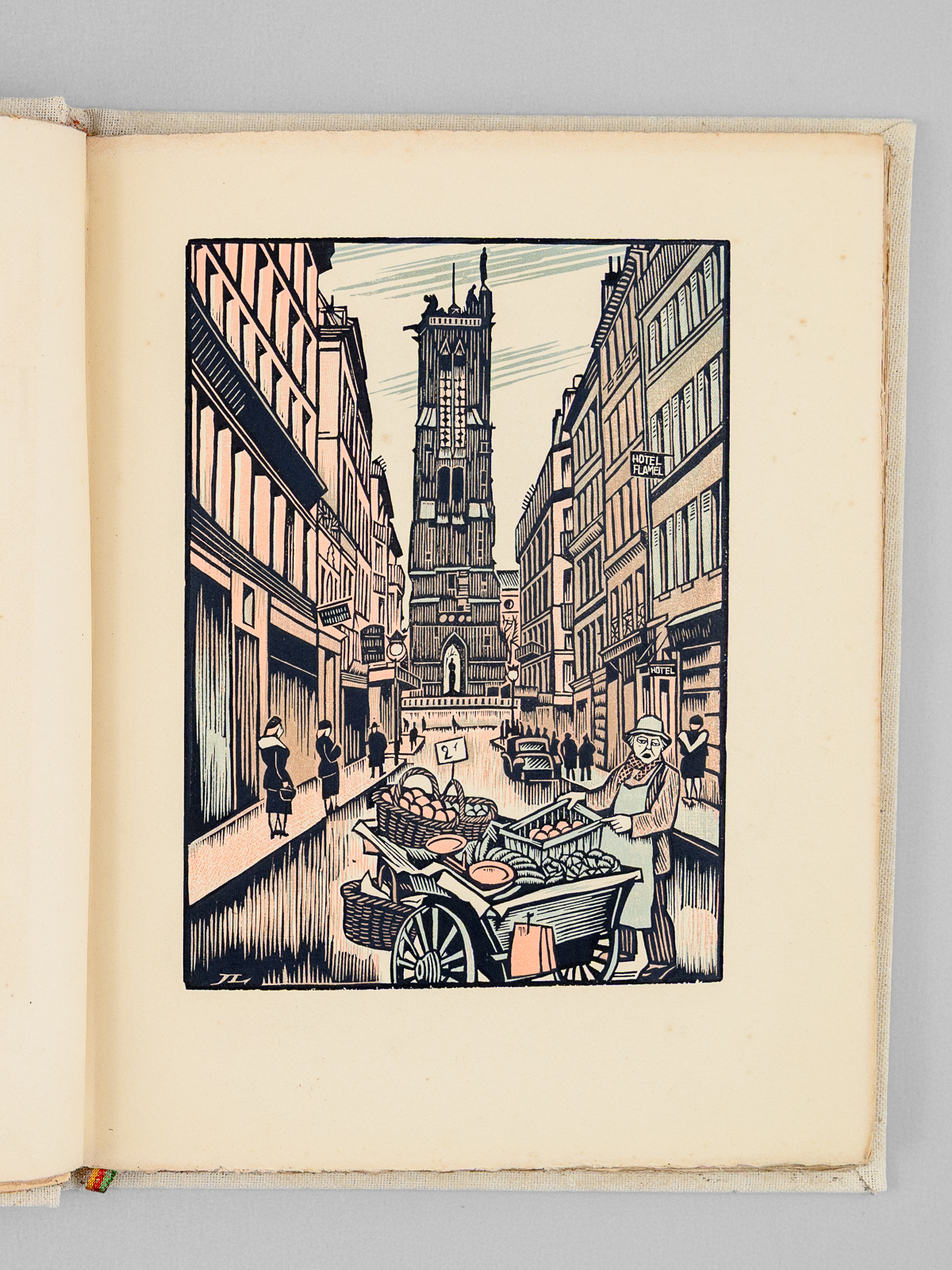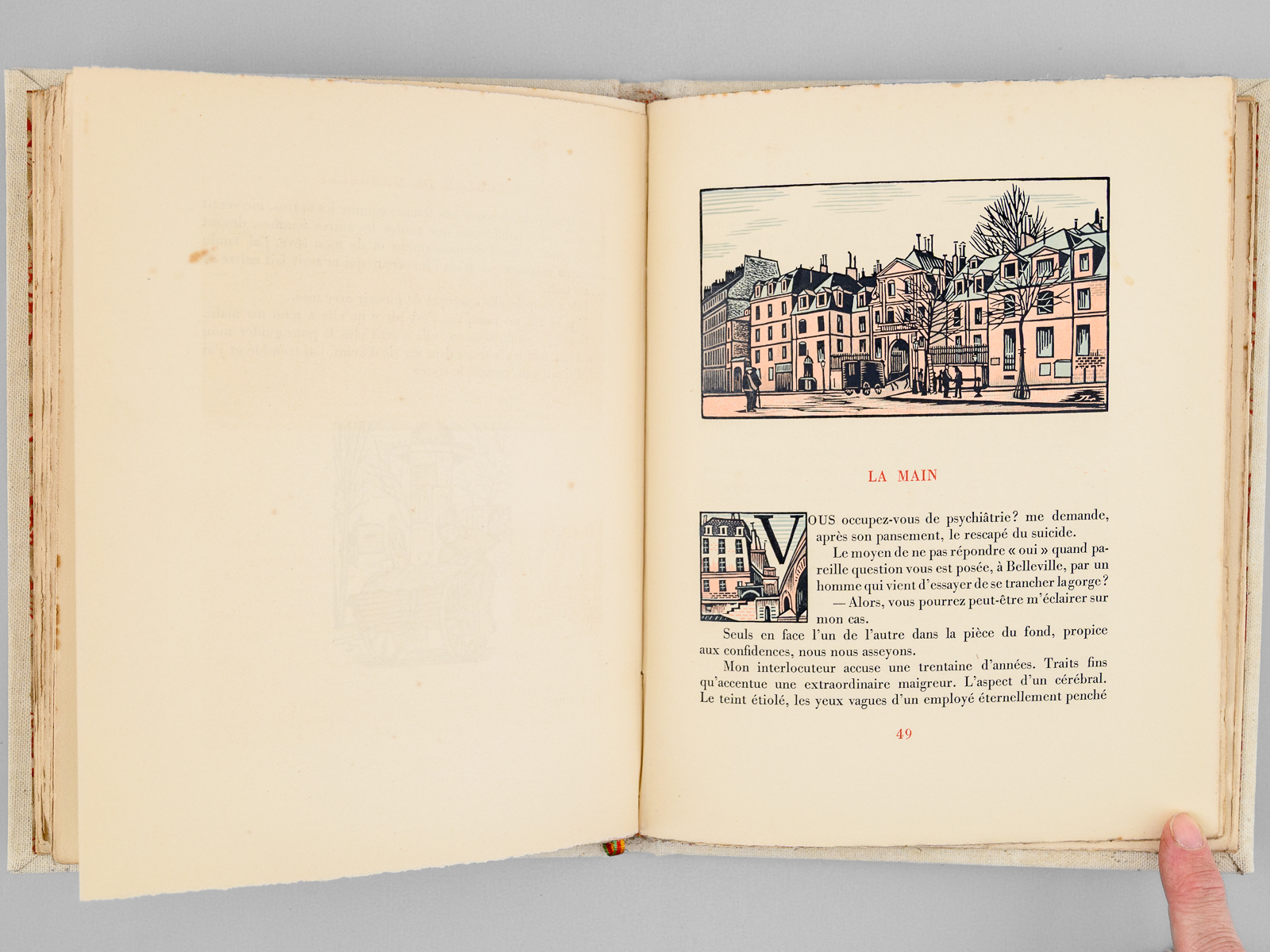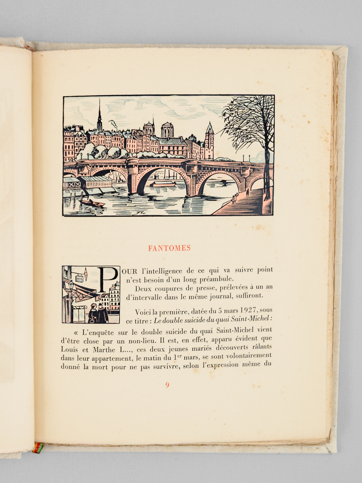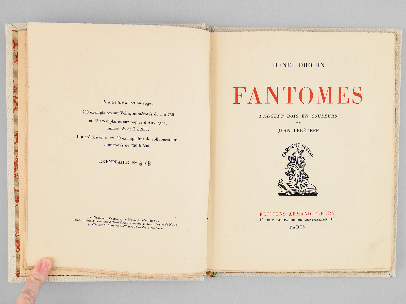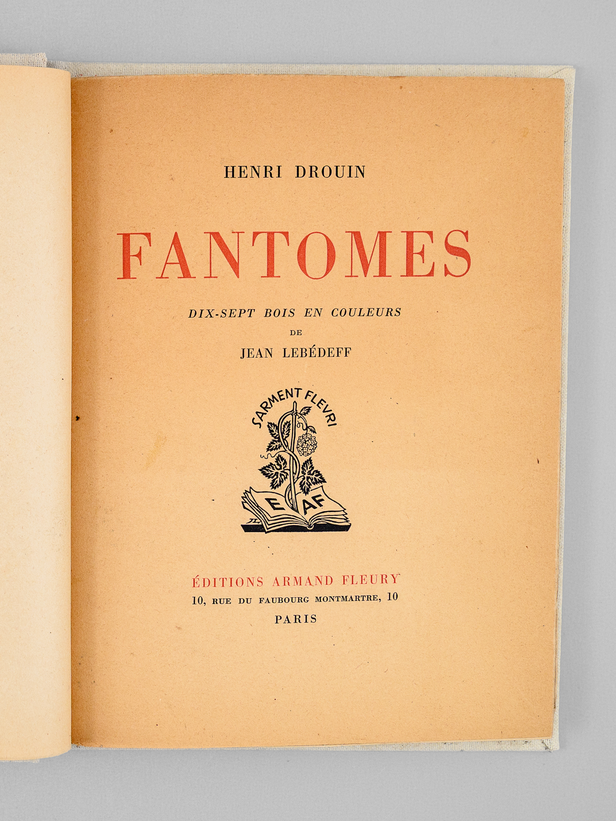 Dix-sept bois en couleurs de Jean Lebedeff, un des 750 exemplaires sur Vélin numérotés (n° 676), 1 vol. grand in-8 carré reliure pleine toile blanche, couvertures et dos conservés, Éditions Armand Fleury, Paris, s.d. [ 1945 ], 77 pp. Commentaire : Belles illustrations en couleurs de Lebedeff. Le romancier Henri Drouin fut médecin, chef de laboratoire à l'hôpital Broca. Les récits rapides et efficaces qu'il nous livre ici nous plonge dans une atmosphère très proche de celle des romans de Léo Malet. Etat très satisfaisant (petite galerie de vers en dernière garde, reliure très lég. frottée, bon exemplaire par ailleurs).