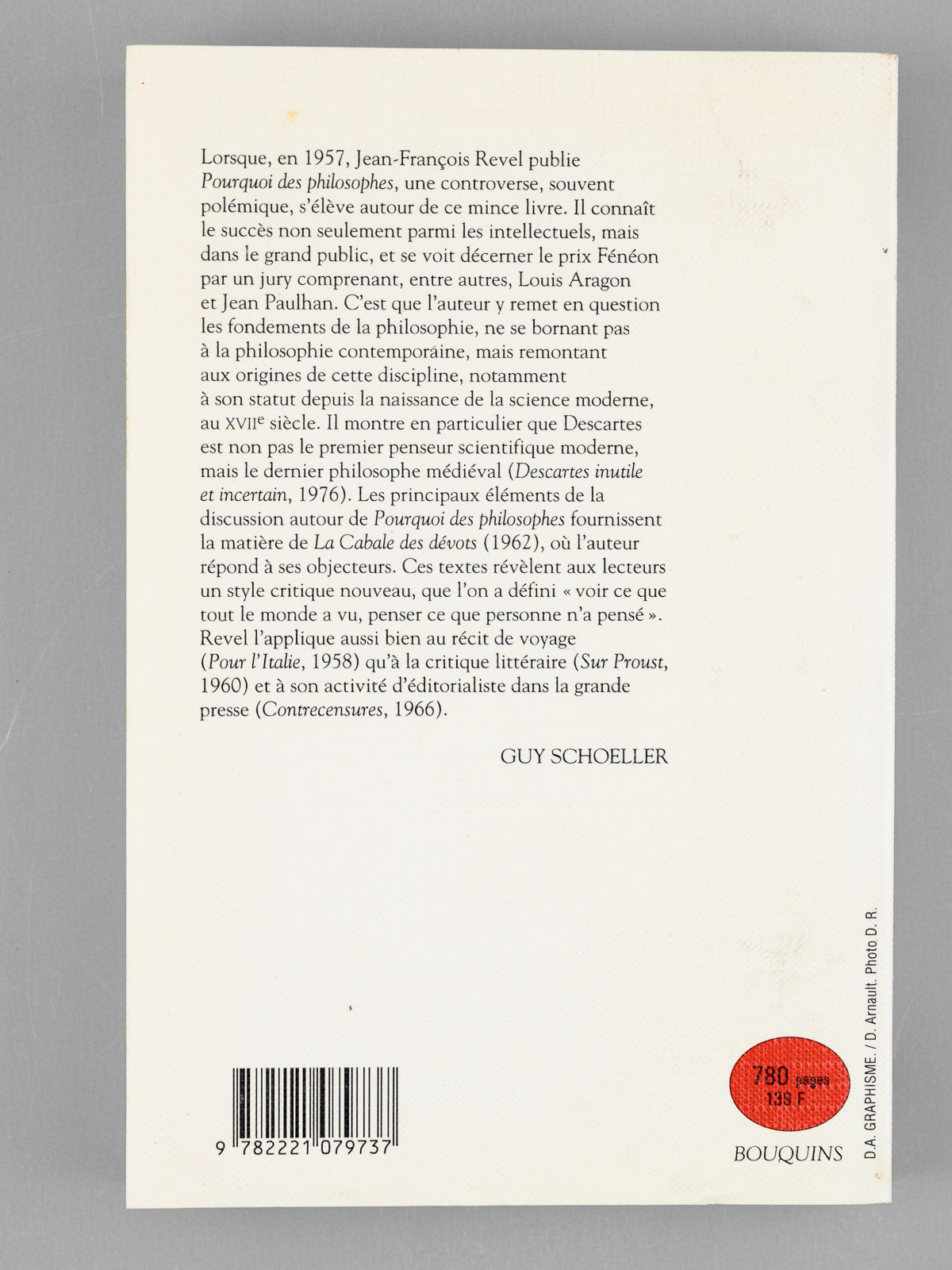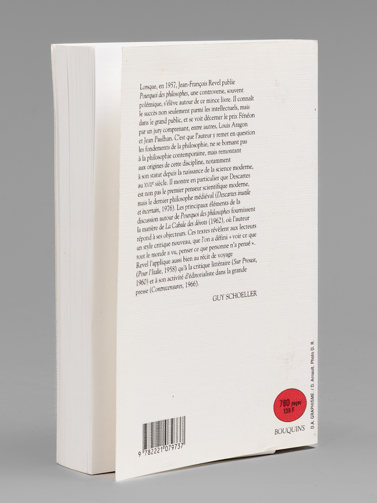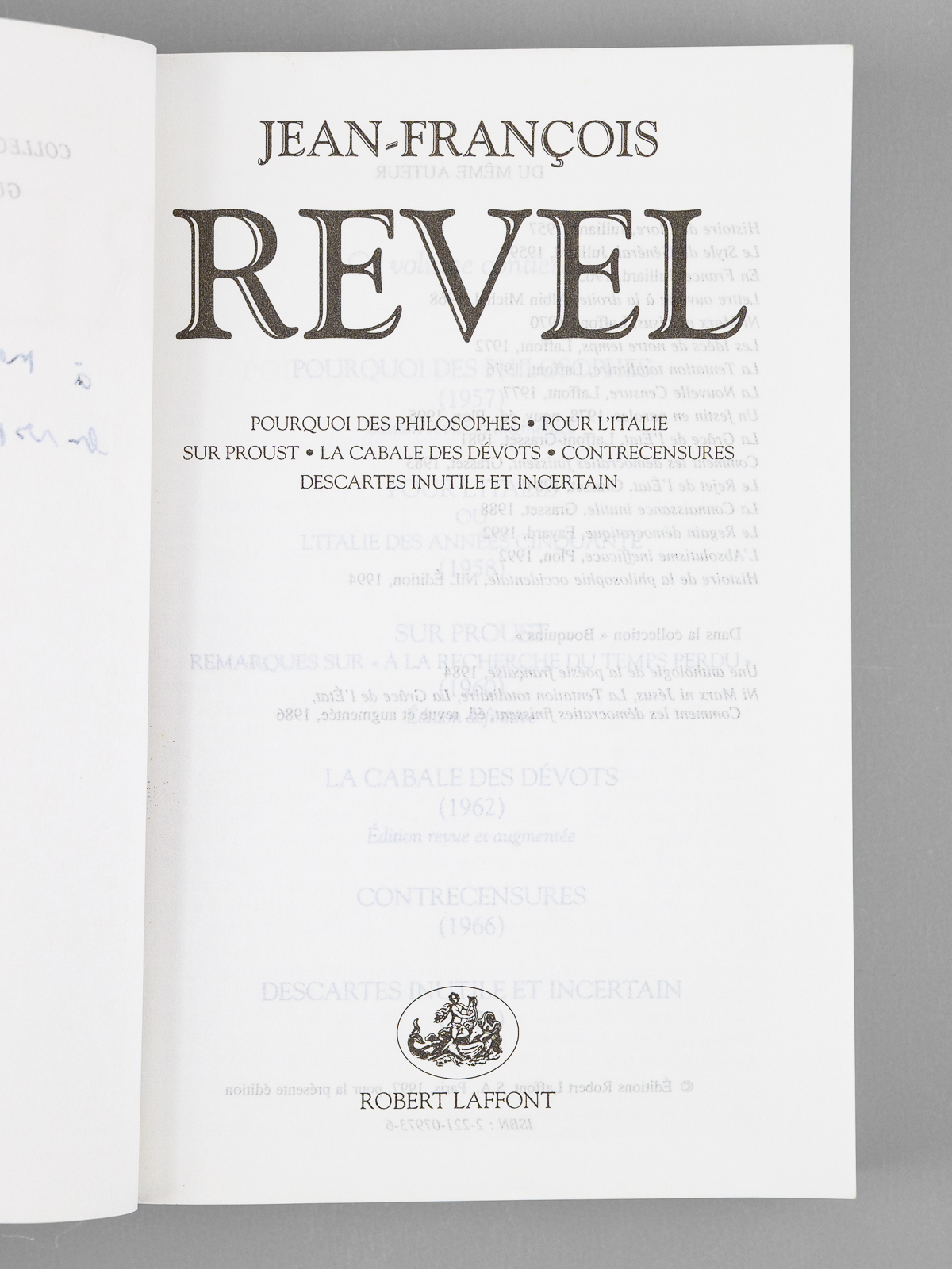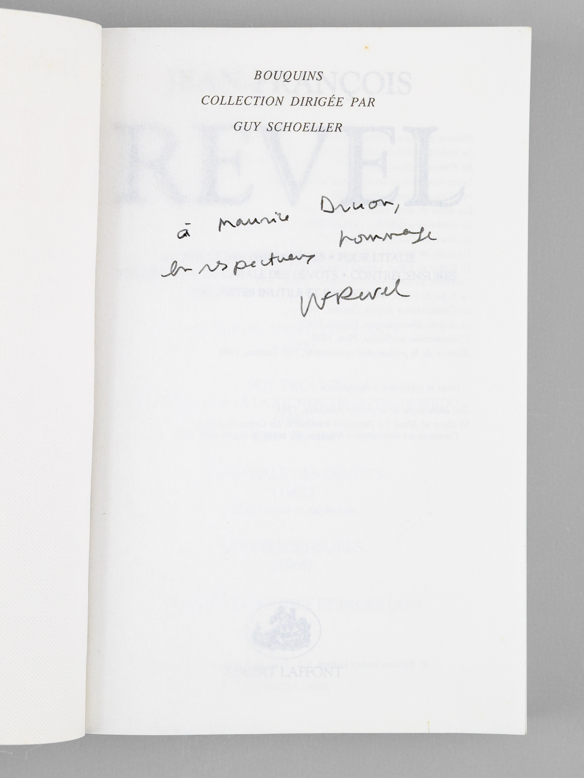 Jean-François Revel : Pourquoi des philosophes ; Pour l'Italie ; Sur Proust ; La cabale des dévots ; Contre censure ; Descartes inutile et incertain [ Livre signé par l'auteur - Envoi à Maurice Druon ]