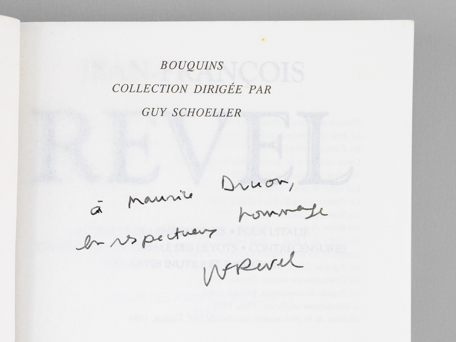 Commentaire : Envoi de l'auteur à Maurice Druon : 'À Maurice Druon, En respectueux hommage.' Etat très satisfaisant (lég. traces sur tranche sup., bon état par ailleurs). L'auteur et le dédicataire furent tous deux académiciens. Maurice Druon (1918-2009), auteur notamment de la célèbre saga historique des Rois maudits, avait été élu à l'Académie Française en 1968, et en devint le secrétaire perpétuel, de 1985 à 1999. Jean-François Revel, quant à lui, sera élu l'année de parution de cet ouvrage (en 1997).