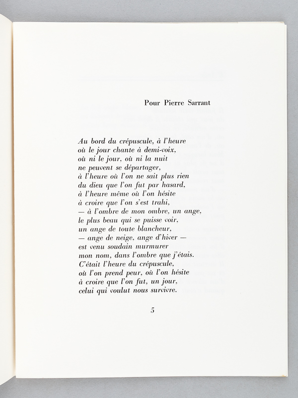Un des 500 exemplaires numérotés (n° 120), 1 vol. in-4 br., Editions Pierre Seghers, 1958, 13 pp. Commentaire : Bon exemplaire de l'édition originale, avec les belles couvertures illustrées par Louis Emié par assemblage de papiers collés.