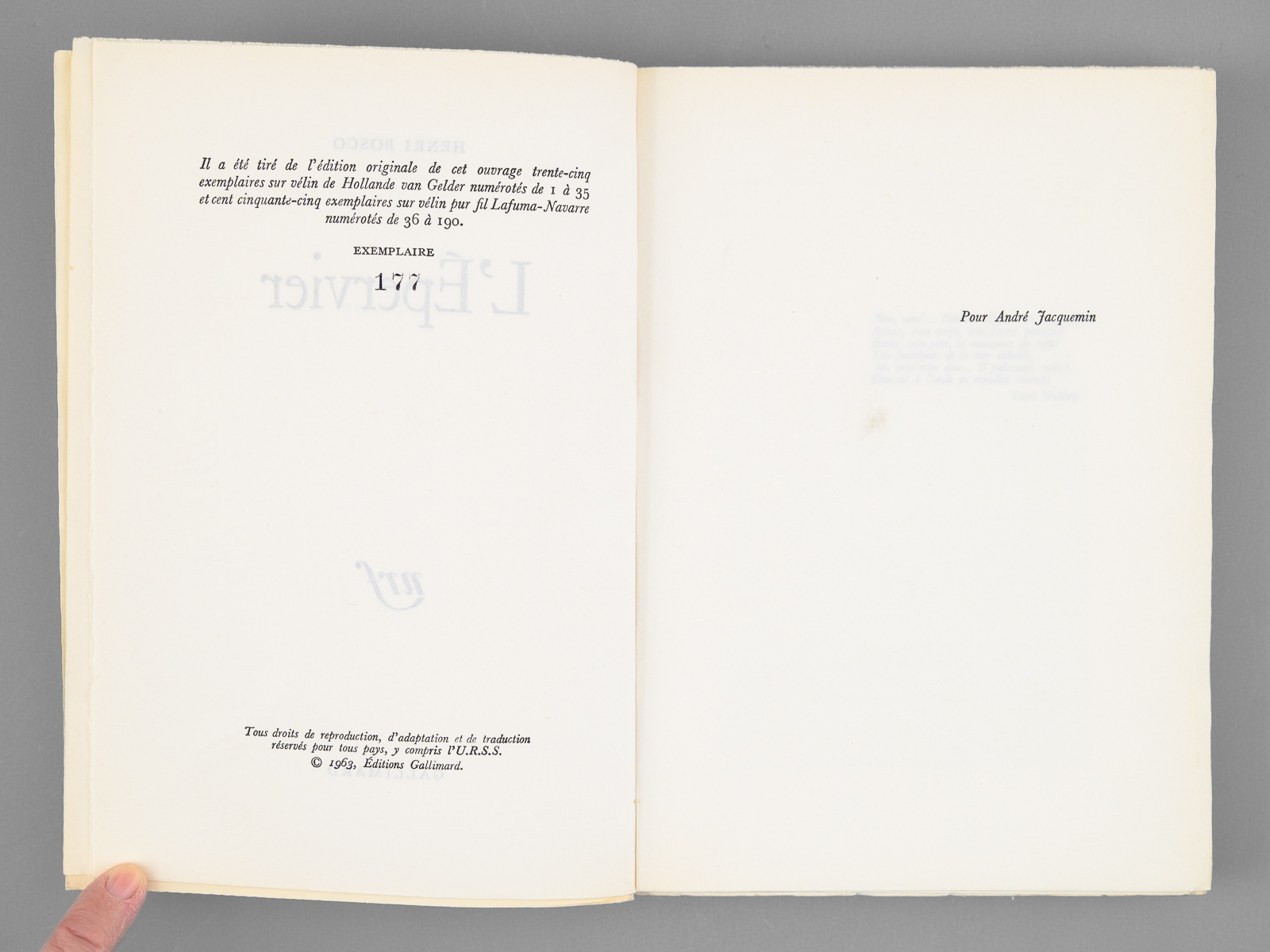 Un des 155 exemplaires sur vélin pur fil Lafum-Navarre numérotés de 36 à 190 (n° 177), 1 vol. in-8 br., Gallimard, Paris, 1963, 318 pp. Commentaire : Bon état