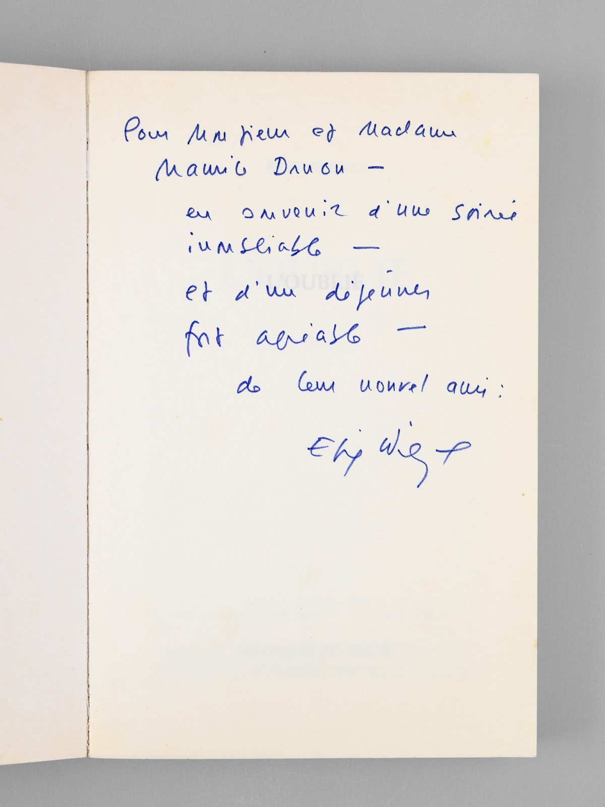 1 vol. in-8 br., aux éditions du Seuil, 1989, 317 pp. Commentaire : Envoi de l'auteur à Maurice Druon et son épouse : 'Pour Monsieur et Madame Maurice Druon, En souvenir d'une soirée inoubliable et d'un déjeuner fort agréable. De leur nouvel ami.' Etat très satisfaisant (plat sup. lég. plié, bon état par ailleurs). Maurice Druon (1918-2009), neveu de Joseph Kessel, fut résistant, écrivain auteur notamment de la saga des Rois maudits, homme politique. Elu à l'Académie Française en 1968, il en devint le Secrétaire Perpétuel en 1985.