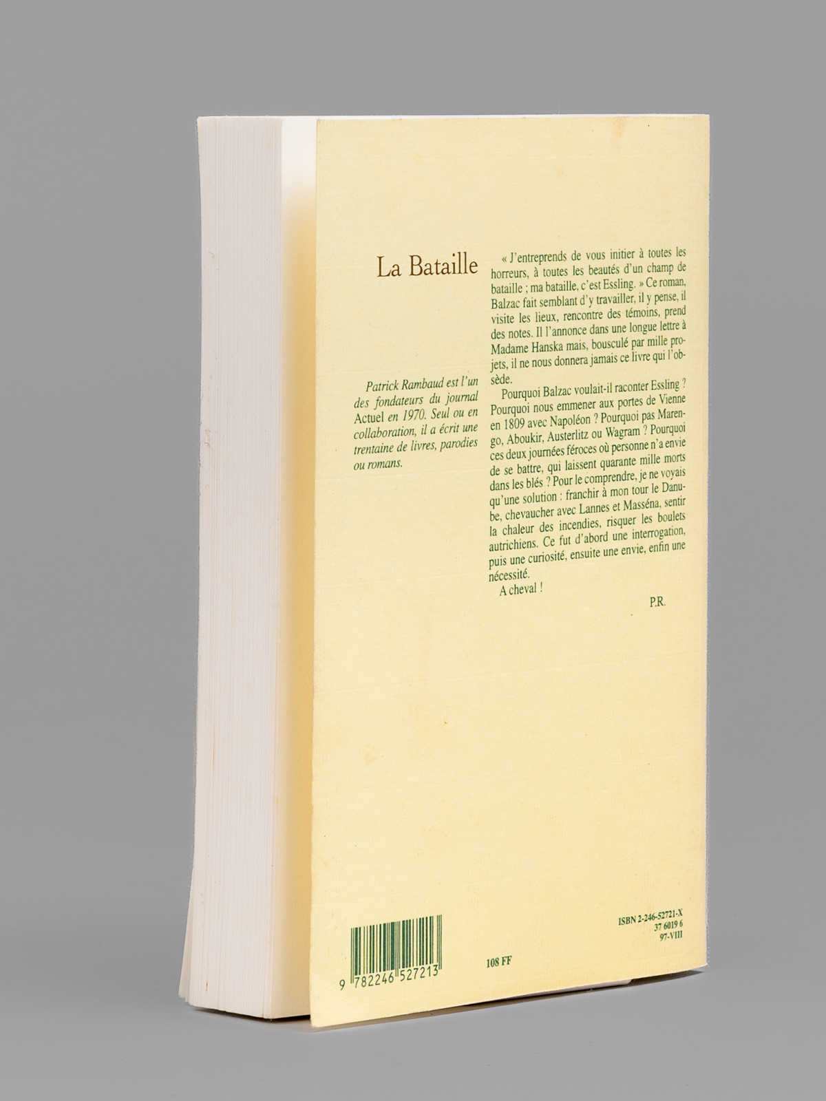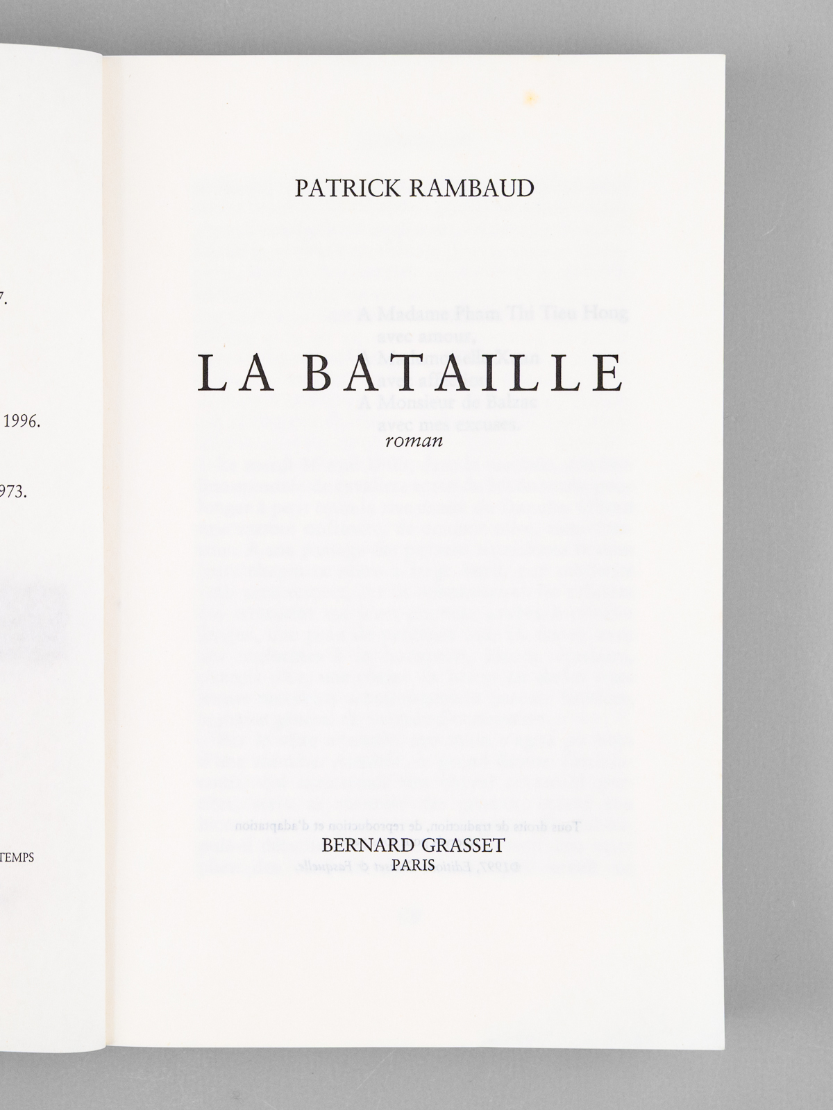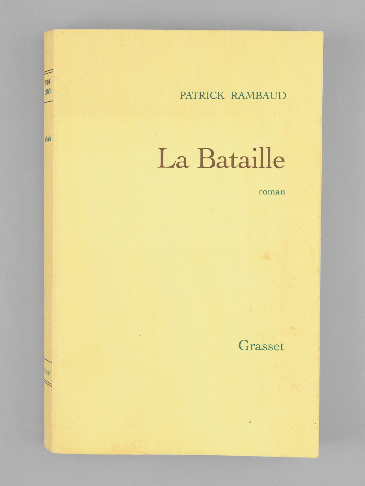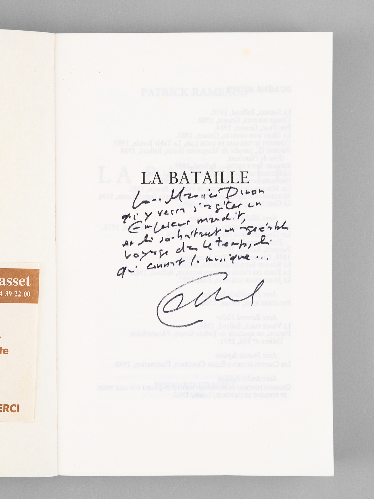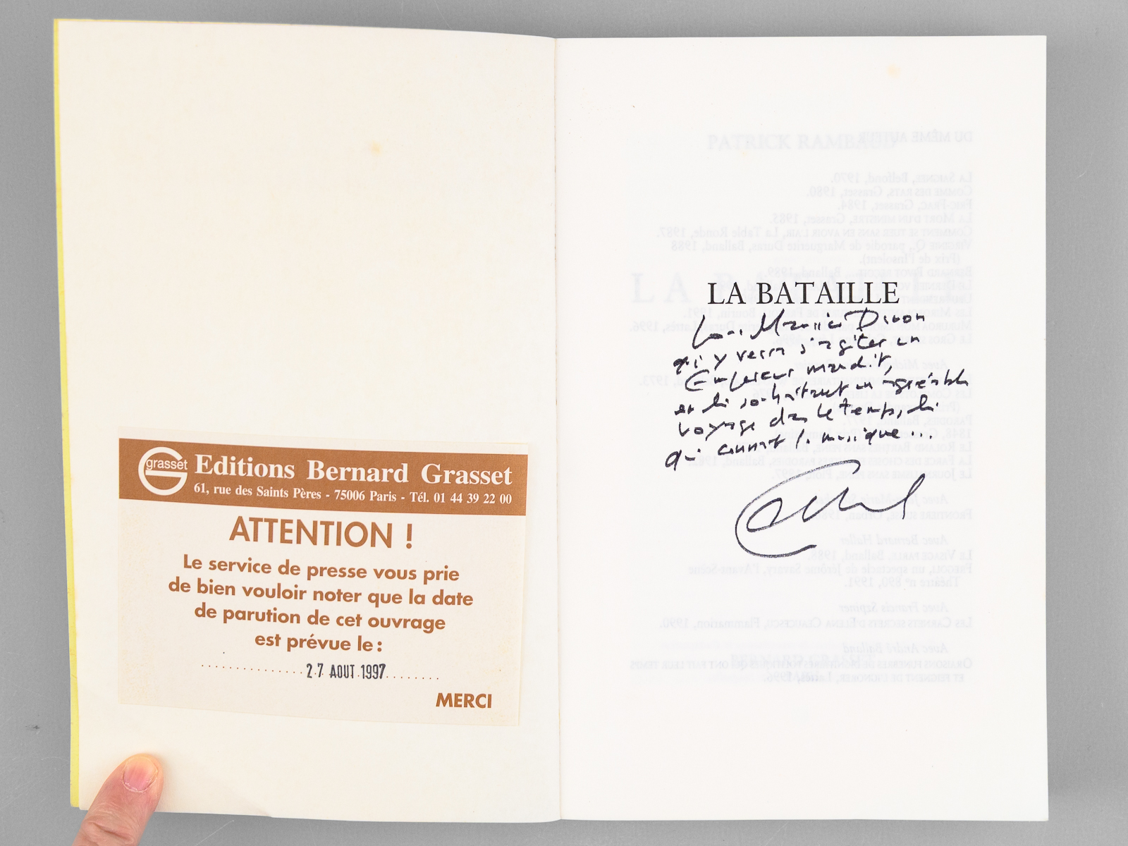 Commentaire : Bel envoi de Patrick Rambaud : 'Pour Maurice Druon qui y verra s'agiter un Empereur maudit, en lui souhaitant un agréable voyage dans le temps, lui qui connaît la musique...'. Remarquable exemplaire provenant de la bibliothèque de Maurice Druon, Secrétaire Perpétuel de l'Académie Française de 1985 à 1999. Etat très satisfaisant (couv. un peu frottée). Une étiquette du service de presse des éditions Bernard Grasset attire l'attention en garde volante sur la date prévue de sortie de l'ouvrage. 'La Bataille' obtiendra la même année le Prix Goncourt et le Grand prix du roman de l'Académie française.