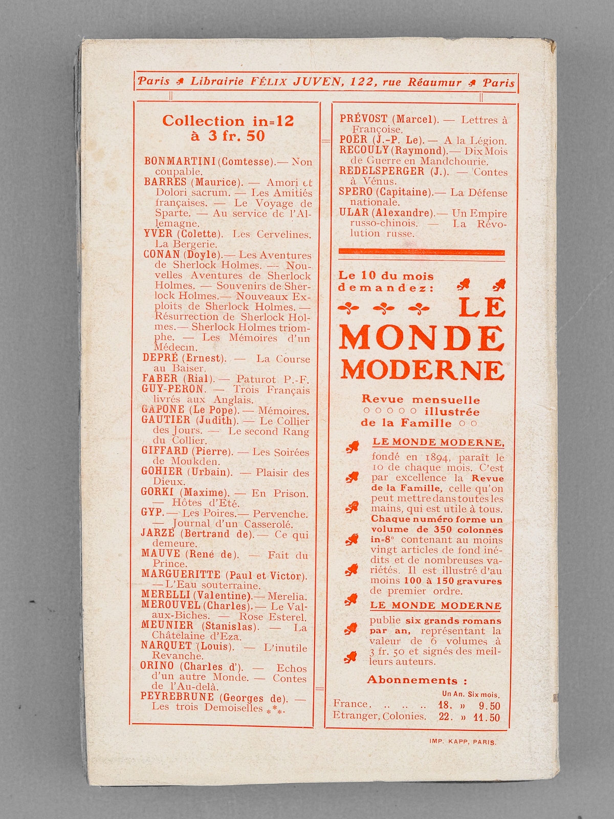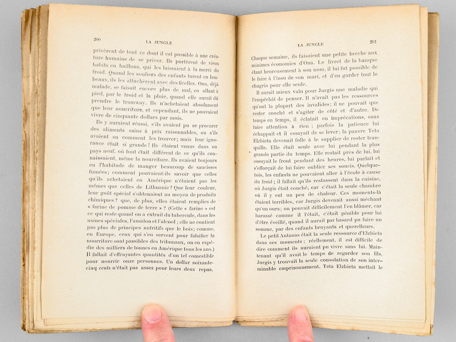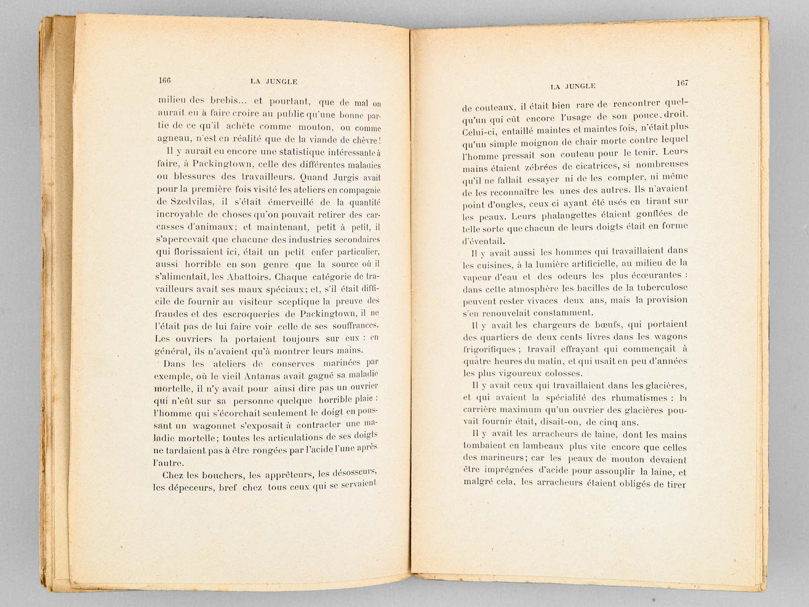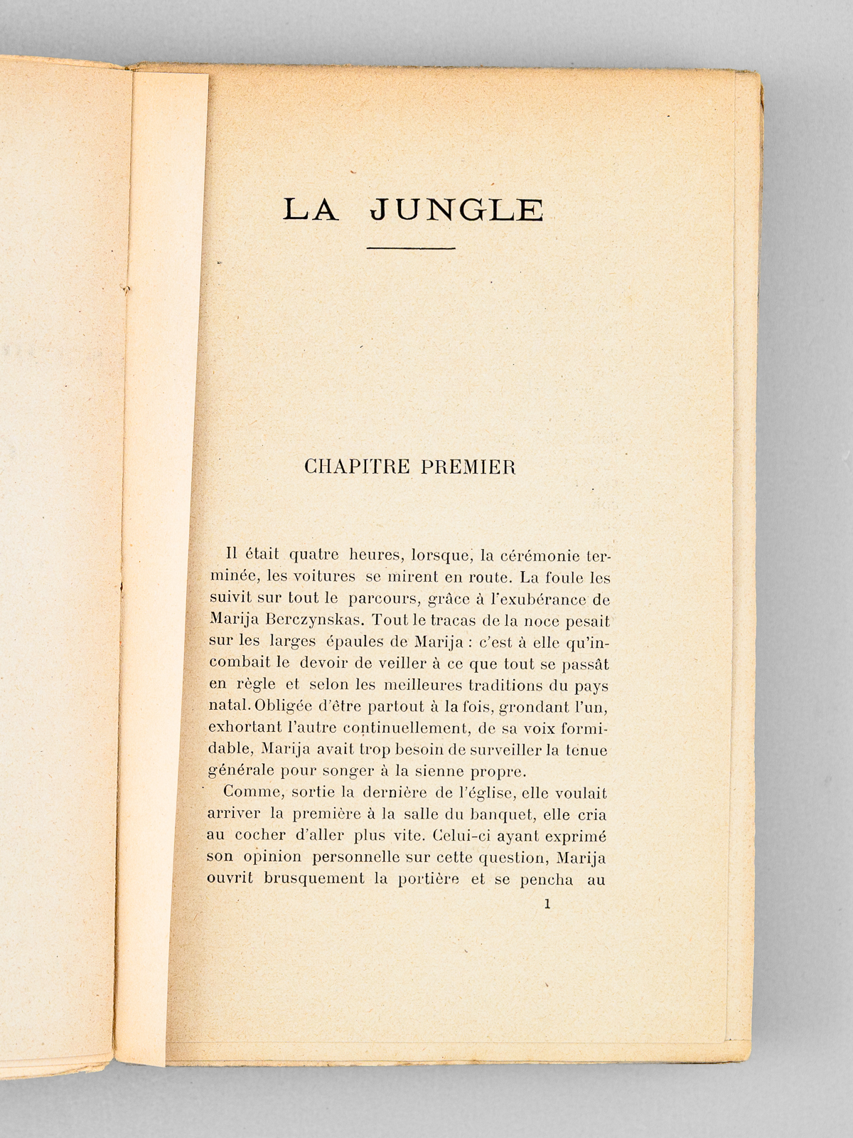E.O. de la traduction, traduit de l'anglais par A. Fournier, Société d'Édition et de Publications, Librairie Félix Juven, Paris, s.d. (1906), 537 pp. Commentaire : Bon état (couv. lég. frottée, petite manque en bas de dos, très bon état par ailleurs) pour ce rare exemplaire de l'édition originale française du roman qui apporta la célébrité à l'écrivain Upton Sinclair. Dans ce livre, Sinclair raconte le drame d'une famille d'immigrants venus de Lituanie, confrontés aux pratiques des abattoirs de Chicago. Cet ouvrage, en mettant en lumière les pratiques de ces abattoirs, suscita le création d'une commission d'enquête fédérale (la commission Neill-Reynolds), qui aboutit à la loi dite FMIA (Federal Meat Inspection Act) de 1906. Cette loi permit enfin de commencer à combattre les pratiques mafieuses de la Meat Packing Industry de Chicago et d'ailleurs.