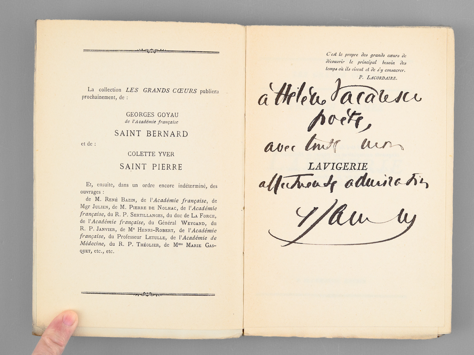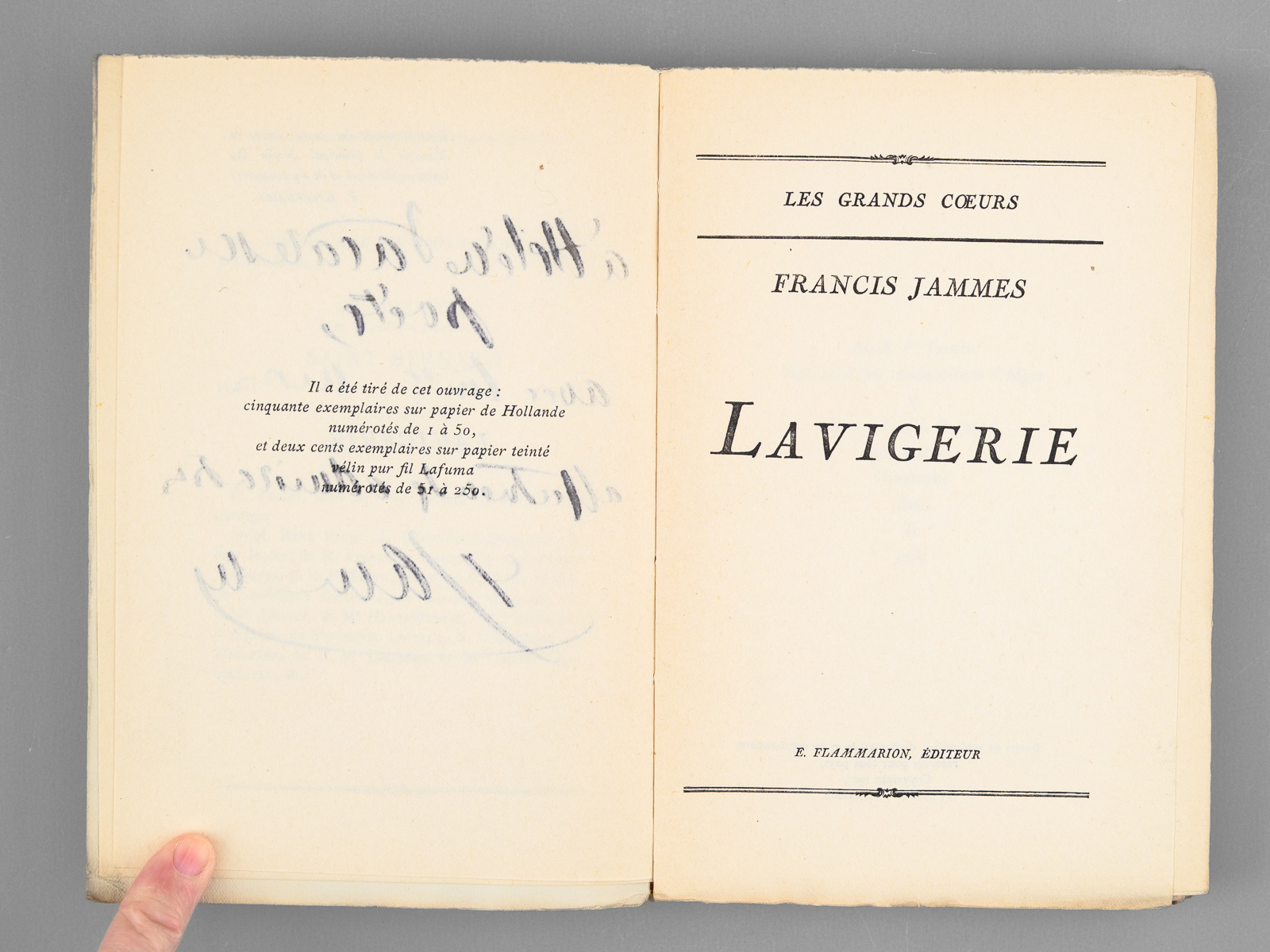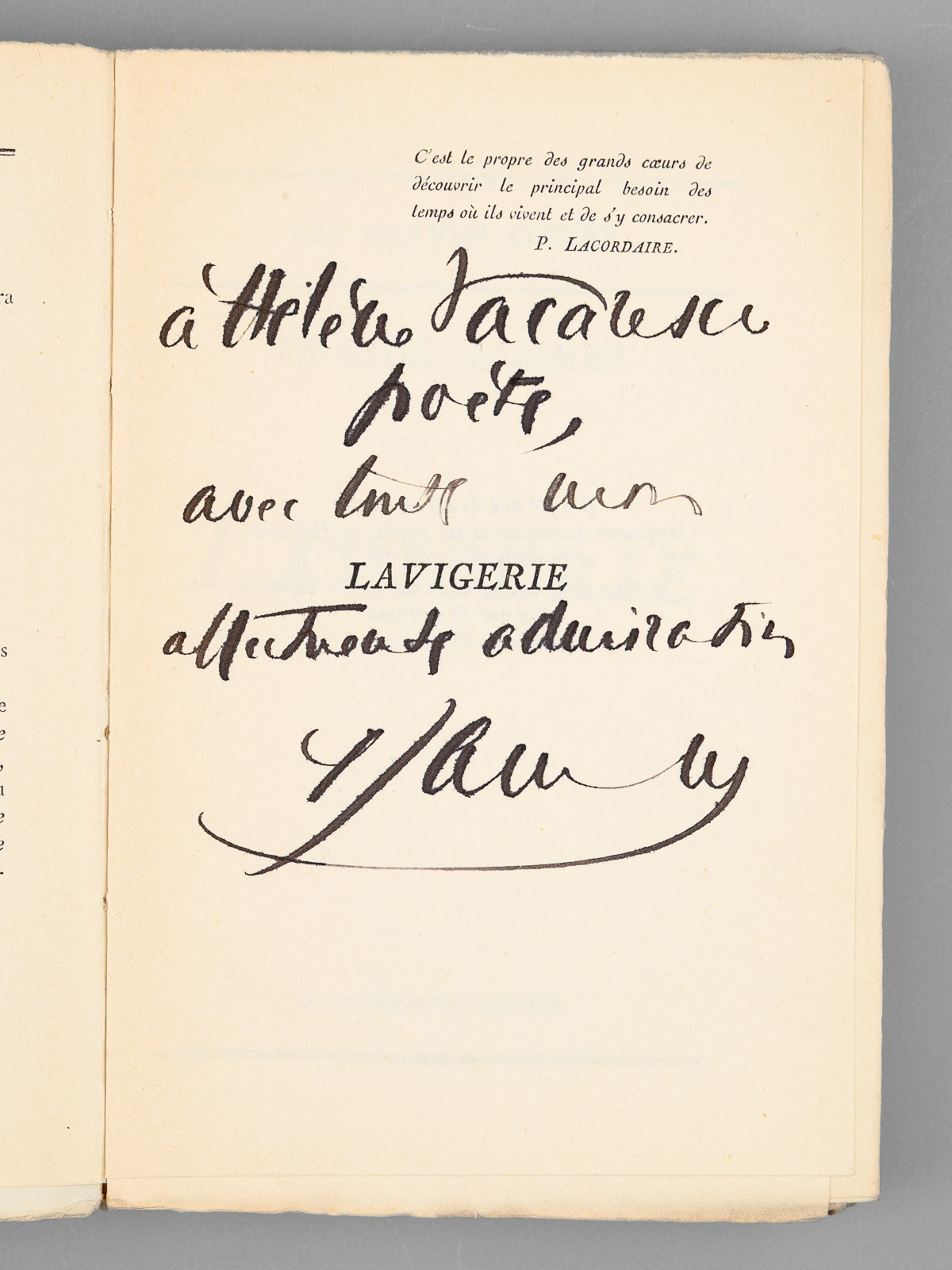 Commentaire : Bel envoi de Francis Jammes 'à Hélène Vacarescu poète avec toute mon affectueuse admiration'. Femme de lettres et diplomate, Hélène Vacaresco (1864-1947) fut deux fois lauréate de l'Académie française dans l'année 1925. Bon état (couv. un peu frottée)