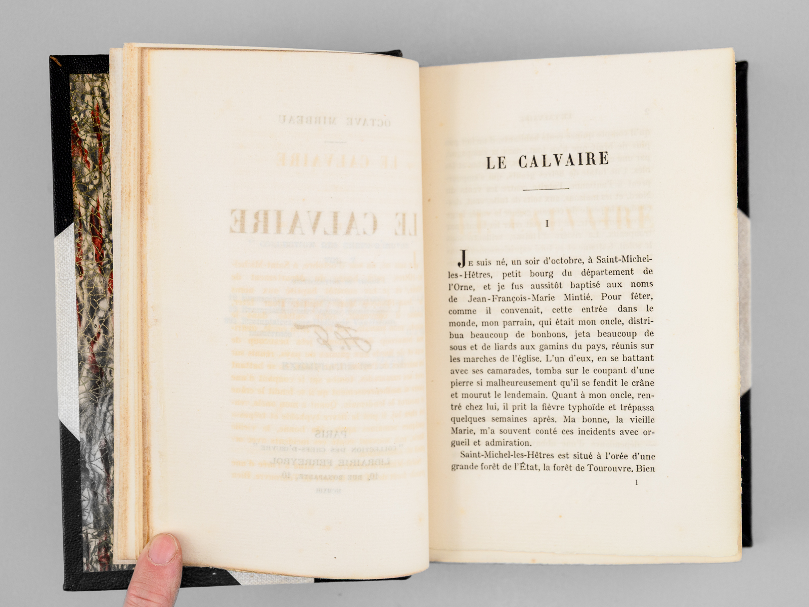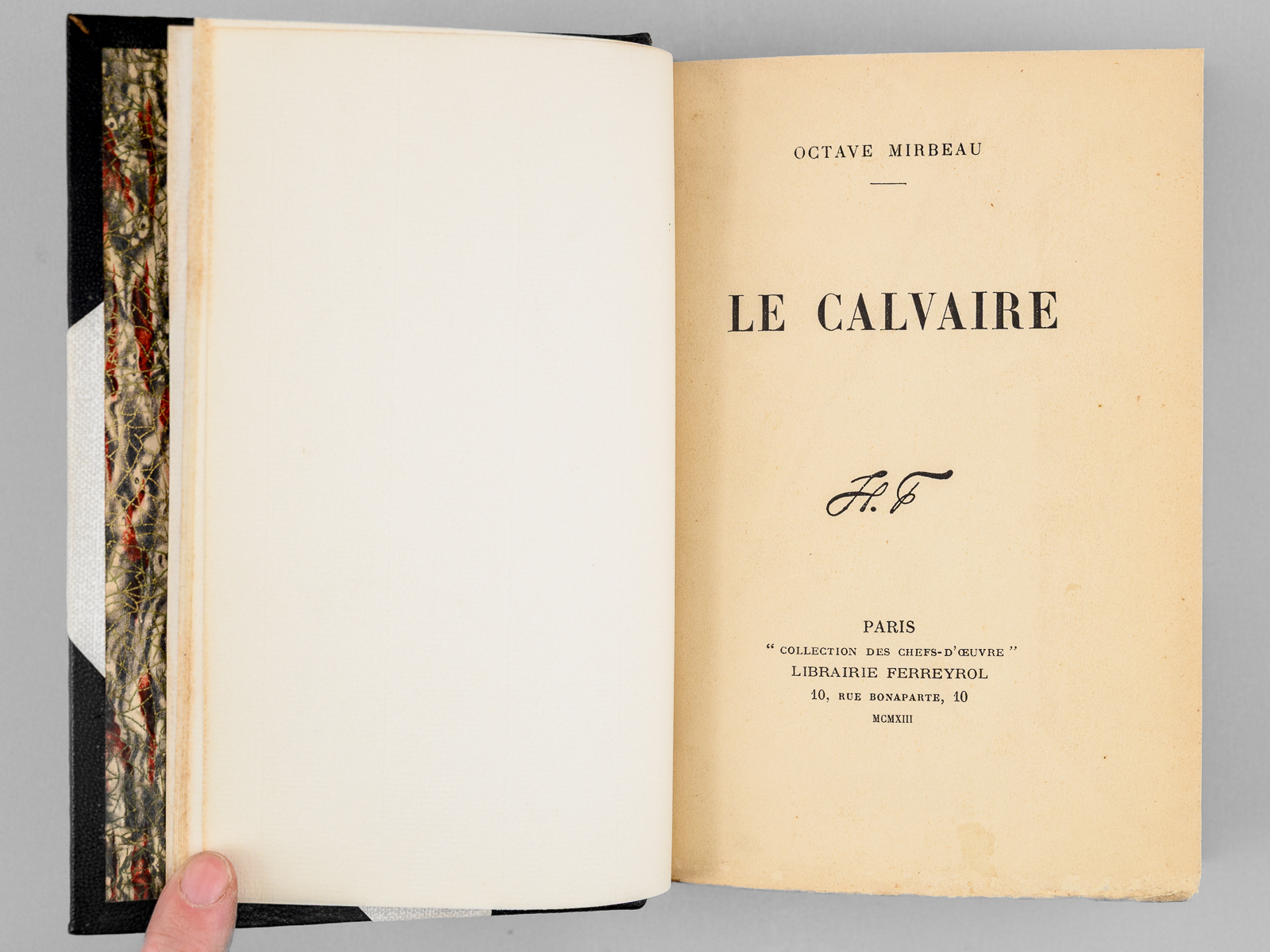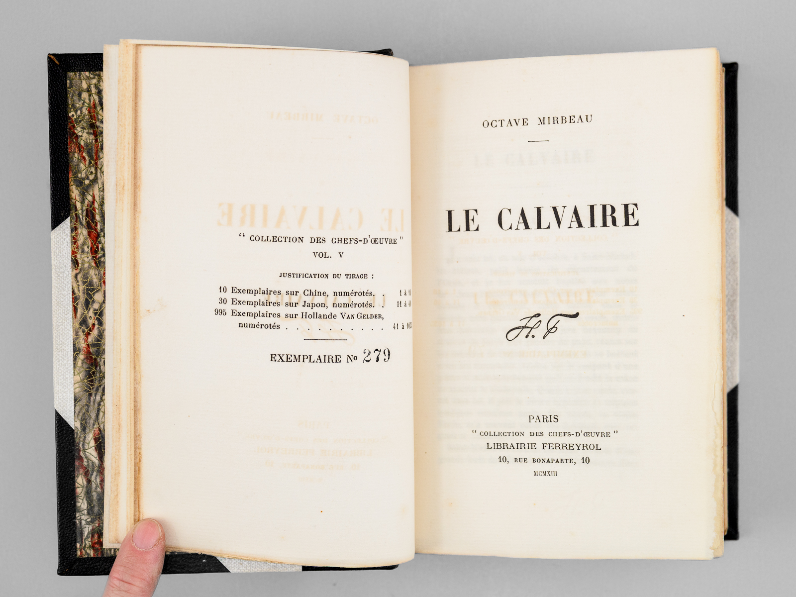 Un des 995 exemplaires sur Hollande Van Gelder (exemplaire n°279), 1 vol. petit in-8 reliure postérieure demi-chagrin à coins noir, dos à 4 nerfs orné, couverture et dos conservés, Collection des Chefs-d'oeuvre, Librairie Ferreyrol, Paris, 1913, 2 ff., 354 pp. Commentaire : Dans ce roman largement autobiographique, Octave Mirbeau dénonce la passion déréglée, menant à la déchéance morale et créatrice. Bon exemplaire