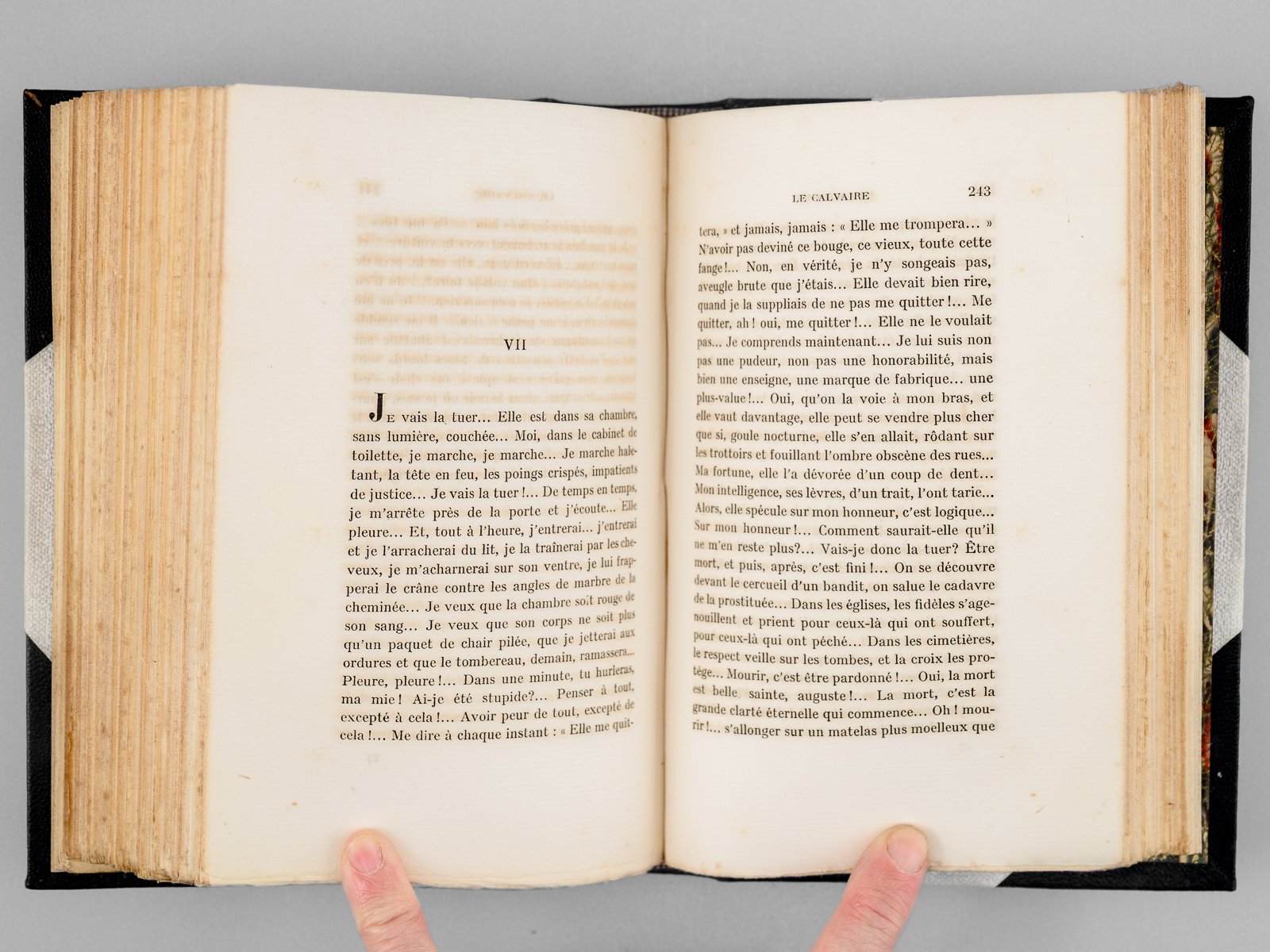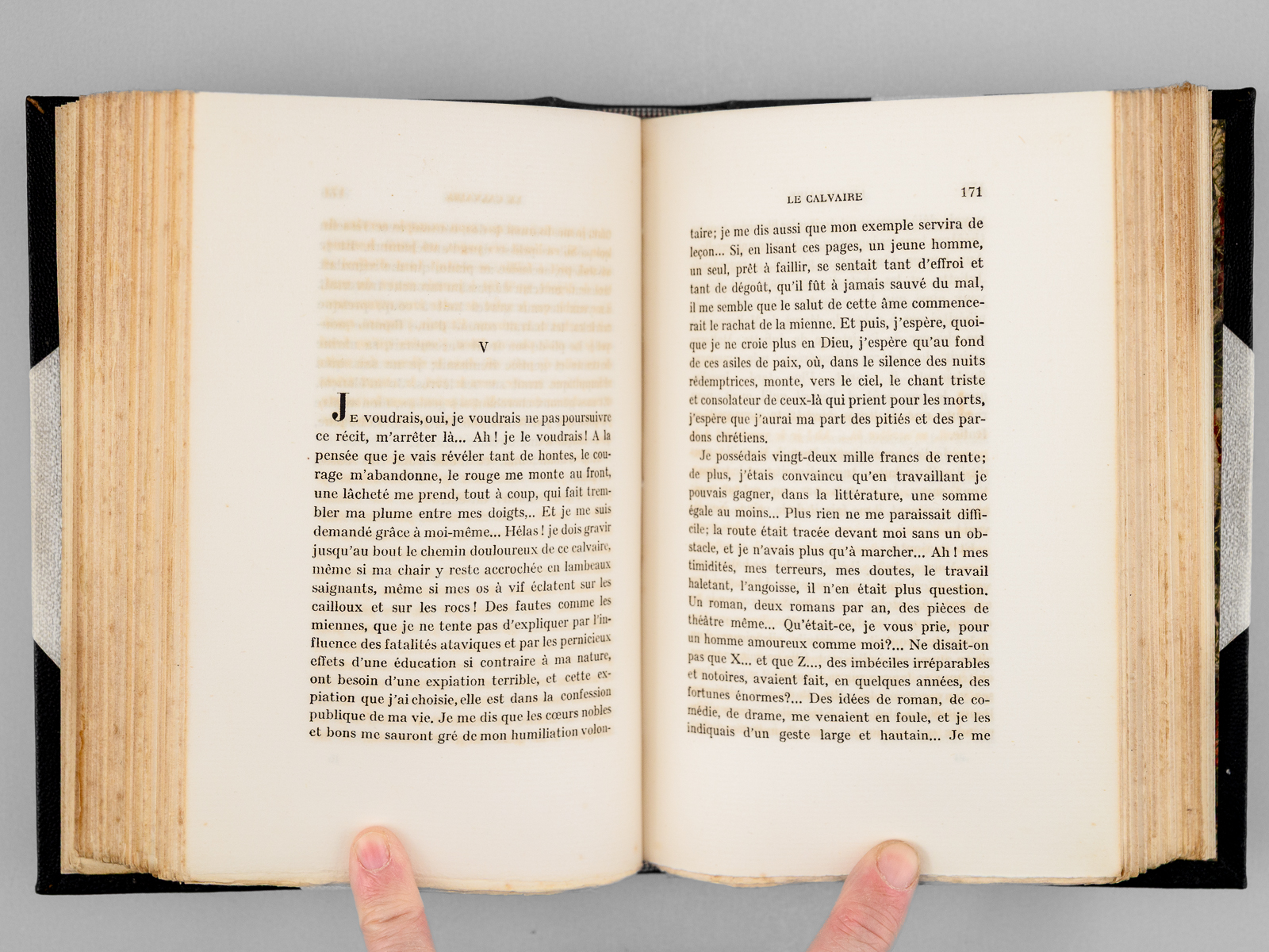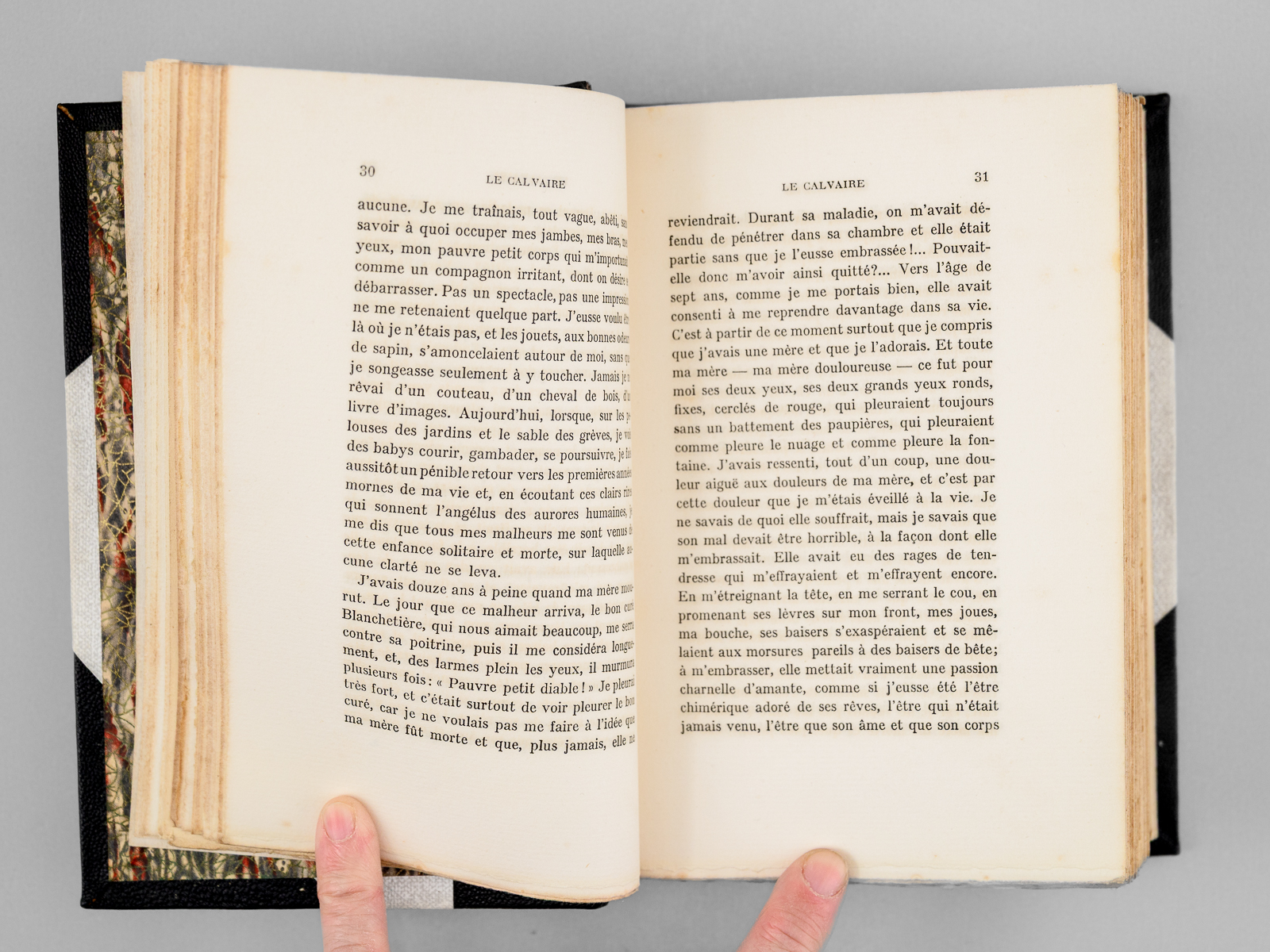 Un des 995 exemplaires sur Hollande Van Gelder (exemplaire n°279), 1 vol. petit in-8 reliure postérieure demi-chagrin à coins noir, dos à 4 nerfs orné, couverture et dos conservés, Collection des Chefs-d'oeuvre, Librairie Ferreyrol, Paris, 1913, 2 ff., 354 pp. Commentaire : Dans ce roman largement autobiographique, Octave Mirbeau dénonce la passion déréglée, menant à la déchéance morale et créatrice. Bon exemplaire