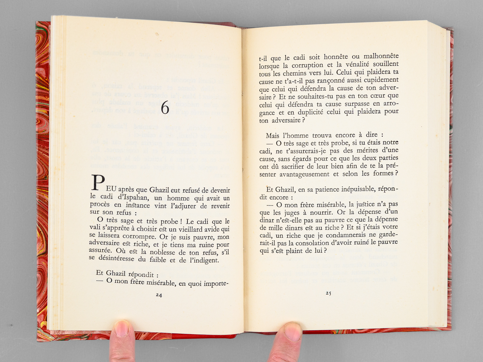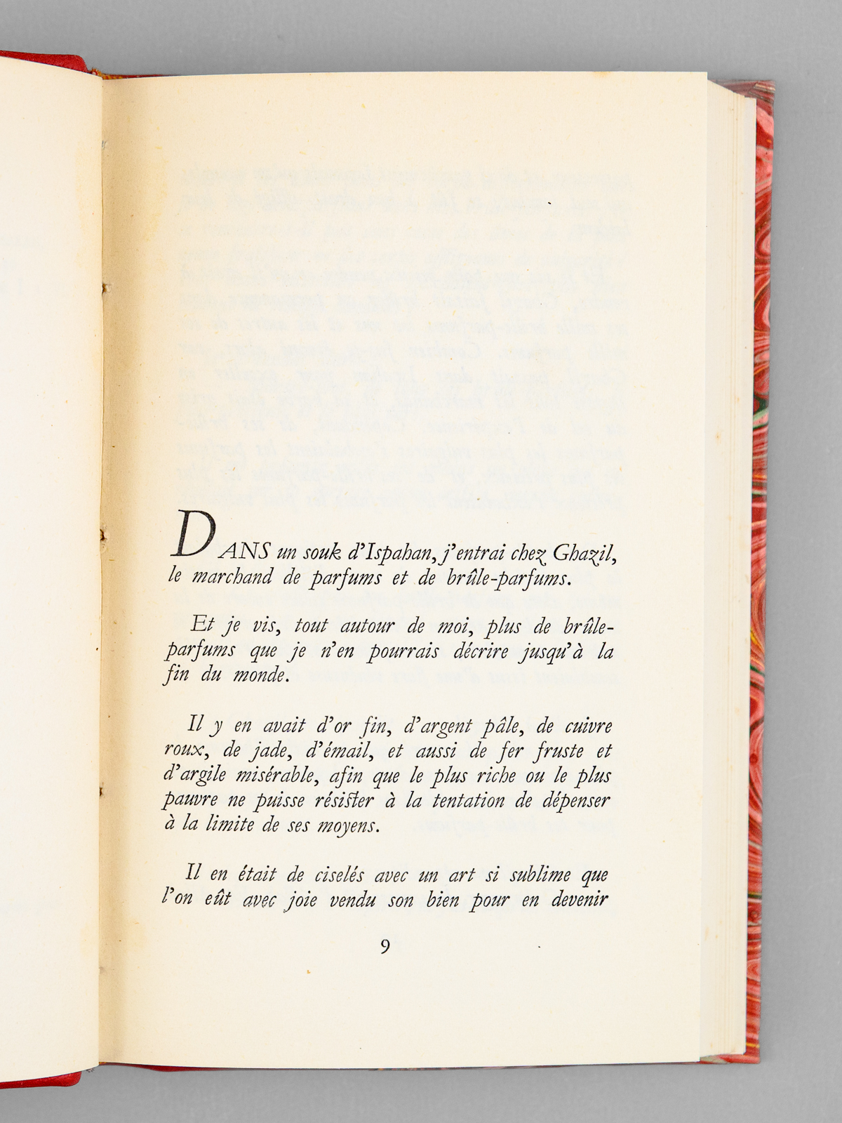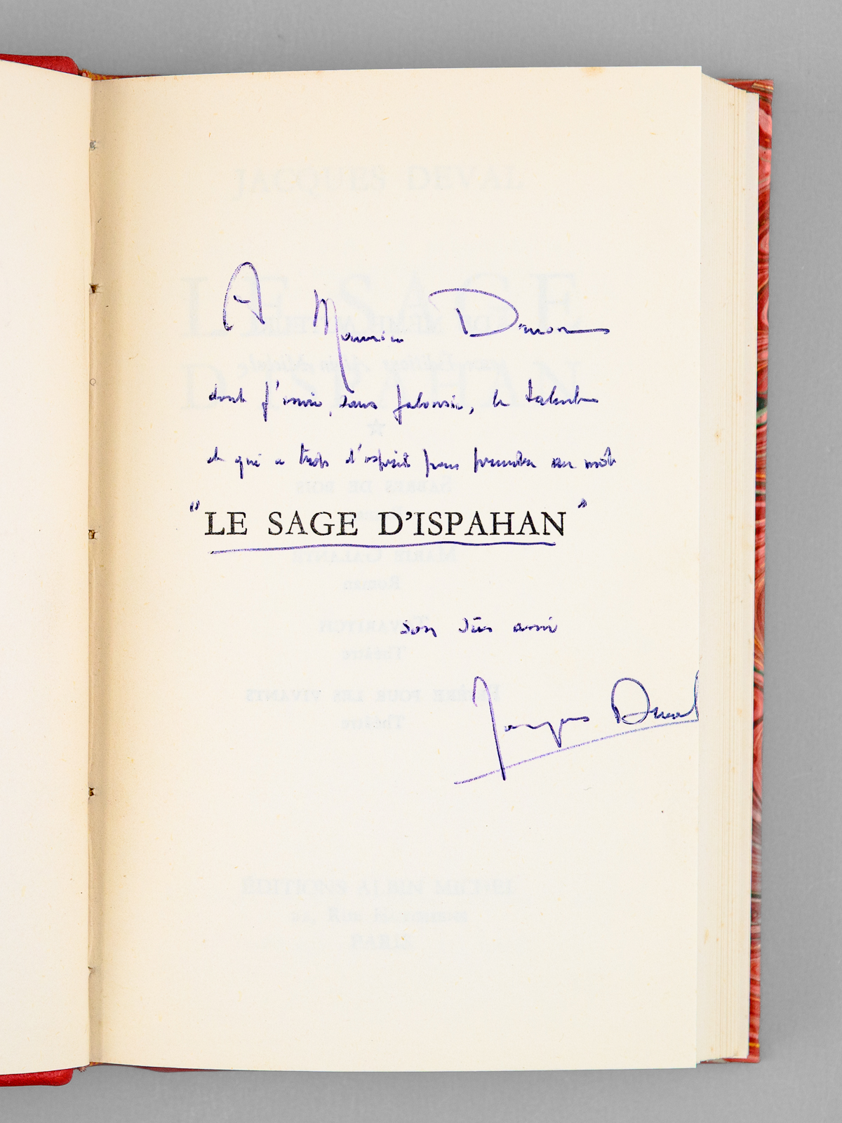 1 vol. in-12 reliure demi-chagrin rouge, dos à 5 nerfs, couvertures et dos conservés, Editions Albin Michel, Paris, 1955, 211 pp. Commentaire : Envoi de Jacques Deval à 'Maurice Druon, dont j'envie, sans jalousie, le talent et qui a trop d'esprit pour prendre au mot 'Le Sage d'Ispahan'. Son sûr ami'. Bon exemplaire bien relié, de superbe provenance, dédicacé au futur Secrétaire Perpétuel de l'Académie Française Maurice Druon. Ecrivain et réalisateur, Jacques Deval est le père des écrivains Gérard de Villiers et Bernard Eschasseriaux. En 100 chapitres, il nous raconte autant de petites histoires se concluant par une moralité, spirituelle et amusante.