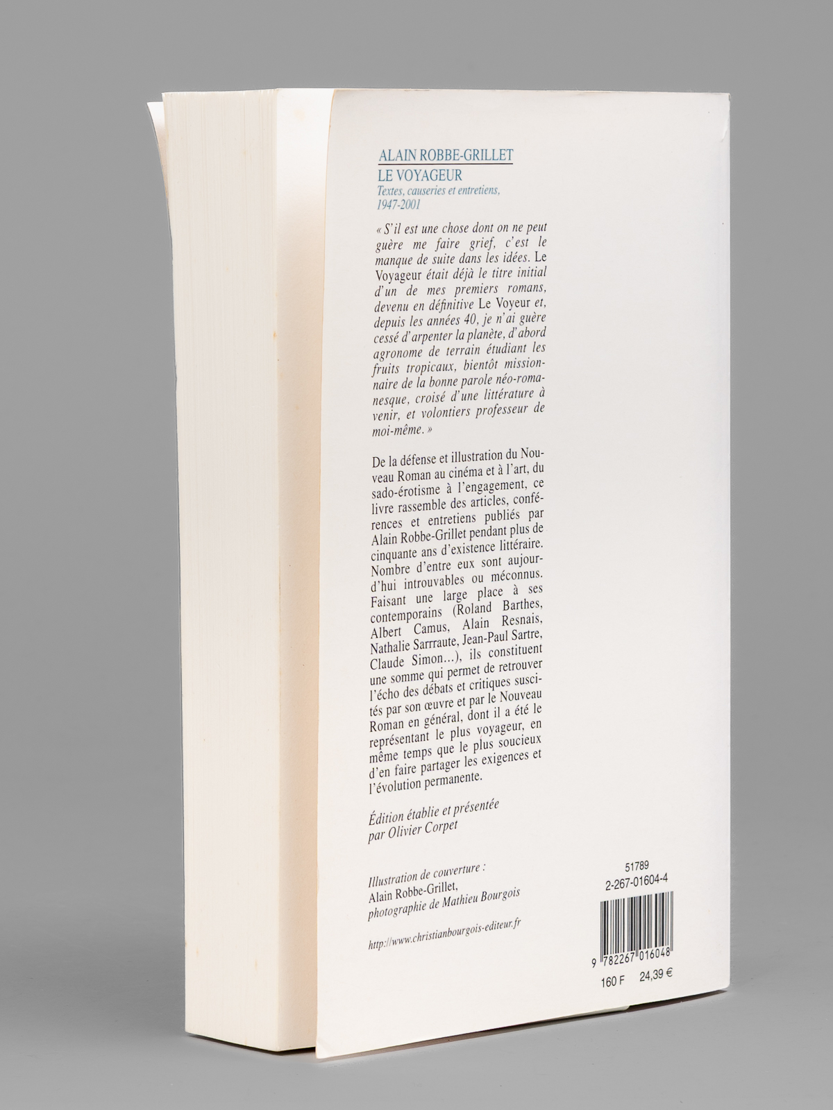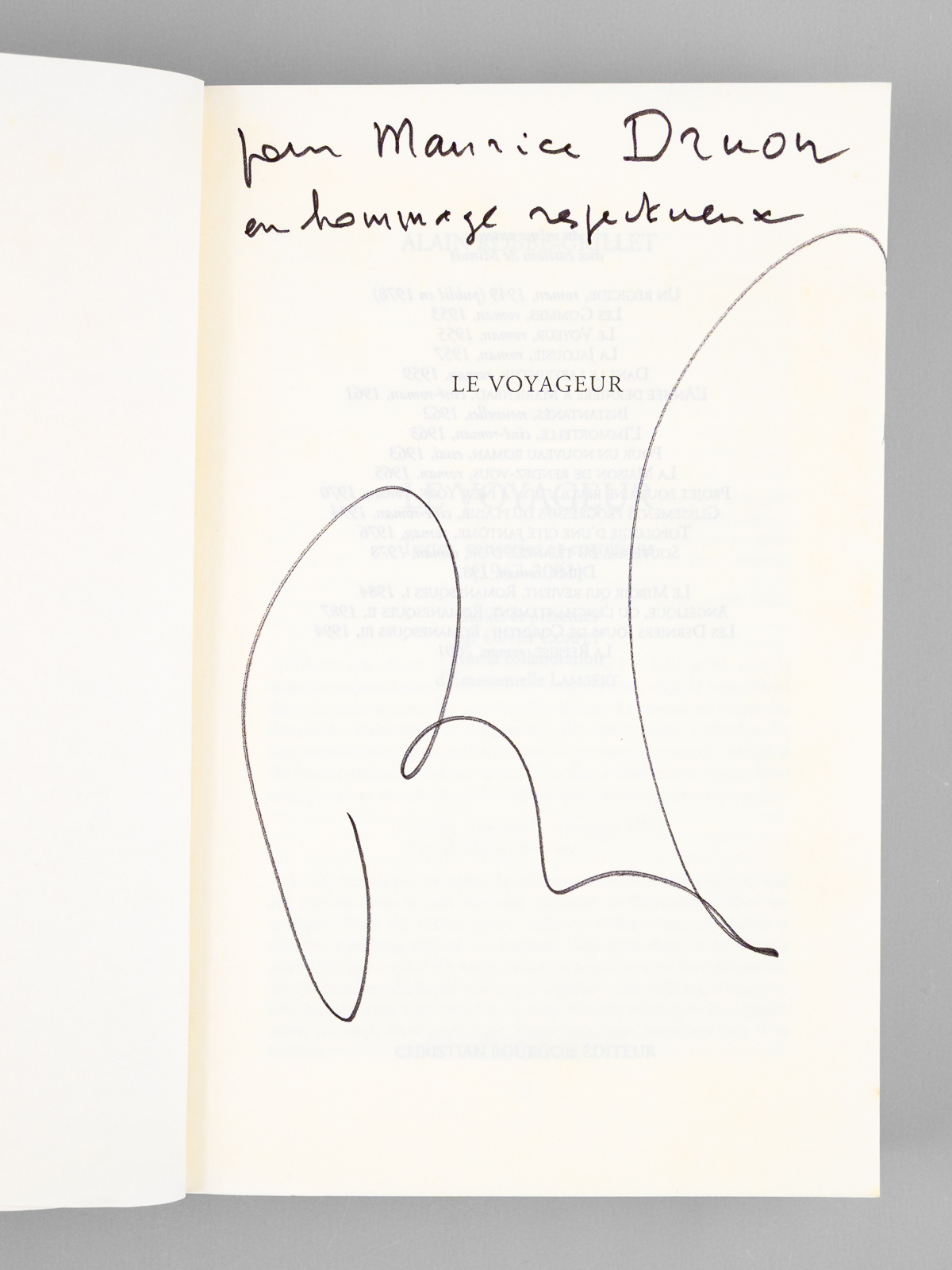 Commentaire : Exemplaire dédicacé par Alain Robbe-Grillet 'à Maurice Druon, hommage respectueux'. Bon état (très petit accroc en mors) pour cet exemplaire dédicacé par le père du 'Nouveau Roman' à son confrère académicien Maurice Druon, Secrétaire Perpétuel de l'Académie Française de 1985 à 1999.