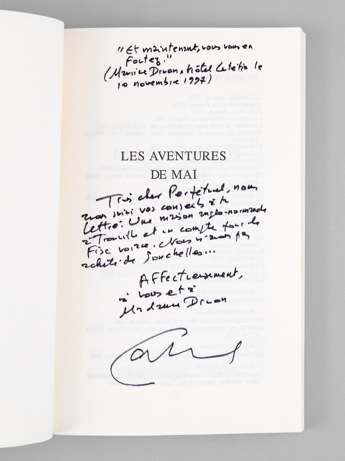 Commentaire : Superbe envoi de Patrick Rambaud :''Et maintenant, vous vous en foutez' (Maurice Druon, hôtel Lutetia le 10 novembre 1997) Très cher Perpétuel, nous avons suivi vos conseils à la lettre : Une maison anglo-normande à Trouville et un compte pour le [ ... ] vorace. Nous n'avons pas acheté de Sonchelles. Affectueusement à vous et à Madame Druon'. Ce très bel envoi est un beau clin d'oeil de Patrick Rambaud aux 'sucreries Sonchelles' du roman 'Les Grands Familles', de Maurice Druon. De la bibliothèque de Maurice Druon, Secrétaire Perpétuel de l'Académie Française de 1985 à 1999. Bon exemplaire. 'La Bataille' avait obtenu en 1997 le Prix Goncourt et le Grand prix du roman de l'Académie française.