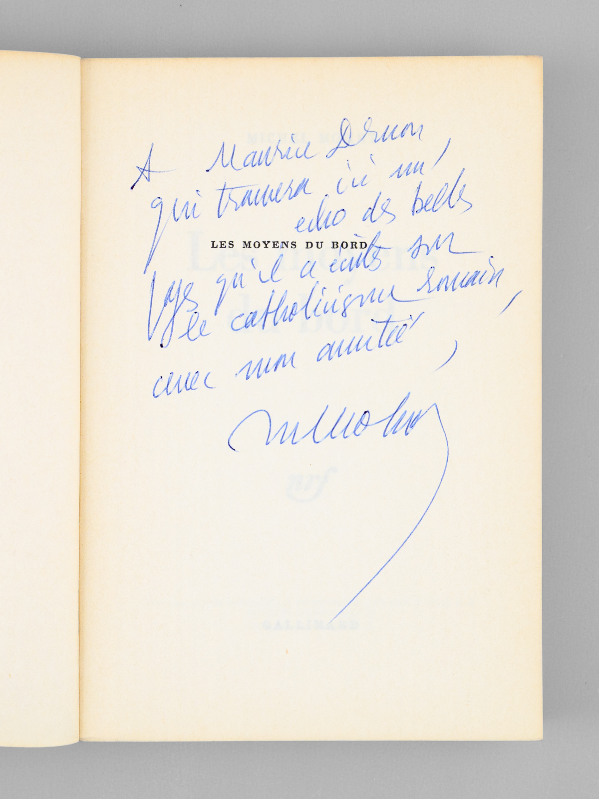 Envoi ms. de l'auteur, Exemplaire du service de presse marqué S.P., 1 vol. in-8 br., NRF, Gallimard, Paris, 1975, 324 pp. Commentaire : L'exemplaire est enrichi d'un bel envoi 'à Maurice Druon qui trouvera ici un écho des belles pages qu'il a écrites sur le catholicisme romain,avec mon amitié'. Romancier, écrivain et historien de la littérature, Michel Mohrt (1914-2011) fut élu en 1985 membre de l'Académie française au Fauteuil 33, le fauteuil de Voltaire, où il succède à Marcel Brion. Bon état (légères rouss. sur tranche en tête). La dédicace fait référence à l'essai 'Une église qui se trompe de siècle', publié par Maurice Druon en 1971