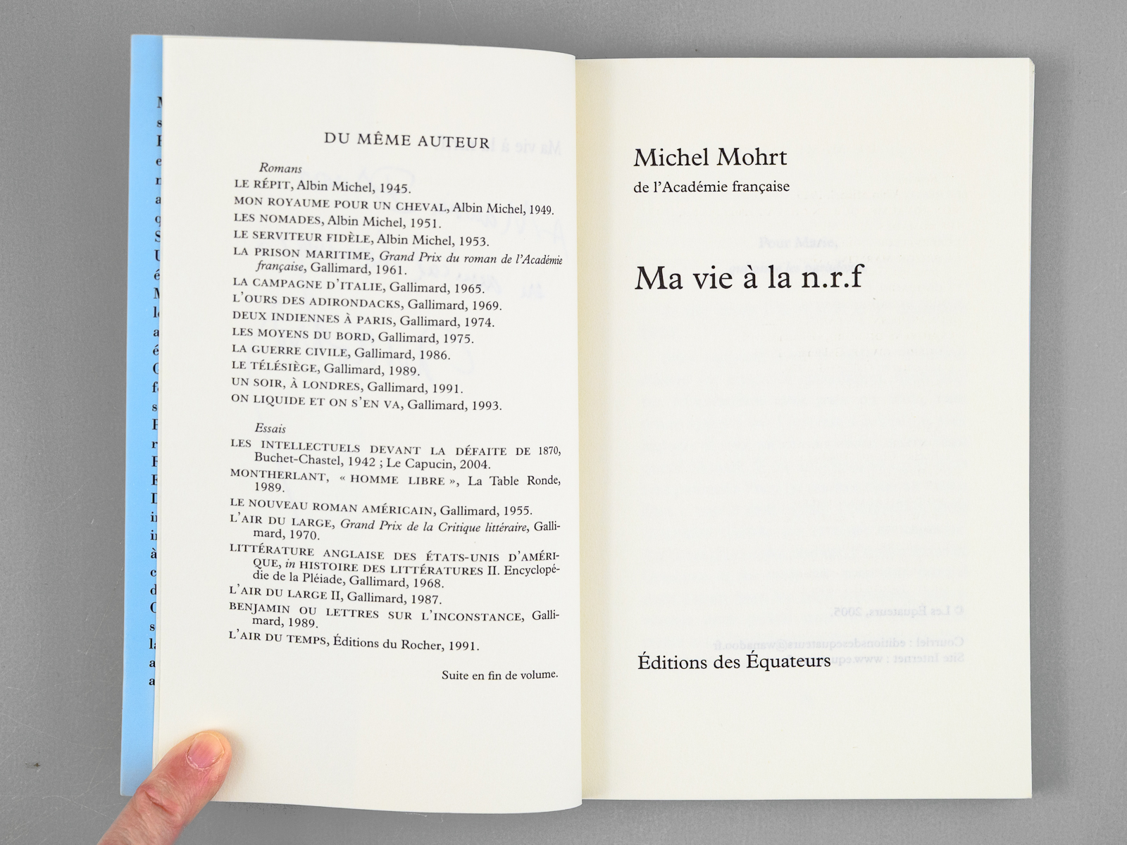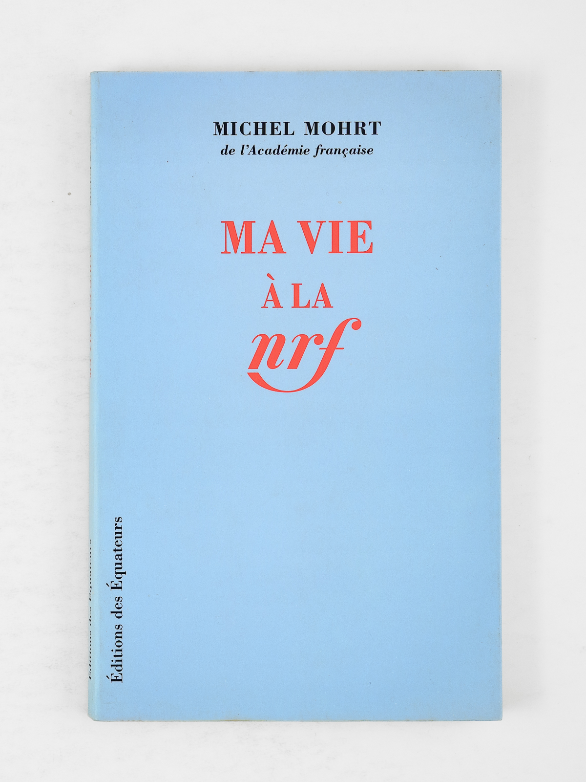 Envoi ms. de l'auteur, 1 vol. petit in-8 br., Editions des Equateurs, Paris, 2005, 103 pp. Commentaire : L'ouvrage, dédicacé à Maurice Druon, raconte la vie de Michel Mohrt à la NRF où, rentré en 1952, il fera publier de nombreux auteurs anglo-saxons tels Kerouac, Faulkner ou Philip Roth.. Romancier, écrivain et historien de la littérature, Michel Mohrt (1914-2011) fut élu en 1985 membre de l'Académie française au Fauteuil 33, le fauteuil de Voltaire, où il succède à Marcel Brion. Bon état (qq. rouss. sur tranche en tête).