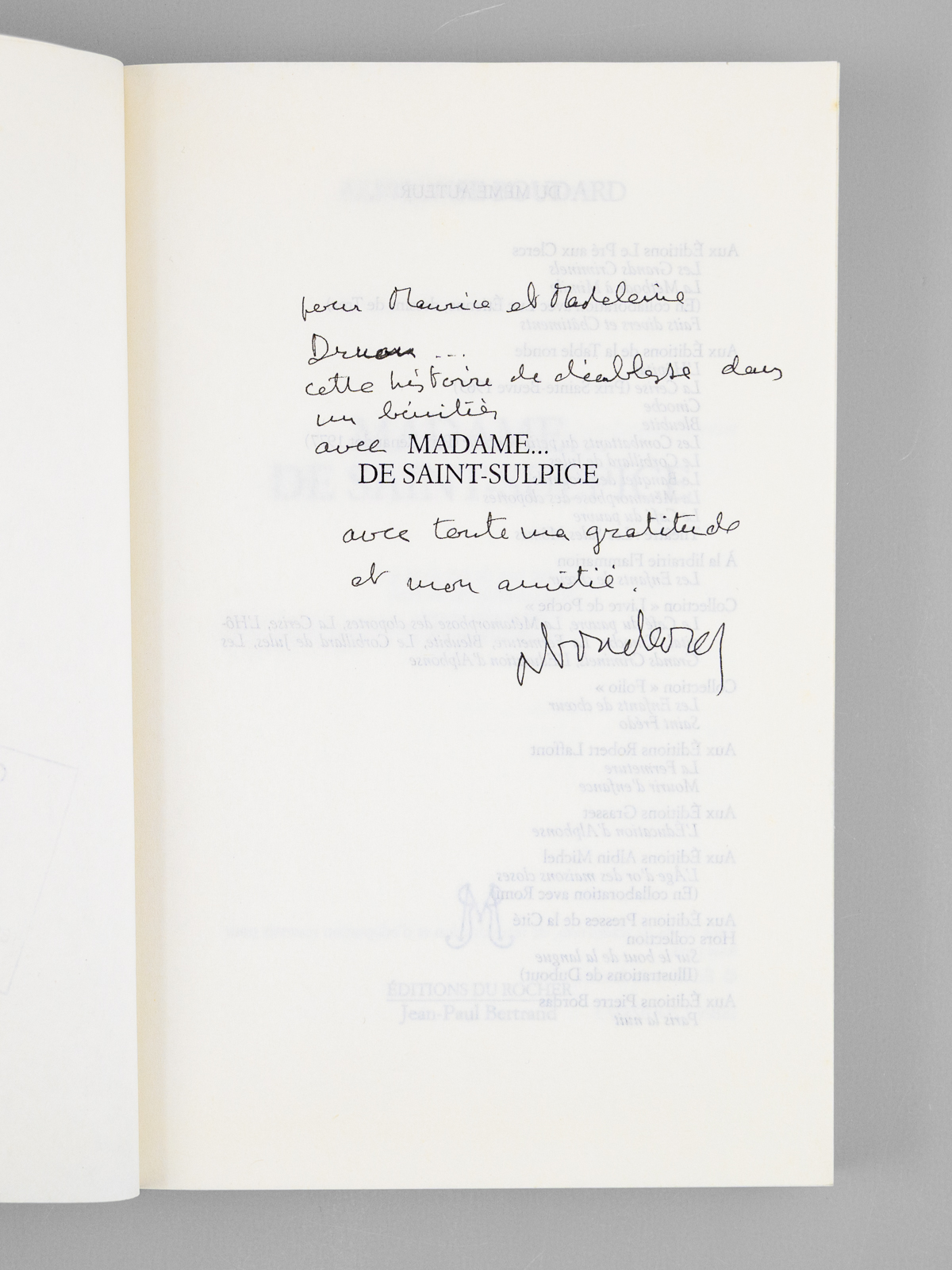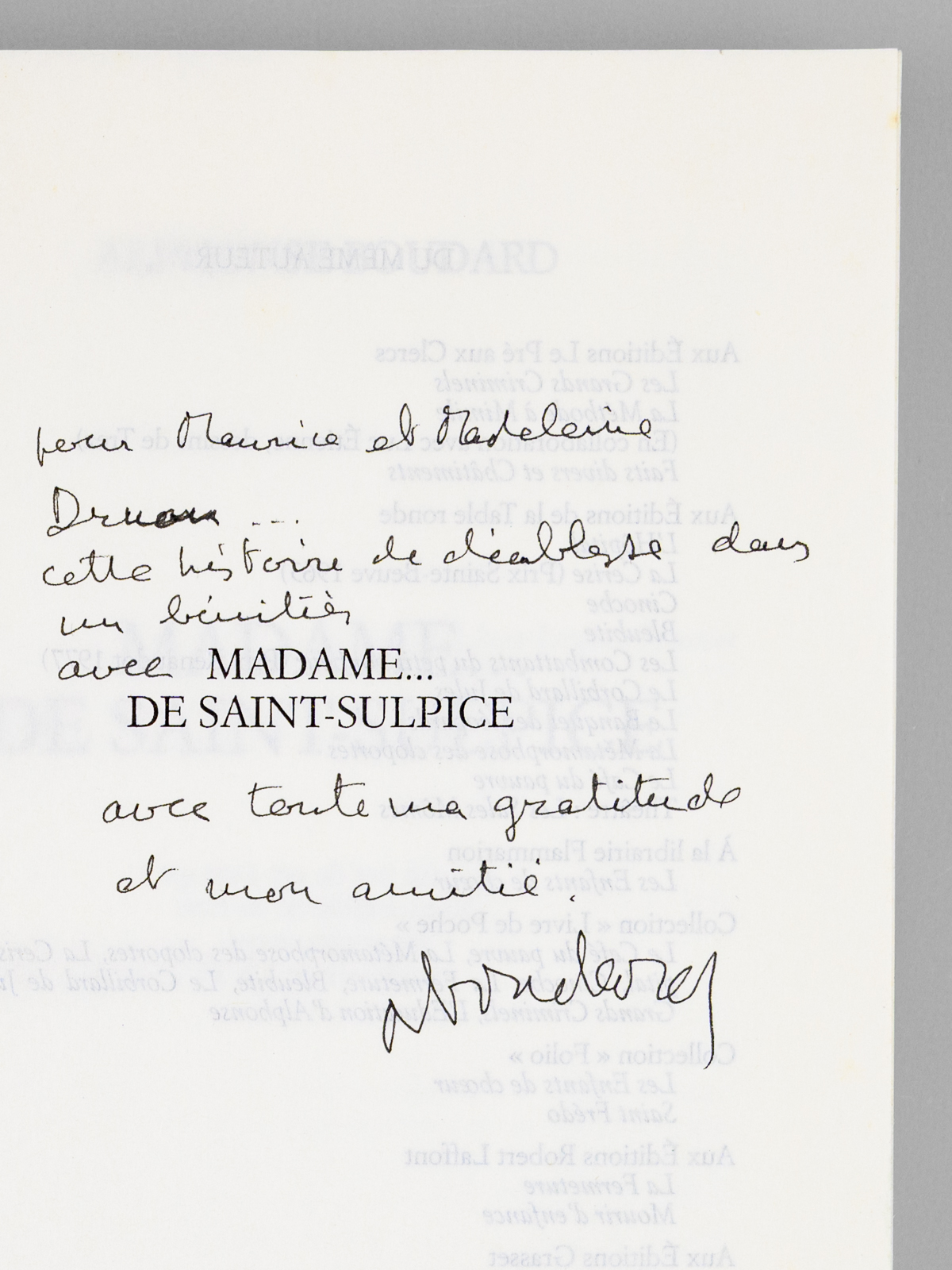 Commentaire : Bel envoi de l'auteur à Maurice Druon et à son épouse: 'Pour Maurice et Madeleine Druon, Cette histoire de diablesse dans un bénitier , Avec Mme de Saint-Sulpice , Avec toute ma gratitude et mon amitié.' Etat très satisfaisant (lég. rouss. sur tr. sup., bon état par ailleurs). Maurice Druon (1918-2009), auteur notamment de la célèbre saga historique des Rois maudits, avait été élu à l'Académie Française en 1968, et en devint le secrétaire perpétuel, de 1985 à 1999.