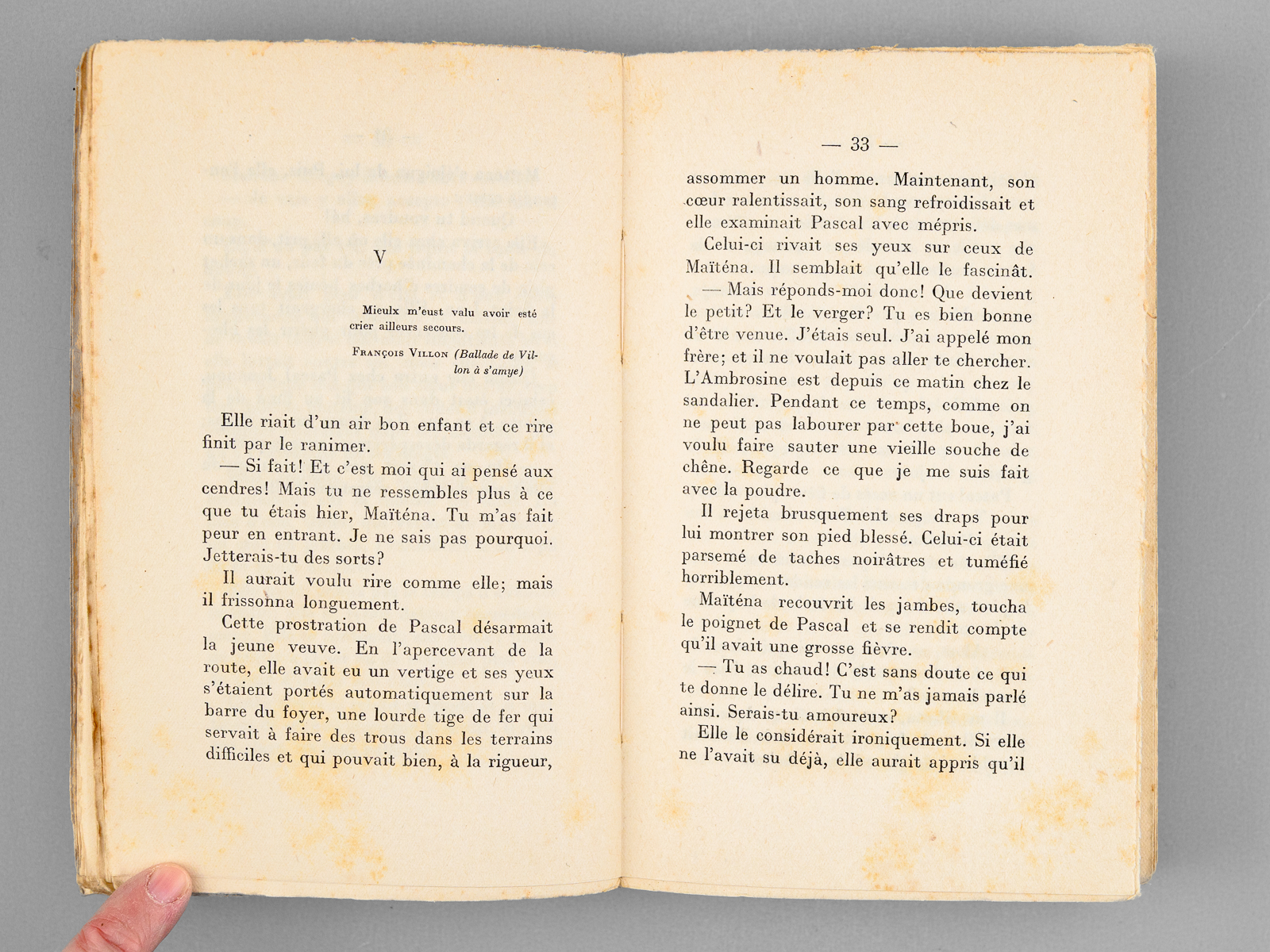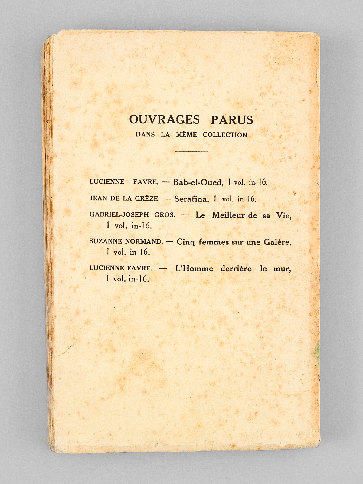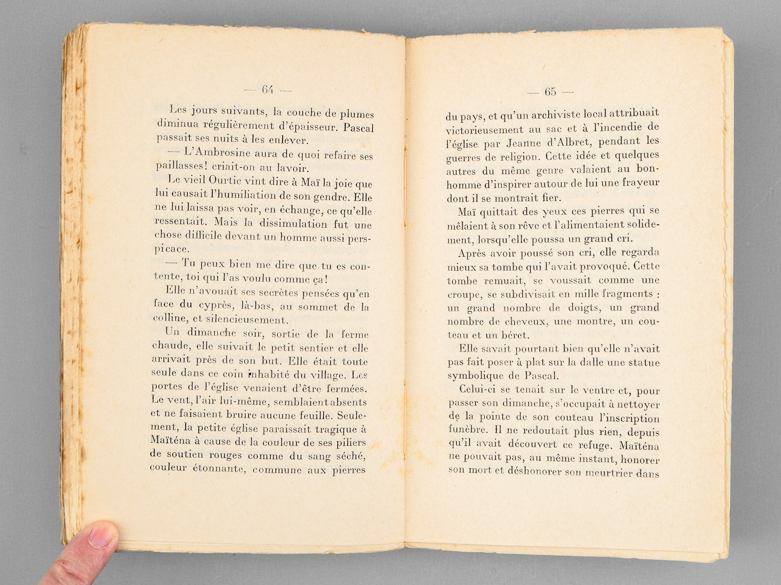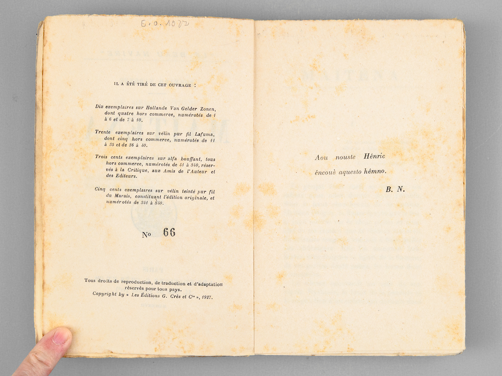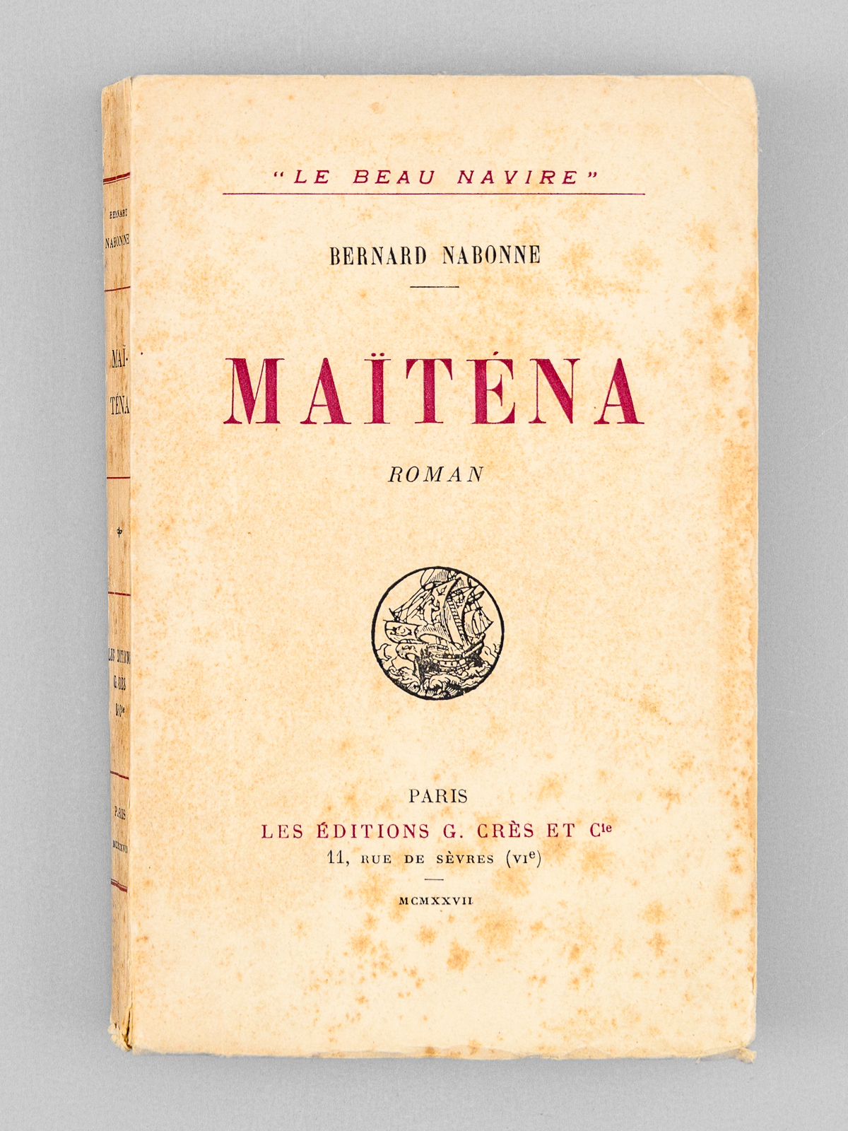 Commentaire : Envoi de l'auteur à 'Mademoiselle Despina Coronio, hommage très respectueux'. Ce roman de écrivain d'origine béarnaise Bernard Nabonne (1897-1951) obtint le Prix Renaudot. Vigneron de Madiran, l'auteur est également connu pour avoir été l'instigateur du dossier de demande d'AOC. Etat très satisfaisant (rouss.)