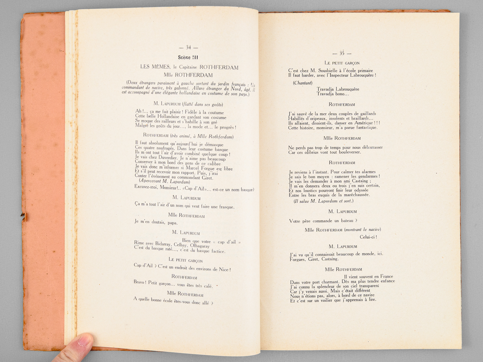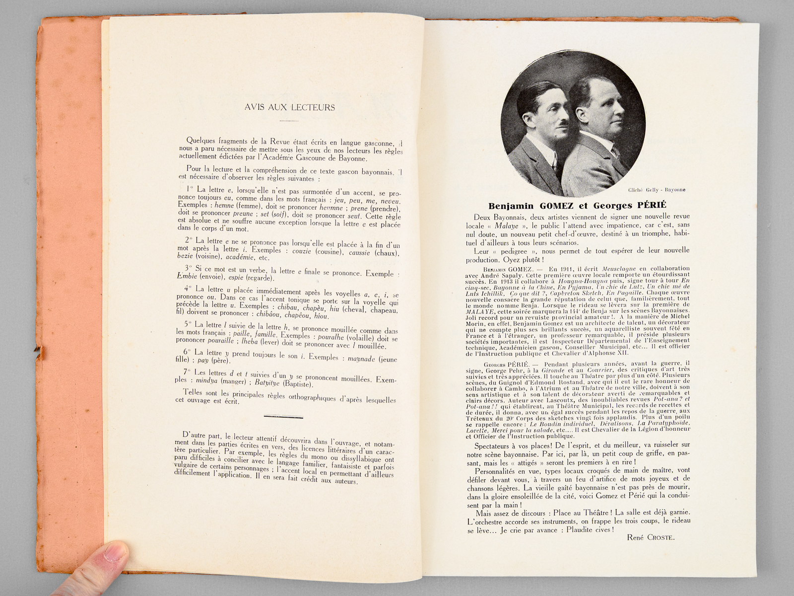 1 vol. in-8 br., Société d'Édition et d'Imprimerie du Sud-Ouest, Bayonne, 1929 Commentaire : 'Personnalités en vue, types locaux croqués de main de maître, vont défiler devant vous, à travers un feu d'artifice de mots joyeux et de chansons légères. La vieille gaîté bayonnaise n'est pas près de mourir, dans la gloire ensoleillée de la cité, voici Gomez et Périé qui la conduisent par la main !'. Les deux bayonnais Benjamin Gomez (dit 'Benja') et Georges Périé sont tous deux officiers de l'Instruction Publique. L'avis au lecteur précise que 'quelques fragments de la Revue étant écrits en langue gasconne, il nous a paru nécessaire de mettre sous les yeux de nos lecteurs les règles actuellement édictées par l'Académie Gascoune de Bayonne'. Etat très satisfaisant (usures en couv., bon état par ailleurs).