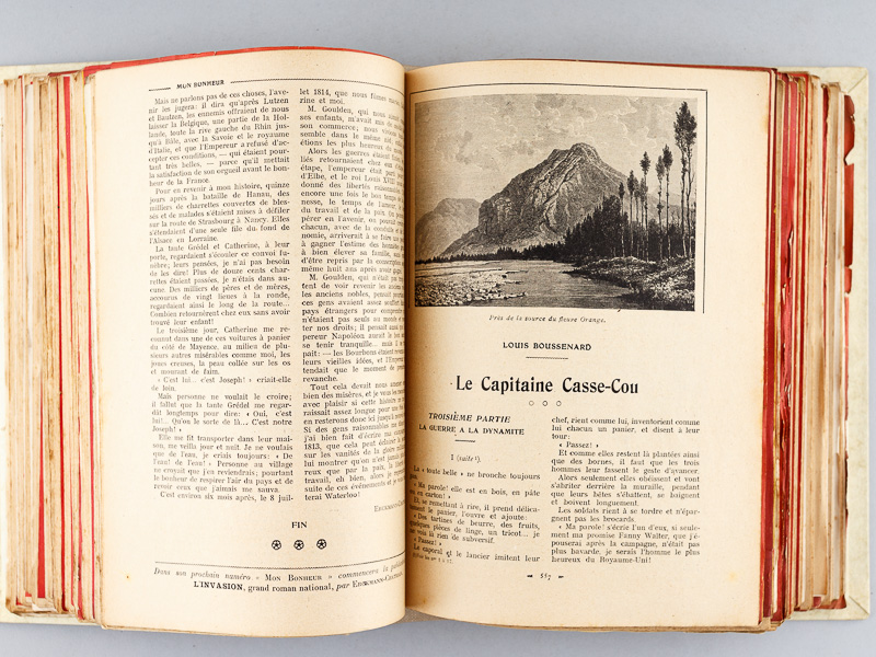1 vol. fort in-8 reliure postérieure demi-toile grise, Librairie Illustrée Jules Tallandier, Paris, s.d. [ circa 1907-1908 ], 42 fascicules de 32 pp. Commentaire : Bon état pour cet exemplaire bien relié, réunissant les 42 numéros de l'année 1909, tous bien complets de leurs belles couvertures en couleurs (premiers et seconds plats). Un très agréable exemplaire bien relié, complet des deux couvertures de chaque livraison (qq. rouss. en reliure). Chaque couverture de livraison en couleurs (dont le style et le thème rappelle les couvertures du 'Petit Journal') illustre un récit complet publié dans les 32 pages du numéro concerné.