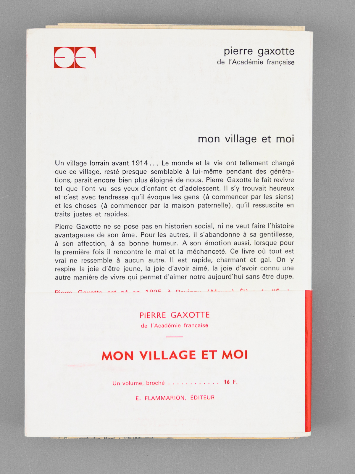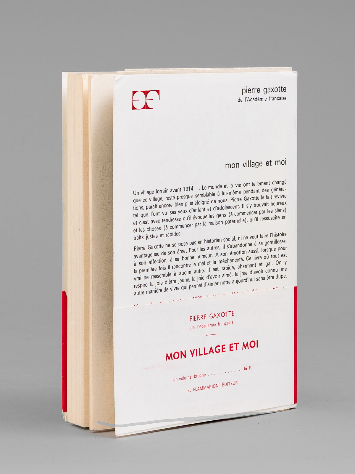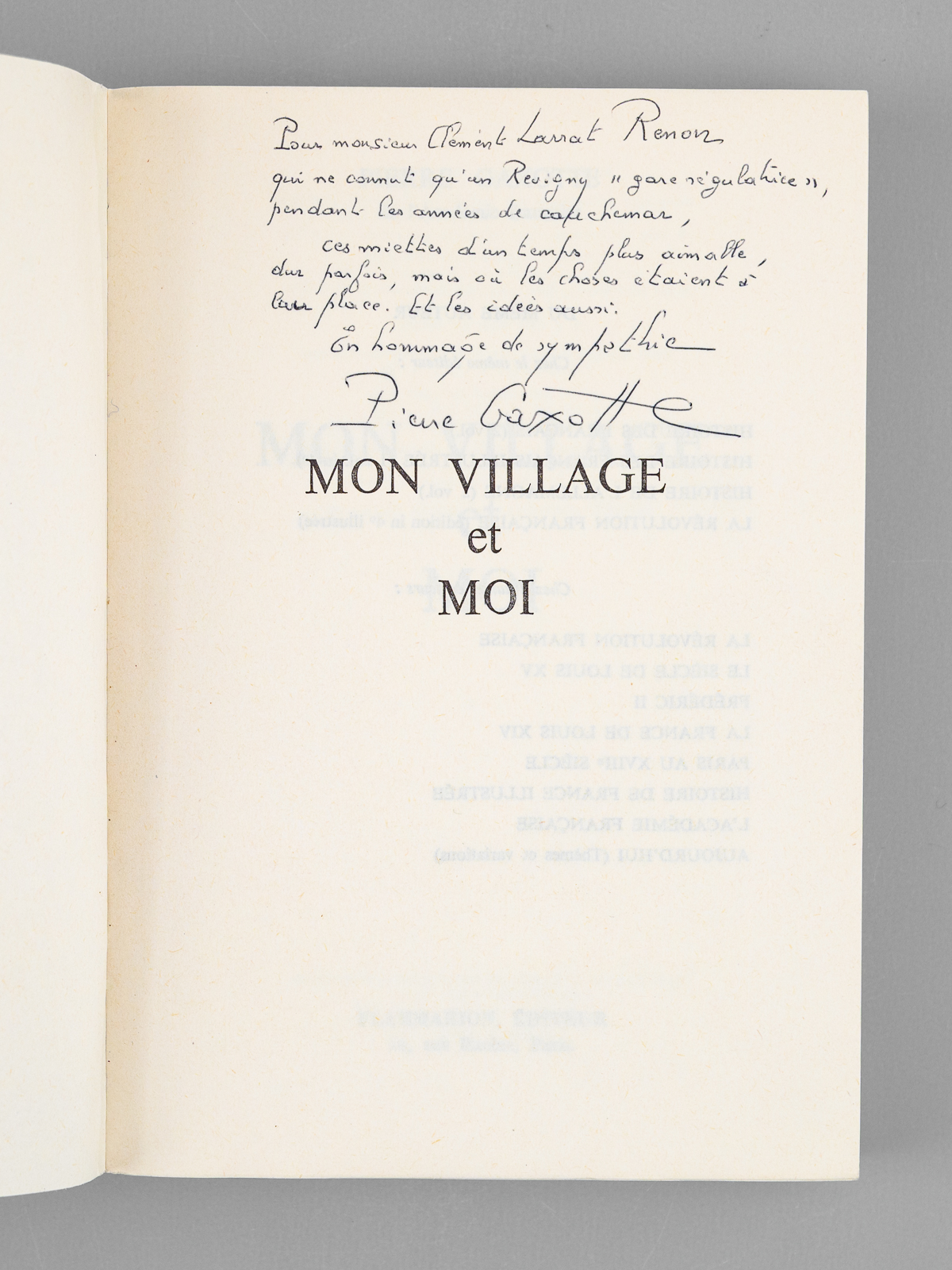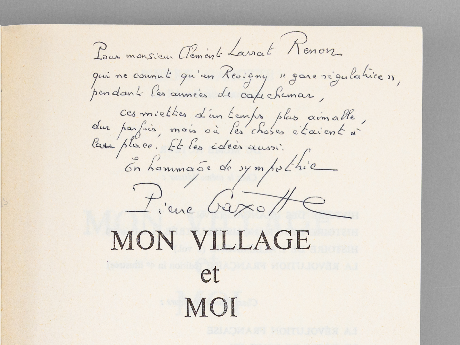 Commentaire : Bel envoi autographe de Pierre Gaxotte à M. C..L...R... 'qui ne connut qu'un Revigny 'gare régulatrice' pendant les années de cauchemar, ces miettes d'un temps plus aimable, dur parfois, mais où les choses étaient à leur place. Et les idées aussi. En hommage de sympathie'. Pierre GAxotte a également corrigé un nom dans le texte. Bon état pour cet exemplaire enrichi d'un bel envoi évoquant nommément le village natal de Pierre Gaxotte, Revigny-sur-Ornain, dans la Meuse.