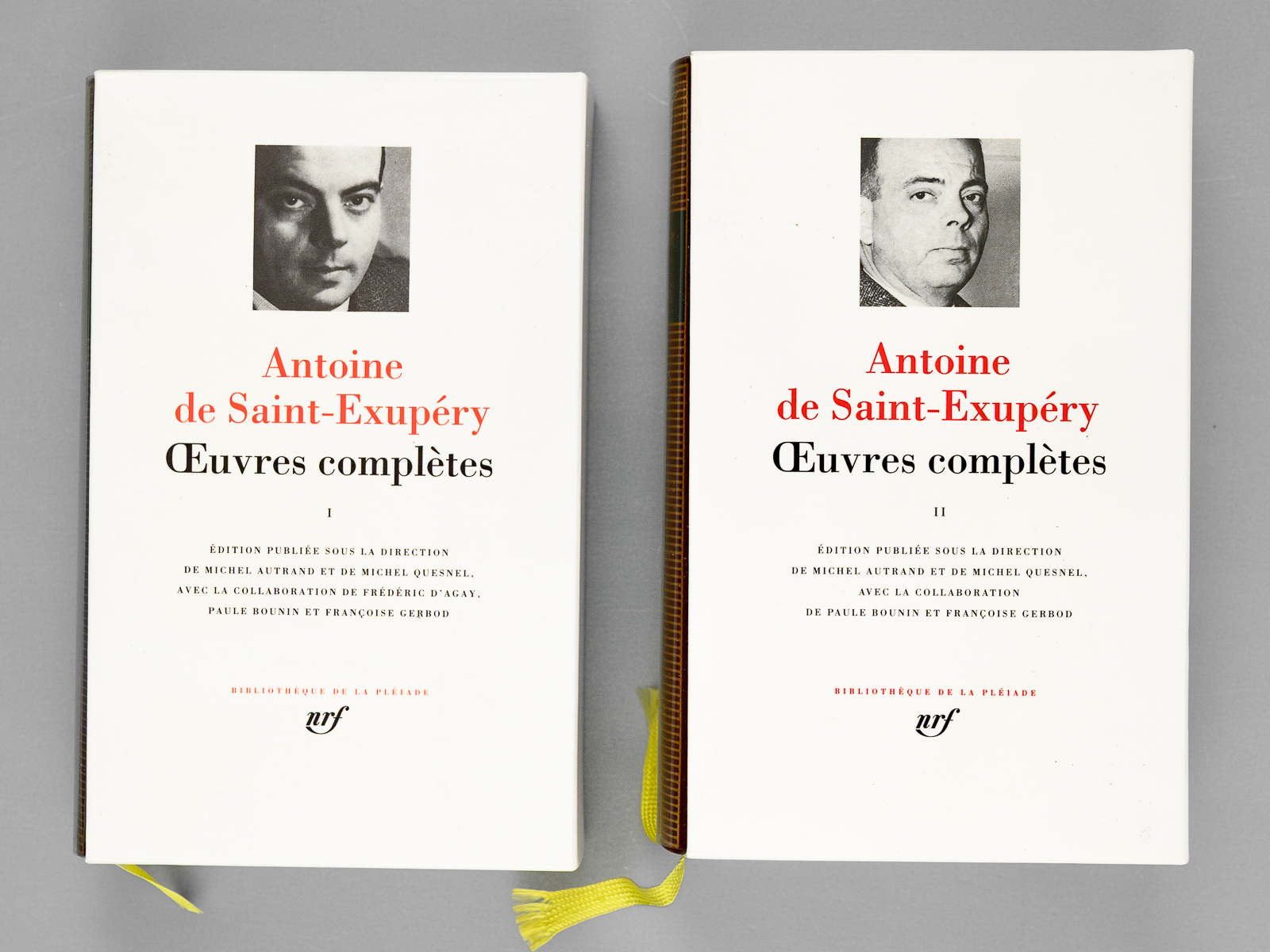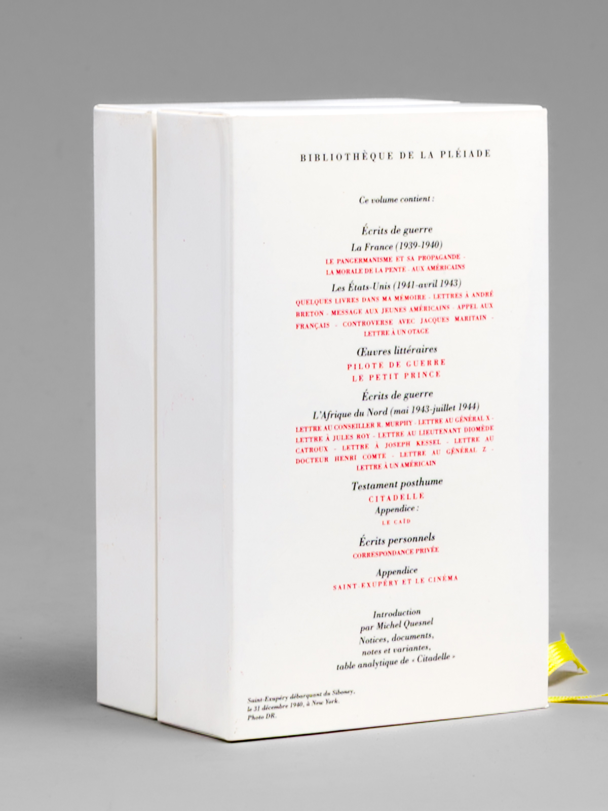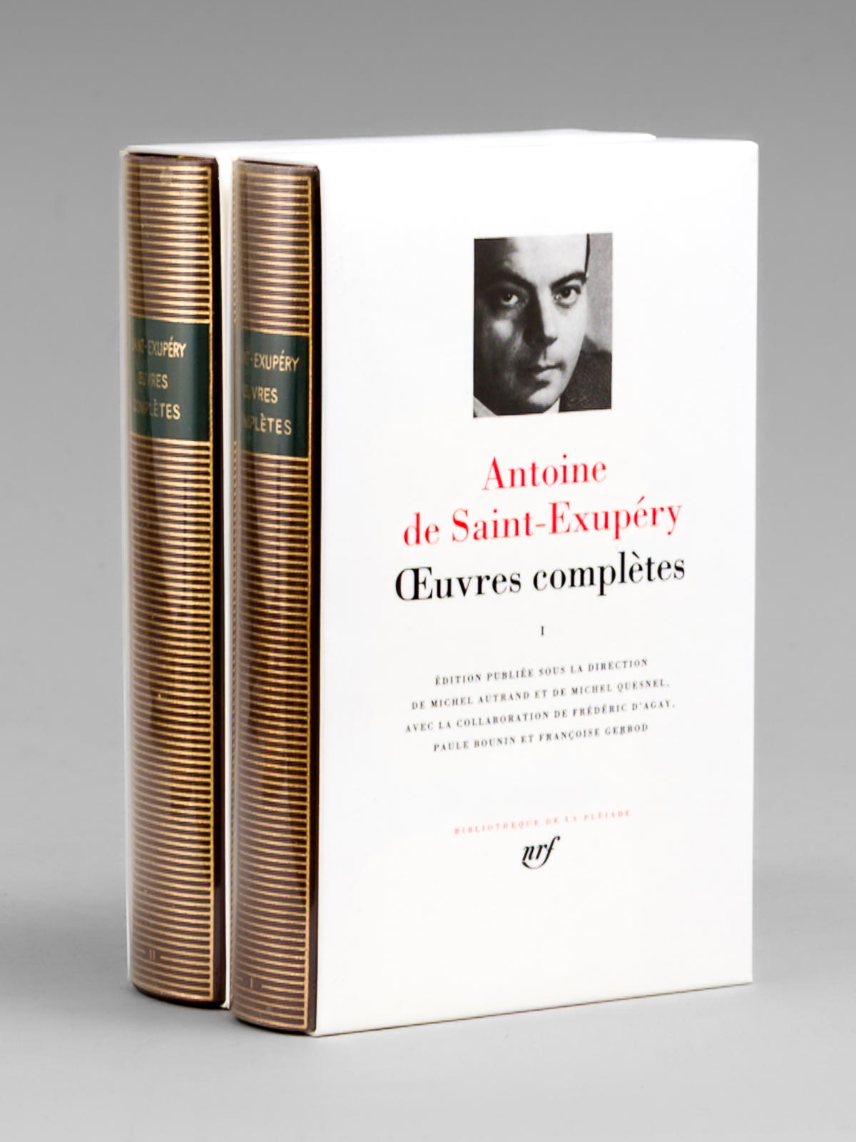 2 vol. in-12 reliure éditeur plein cuir brun sous jaquette rhodoïde sous étui imprimé, Bibliothèque de la Pléiade, NRF, Gallimard, Paris, 1994 et 1999, XCVI-1210 pp. ; XLVIII-1508 pp. Commentaire : Très bon état. Contient : Tome I : Textes de jeunesse. Romans et récits : L'Aviateur - Courrier Sud - Vol de nuit - Terre des hommes. Écrits de circonstance : Articles - Reportages - Préfaces. Écrits personnels : Carnets - Correspondance. Tome II : Écrits de guerre : La France (1939-1940) : Le Pangermanisme et sa propagande - La morale de la pente - Aux Américains. Écrits de guerre : Les États-Unis (1941-avril 1943) : Quelques livres dans ma mémoire - Lettres à André Breton - Message aux jeunes Américains - Appel aux Français, controverse avec Jacques Maritain - Lettre à un otage. OEuvres littéraires : Pilote de guerre - Le Petit Prince. Écrits de guerre : L'Afrique du Nord (mai 1943 - juillet 1944) : Lettre au conseiller R. Murphy - Lettre au général X - Lettre à Jules Roy - Lettre au lieutenant Diomède Catroux - Lettre à Joseph Kessel - Lettre au docteur Henri Comte - Lettre au général Z - Lettre à un Américain. Testament posthume : Citadelle. Appendice : Le Caïd. Écrits personnels : Correspondance privée. Appendice : Saint-Exupéry et le cinéma.