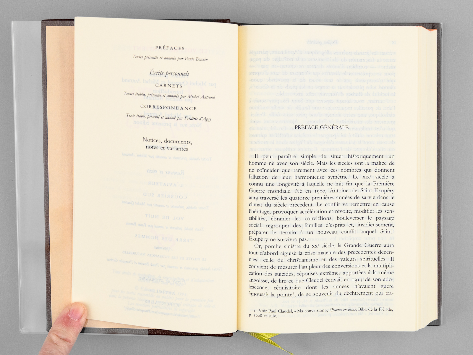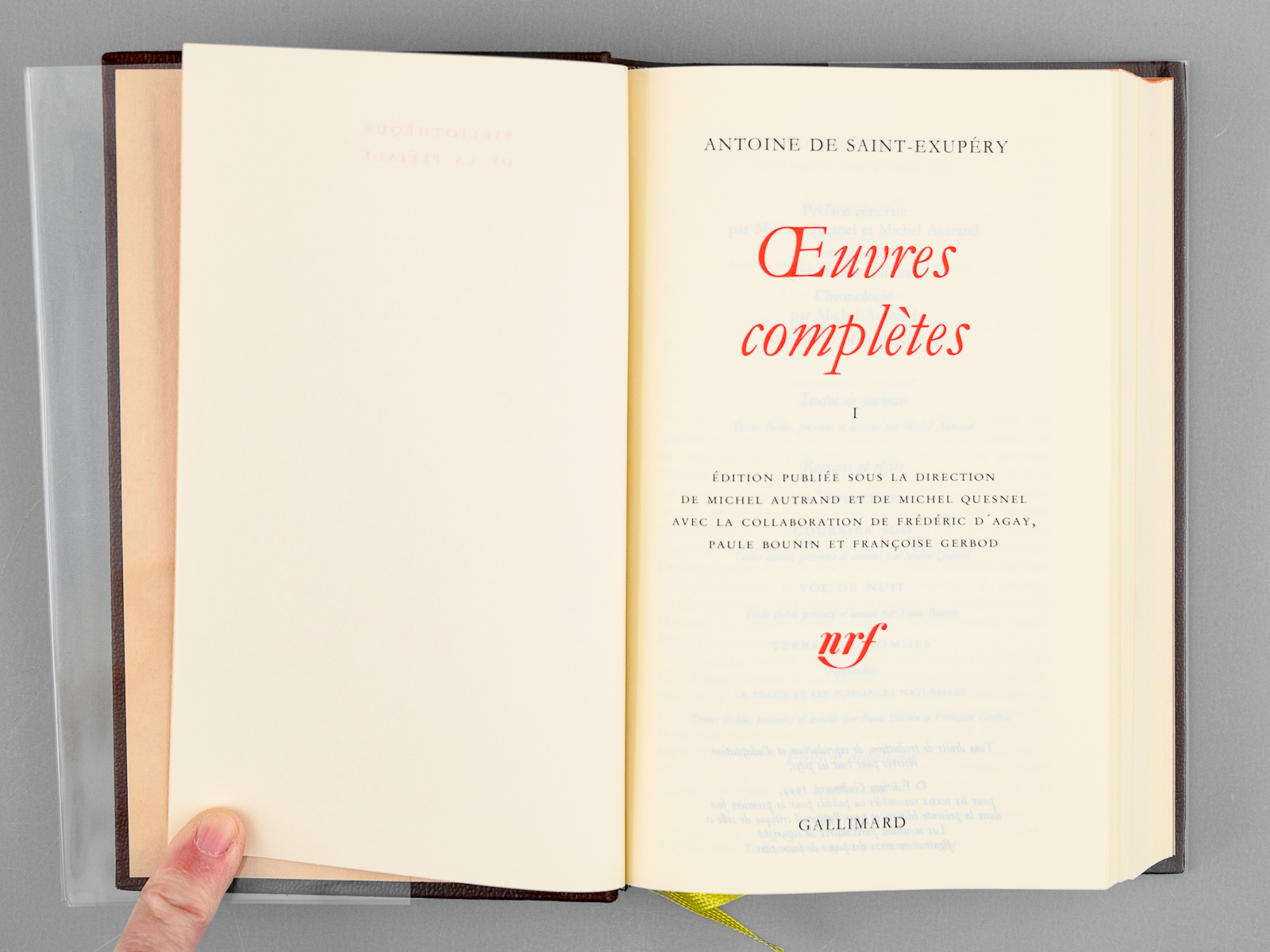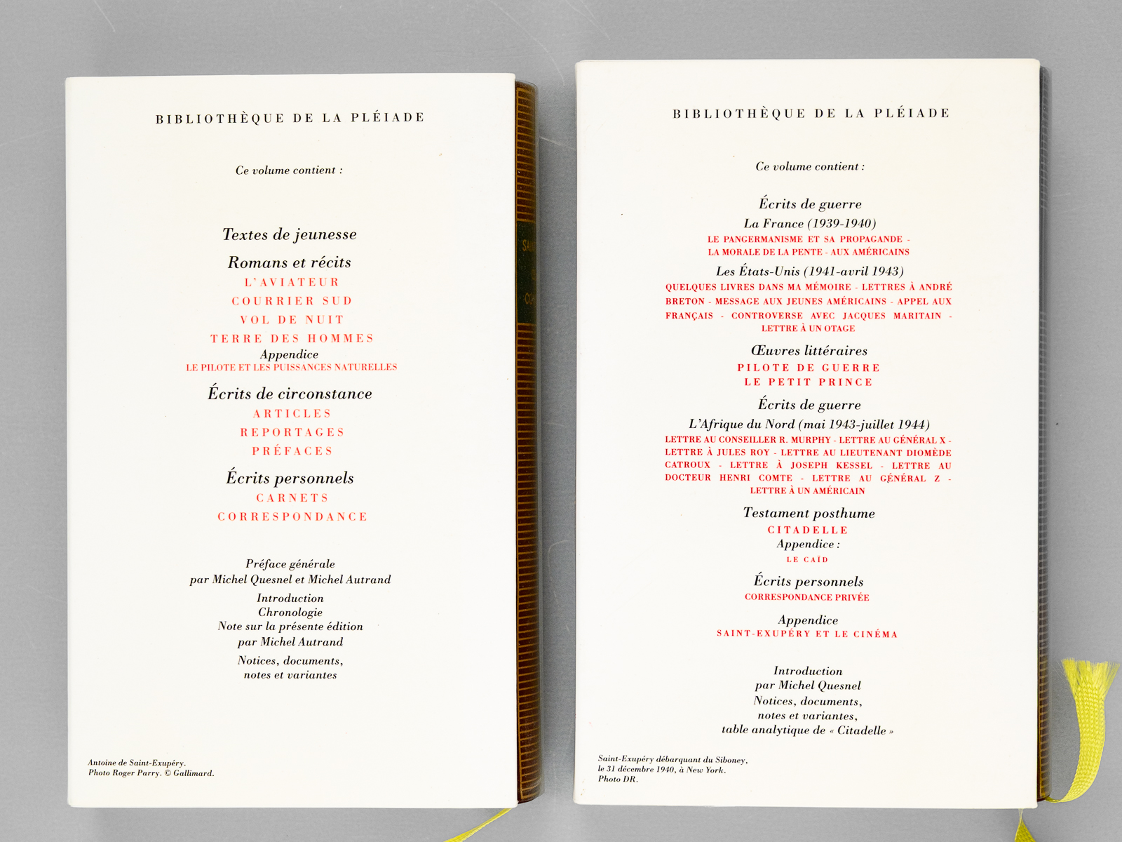 2 vol. in-12 reliure éditeur plein cuir brun sous jaquette rhodoïde sous étui imprimé, Bibliothèque de la Pléiade, NRF, Gallimard, Paris, 1994 et 1999, XCVI-1210 pp. ; XLVIII-1508 pp. Commentaire : Très bon état. Contient : Tome I : Textes de jeunesse. Romans et récits : L'Aviateur - Courrier Sud - Vol de nuit - Terre des hommes. Écrits de circonstance : Articles - Reportages - Préfaces. Écrits personnels : Carnets - Correspondance. Tome II : Écrits de guerre : La France (1939-1940) : Le Pangermanisme et sa propagande - La morale de la pente - Aux Américains. Écrits de guerre : Les États-Unis (1941-avril 1943) : Quelques livres dans ma mémoire - Lettres à André Breton - Message aux jeunes Américains - Appel aux Français, controverse avec Jacques Maritain - Lettre à un otage. OEuvres littéraires : Pilote de guerre - Le Petit Prince. Écrits de guerre : L'Afrique du Nord (mai 1943 - juillet 1944) : Lettre au conseiller R. Murphy - Lettre au général X - Lettre à Jules Roy - Lettre au lieutenant Diomède Catroux - Lettre à Joseph Kessel - Lettre au docteur Henri Comte - Lettre au général Z - Lettre à un Américain. Testament posthume : Citadelle. Appendice : Le Caïd. Écrits personnels : Correspondance privée. Appendice : Saint-Exupéry et le cinéma.