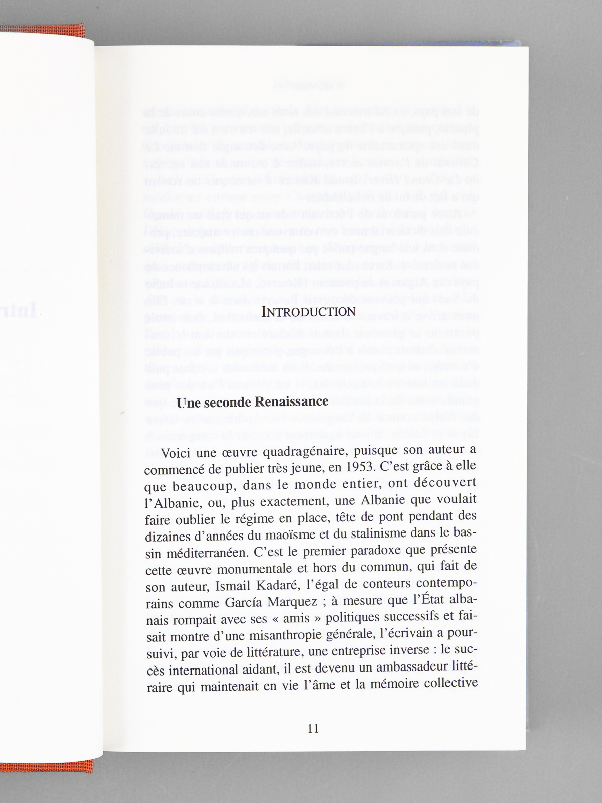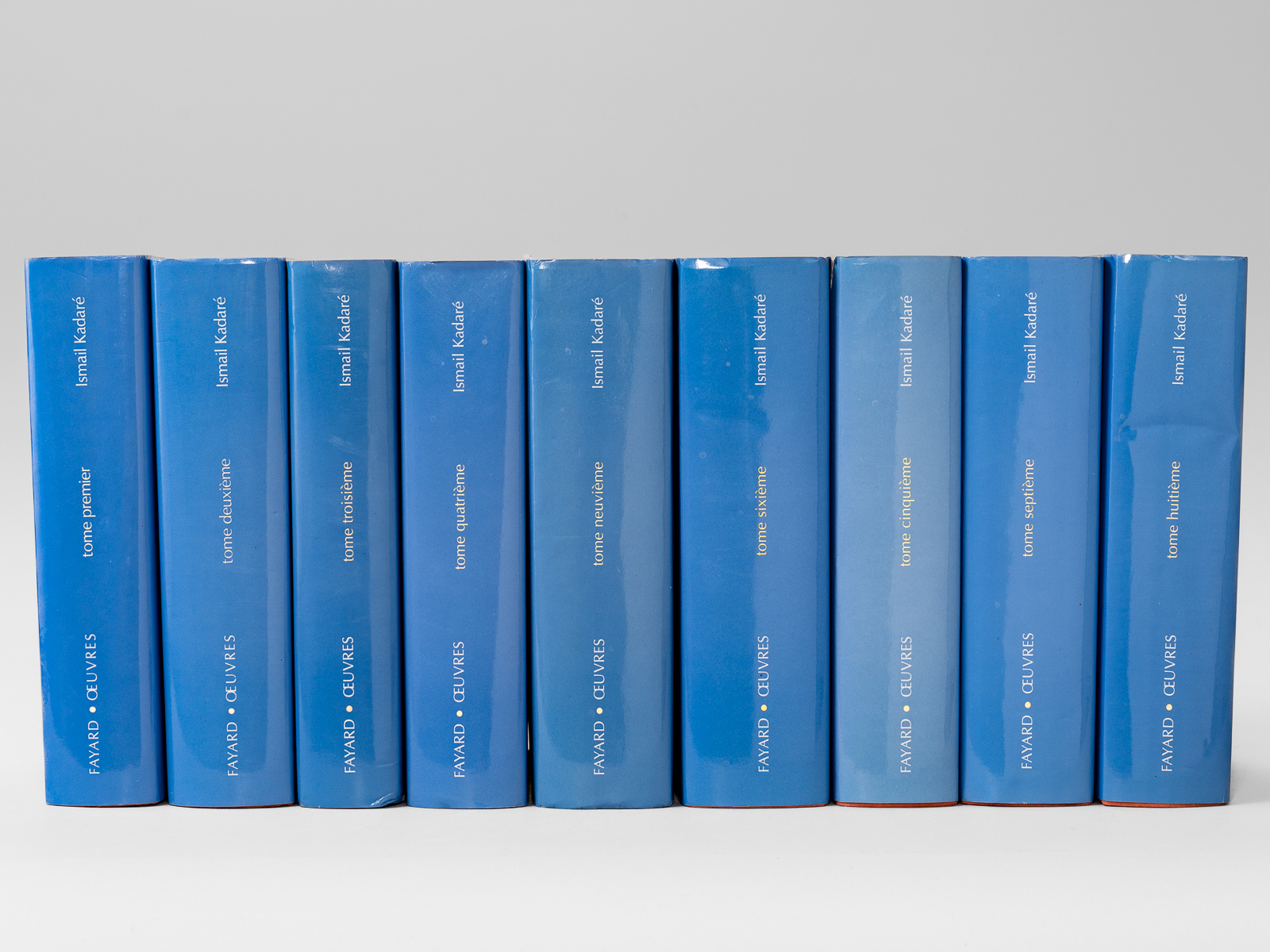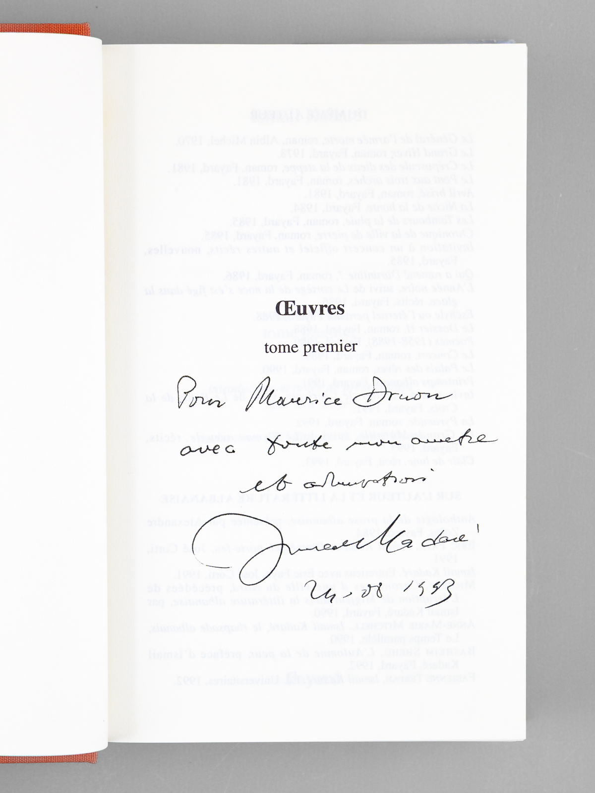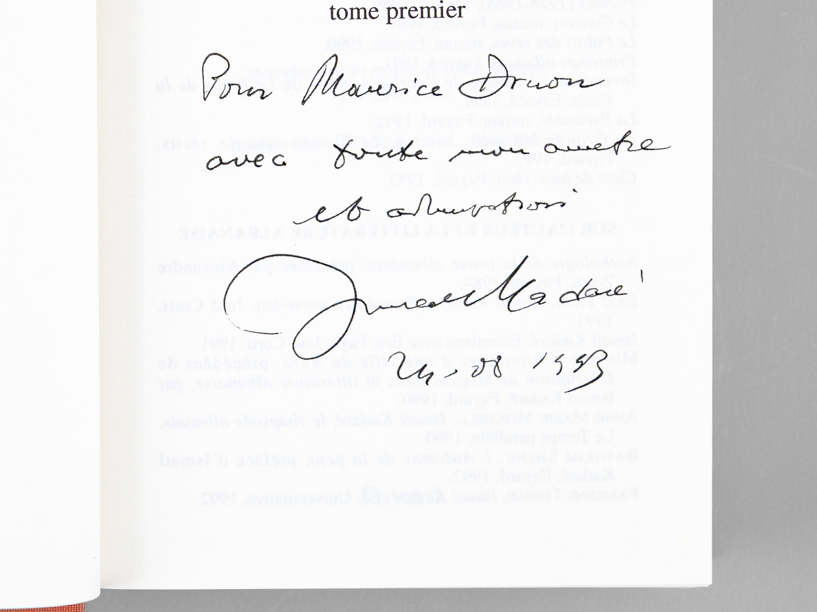 Introduction et notes de présentation par Eric Faye, traductions de l'albanais de Jusuf Vrioni, 9 vol. fort in-8 reliure pleine toile orange éditeur sous jaquette bleue, Fayard, Paris, 1993, 1994, 1995, 1996, 1997, 1998, 1999, 2000 : Oeuvres (Tomes 1 à 9 ) [ 8 des 9 volumes dédicacés par l'auteur à Maurice Druon ] Tome 1 : Récits d'outre-temps - La Pyramide - Qui a ramené Doruntine ? - Le Pont aux trois arches - La Grande Muraille ; Tome 2 : Les Tambours de la pluie - Récits de la nuit tombante - La Niche de la Honte ; Tome 3 : La Commission des fêtes - Le Firman aveugle - Le Palais des rêves - Le Vol du sommeil royal - La Chaîne des Hankoni - L'Abolition du métier d'imprécateur - Les Adieux du mal ; Tome 4 : L'Année noire - Avril brisé - Le Dossier H. - Le Chant - Les Passages souterrains - Concours de beauté masculine aux Cimes maudites ; Tome 5 : Chronique de pierre - Novembre d'une capitale - Trois temps ; Tome 6 : La Ville sans enseignes - Le Général de l'armée morte - Le Crépuscule de l'armée morte - Le Crépuscule des dieux de la steppe - Le Monstre ; Tome 7 : Le Temps des querelles I ; Tome 8 : Le Temps des querelles, II ; Tome 9 : La Peau de tambour - Onze courts récits Commentaire : Remarquable ensemble, réunissant les 9 premiers tomes (sur les 12 parus) d'Oeuvres d'Ismail Kadaré publiées par Fayard : tous les volumes, à l'exception du seul tome 8, sont dédicacés par le célèbre écrivain albanais au grand écrivain Maurice Druon, immortel co-auteur du 'Chant des Partisans' et des 'Rois Maudits', Secrétaire Perpétuel de l'Académie Française de 1985 à 1999. Ismail Kadaré fut élu en 1996 membre associé étranger de l'Académie des Sciences morales et politiques, au siège de Karl Popper. Bon état (petite pliure au dos d'un tome, très bon état par ailleurs). Voir également dans notre catalogue le tome 12, dédicacé.