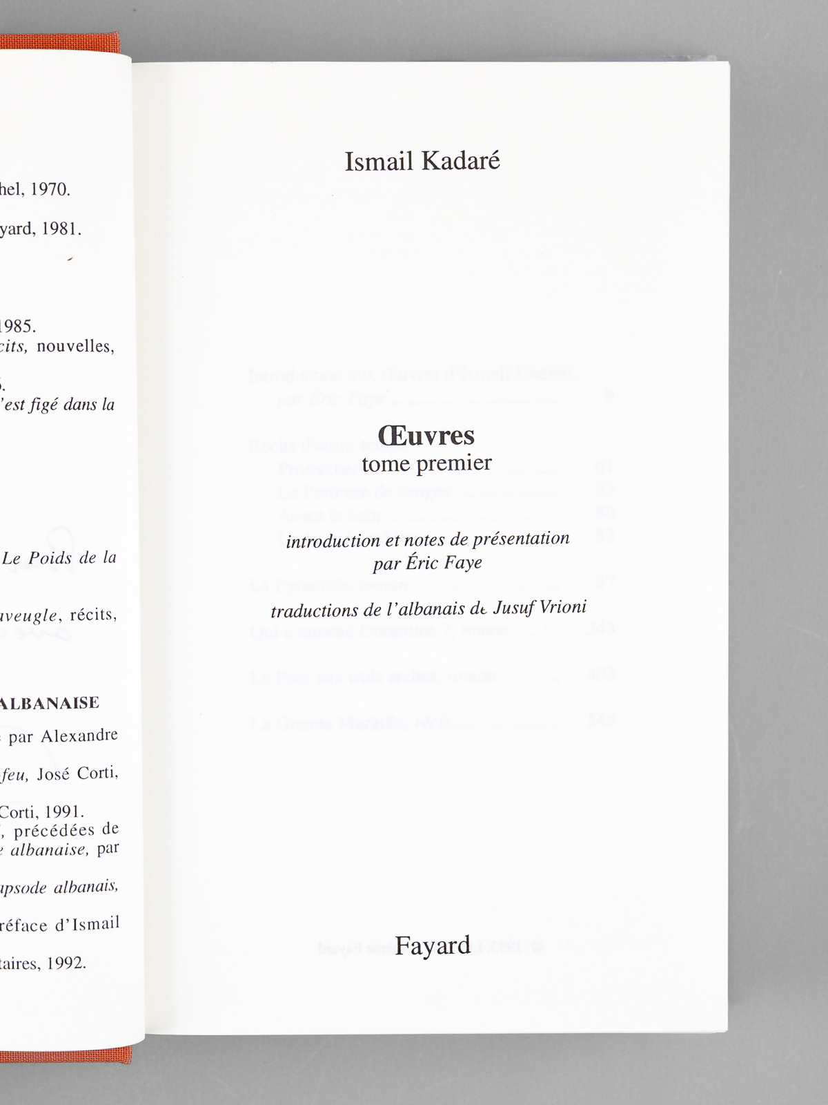 Oeuvres (Tomes 1 à 9 ) [ 8 des 9 volumes dédicacés par l'auteur à Maurice Druon ] Tome 1 : Récits d'outre-temps - La Pyramide - Qui a ramené Doruntine ? - Le Pont aux trois arches - La Grande Muraille ; Tome 2 : L - Auteur: KADARE, Ismail - Année d'édition: 1993