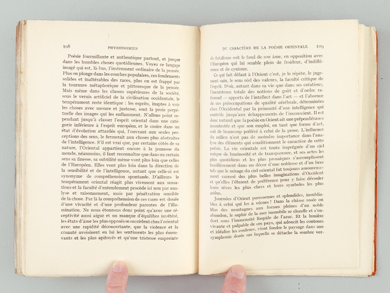 Exemplaire sur vélin bouffant numéroté, 1 vol. in-12 br., Collection La Phalange, Albert Messein, Paris, 1934, 124 pp. et 2 ff. Commentaire : Dédicace du diplomate, écrivain et essayiste Alexandre Embiricos à Madame de Wrède. Les 6 études critiques sont consacrées à Henri de Régnier, Bernard Shaw, Paul Valéry, Paul Claudel, Costis Palamas, à la poésie orientale et au Musicisme. Etat satisfaisant (mq. en coiffe sup., bon état par ailleurs).