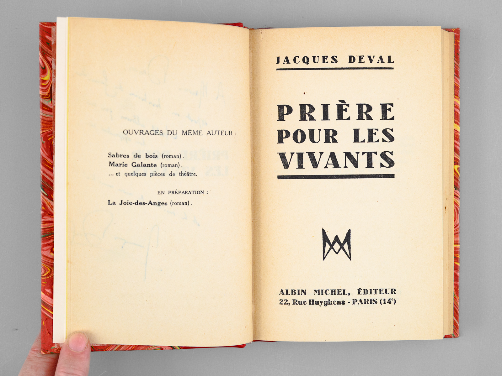 1 vol. in-12 reliure demi-chagrin rouge, dos à 5 nerfs, couvertures conservées, Editions Albin Michel, Paris, 1934, 249 pp. Commentaire : Envoi de Jacques Deval à 'Maurice Druon, expert en histoires de familles, ce petit album qui ne lui apprendra rien'. Bon exemplaire bien relié, de superbe provenance, dédicacé au futur Secrétaire Perpétuel de l'Académie Française Maurice Druon, auteur des 'Grandes familles' et des 'Rois Maudits'. Ecrivain et réalisateur, Jacques Deval est le père des écrivains Gérard de Villiers et Bernard Eschasseriaux.