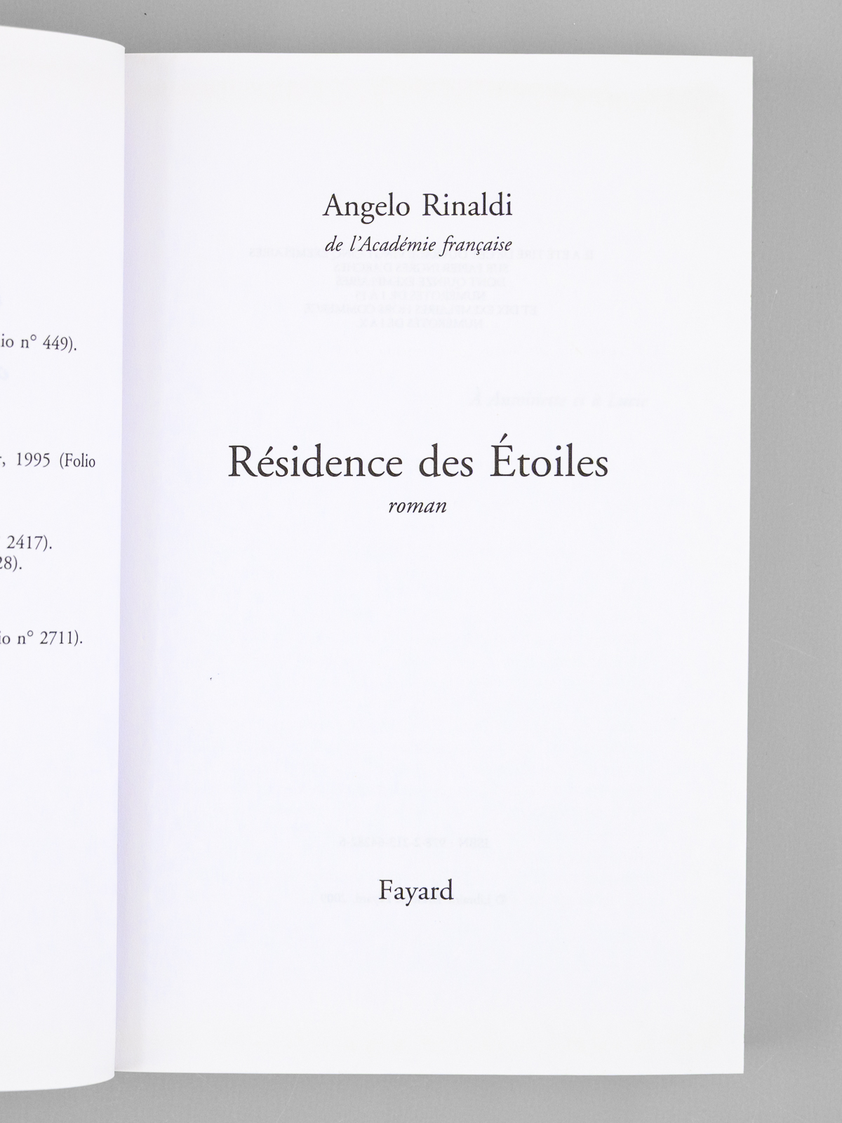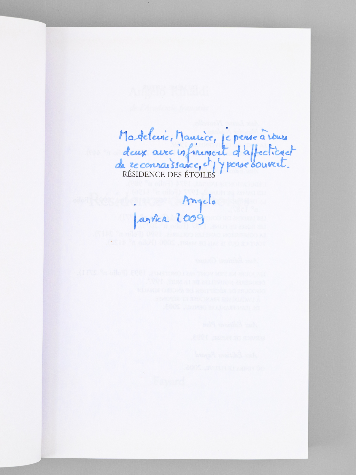 Envoi ms. de l'auteur, 1 vol. in-8 br. sous jaquette illustrée, Fayard, Paris, 2009, 320 pp. Commentaire : Bel envoi d'Angelo Rinaldi : 'Madeleine, Maurice, je pense à vous deux avec infiniment d'affection et de reconnaissance, et j'y pense souvent'. Bon état pour cet exemplaire du tirage ordinaire (après 25 Arches), venant de la bibliothèque de Maurice Druon, Secrétaire Perpétuel de l'Académie Française de 1985 à 1999.