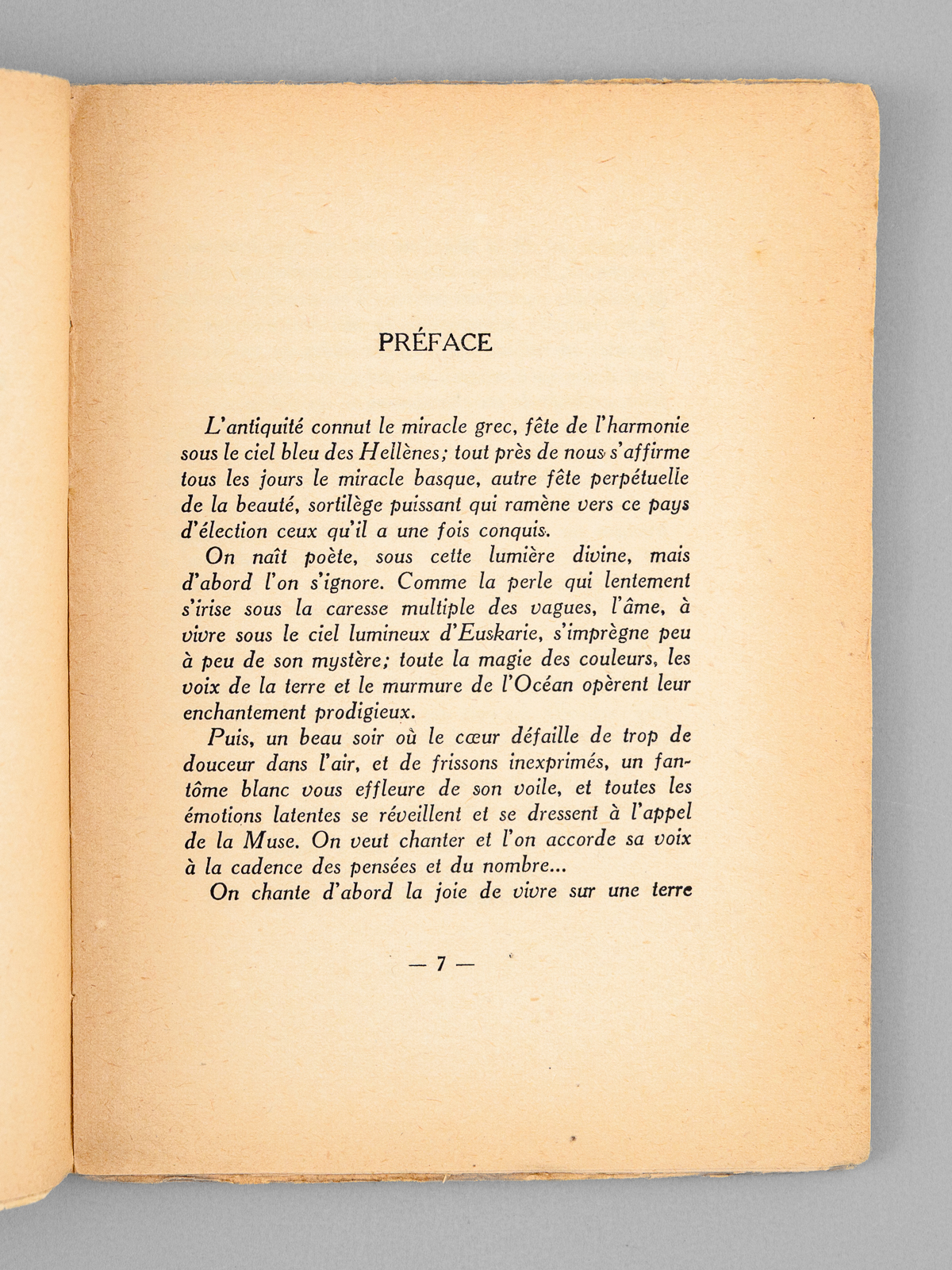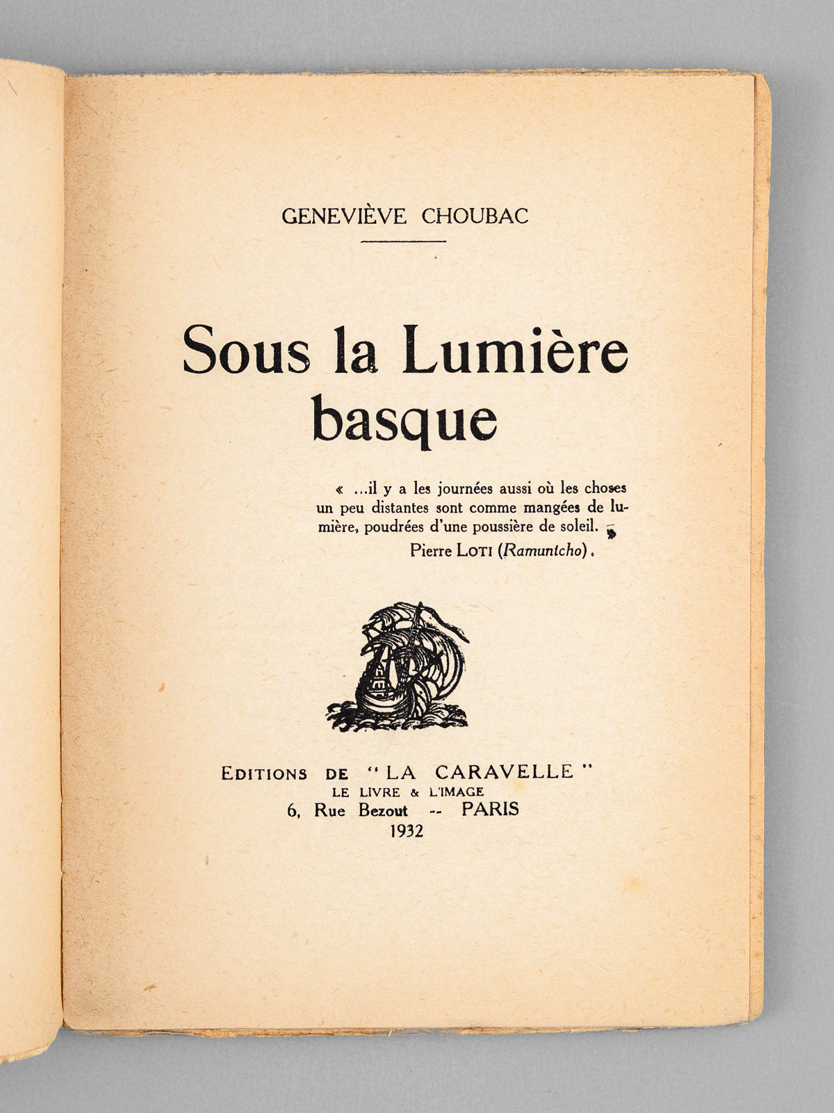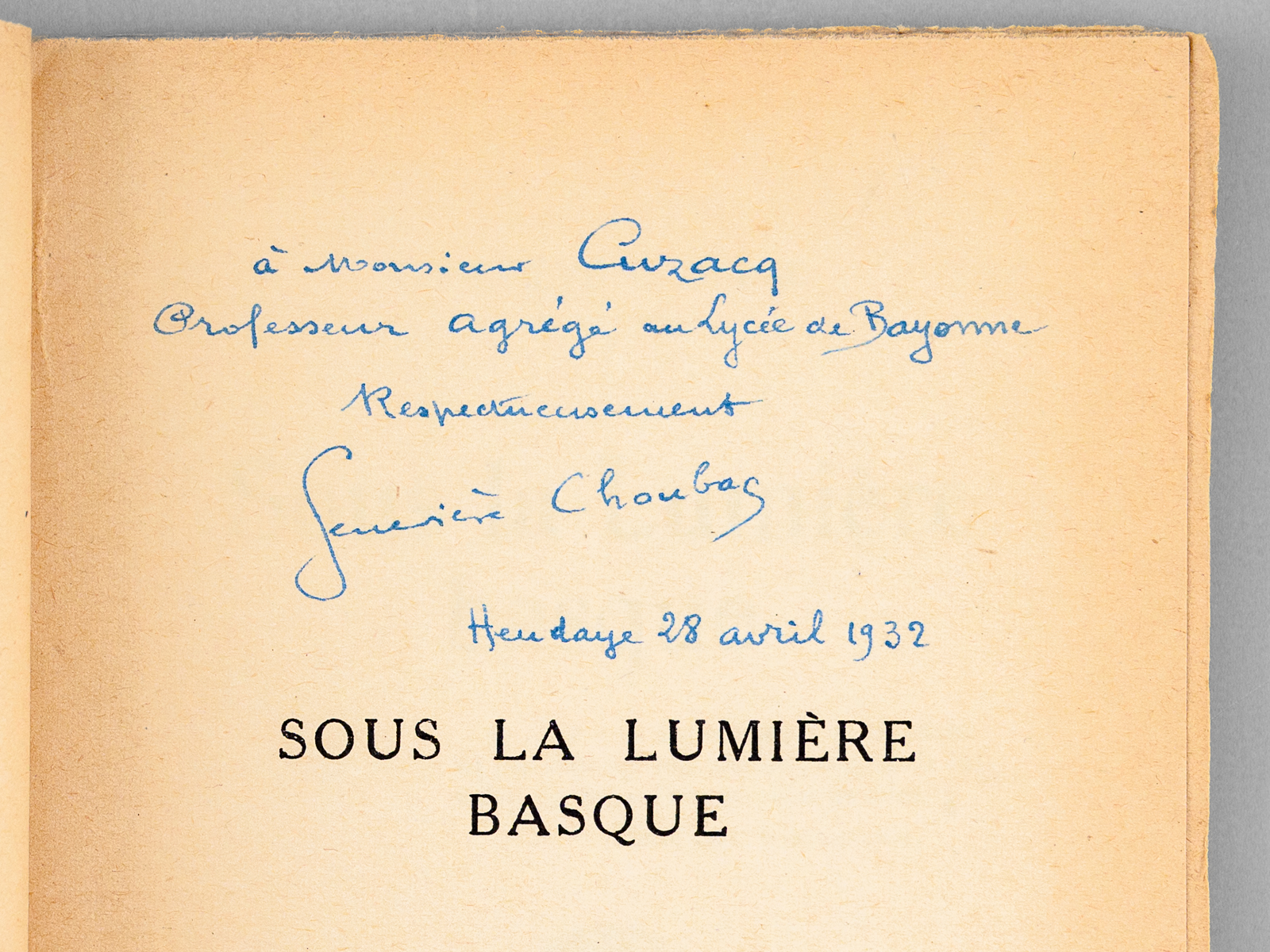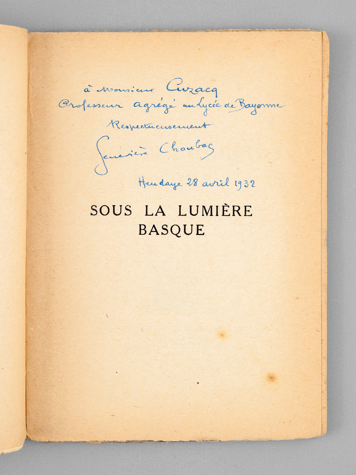 Commentaire : L'image de couverture évoque '« Bakharetchea » - la très blanche et pensive Demeure de Loti...'. L'ouvrage est dédicacé à René Cuzacq, professeur agrégé au Lycée de Bayonne. L'auteur a précisé son adresse en titre: 'Le Figuier, Hendaye'. Etat très satisfaisant (qq. rouss., couv. lég. frottée)
