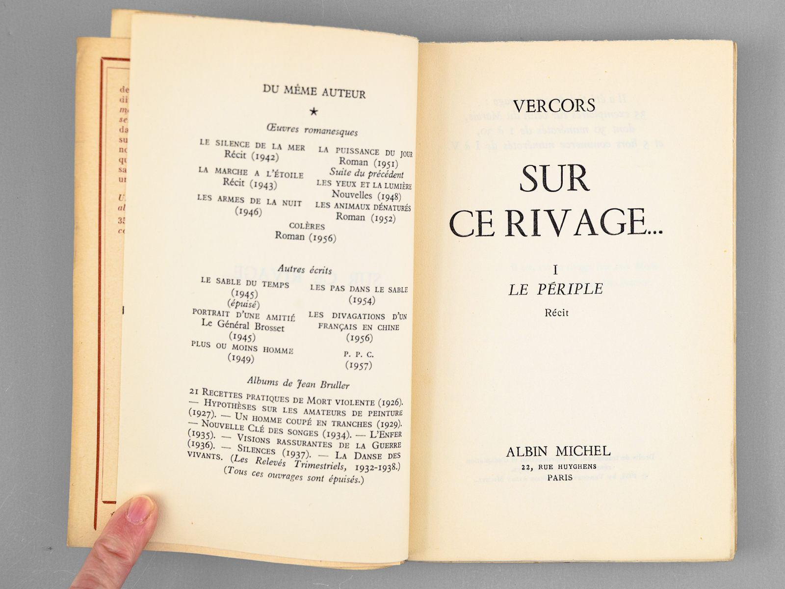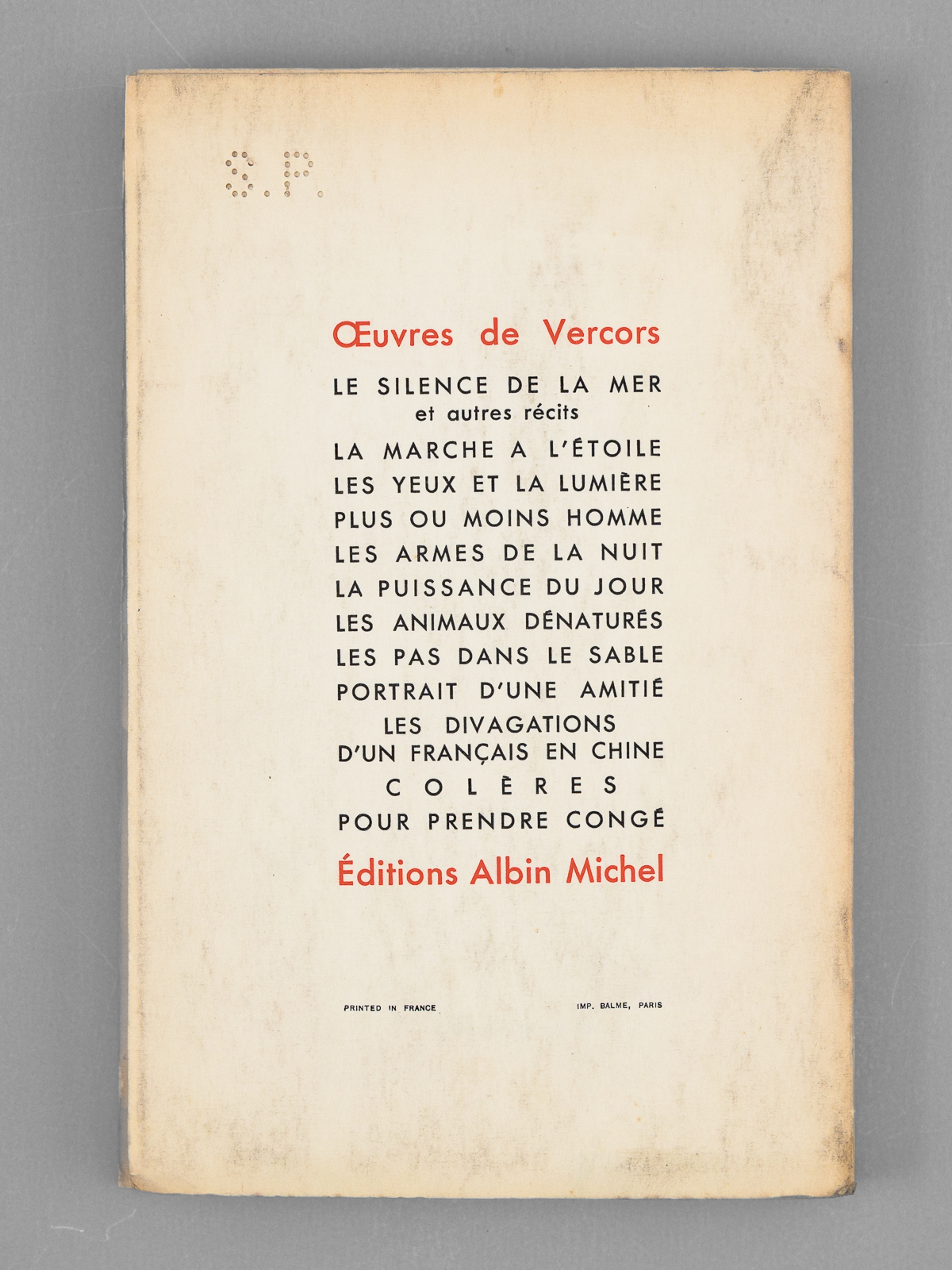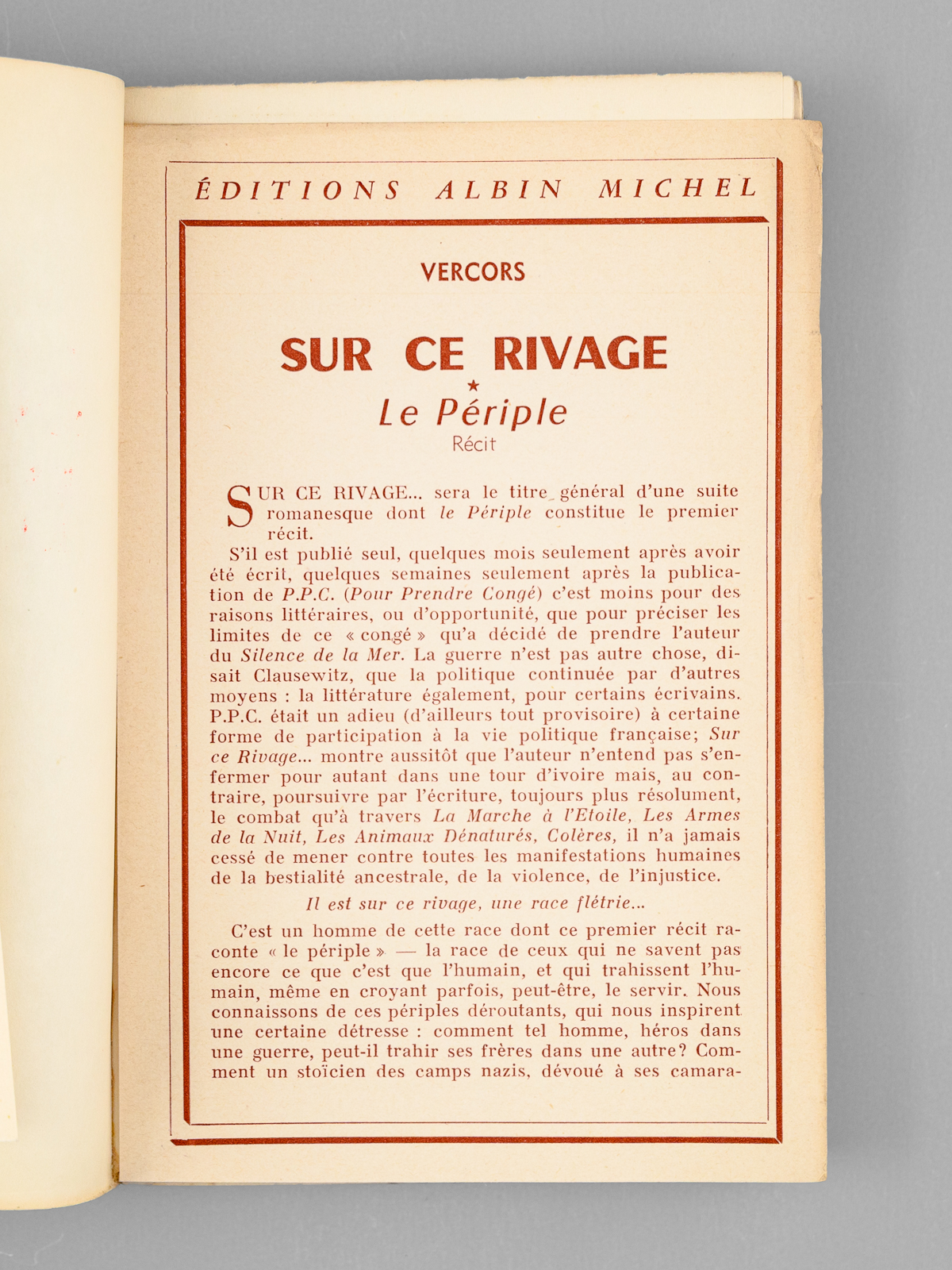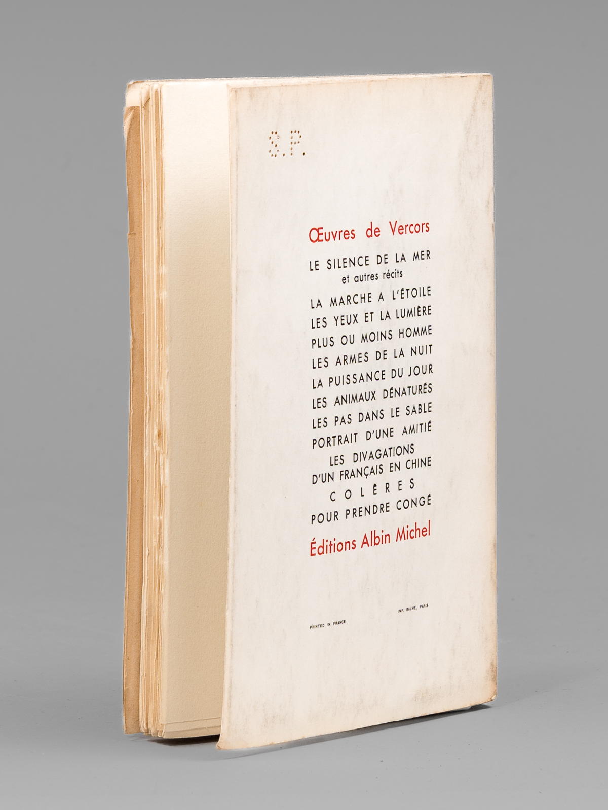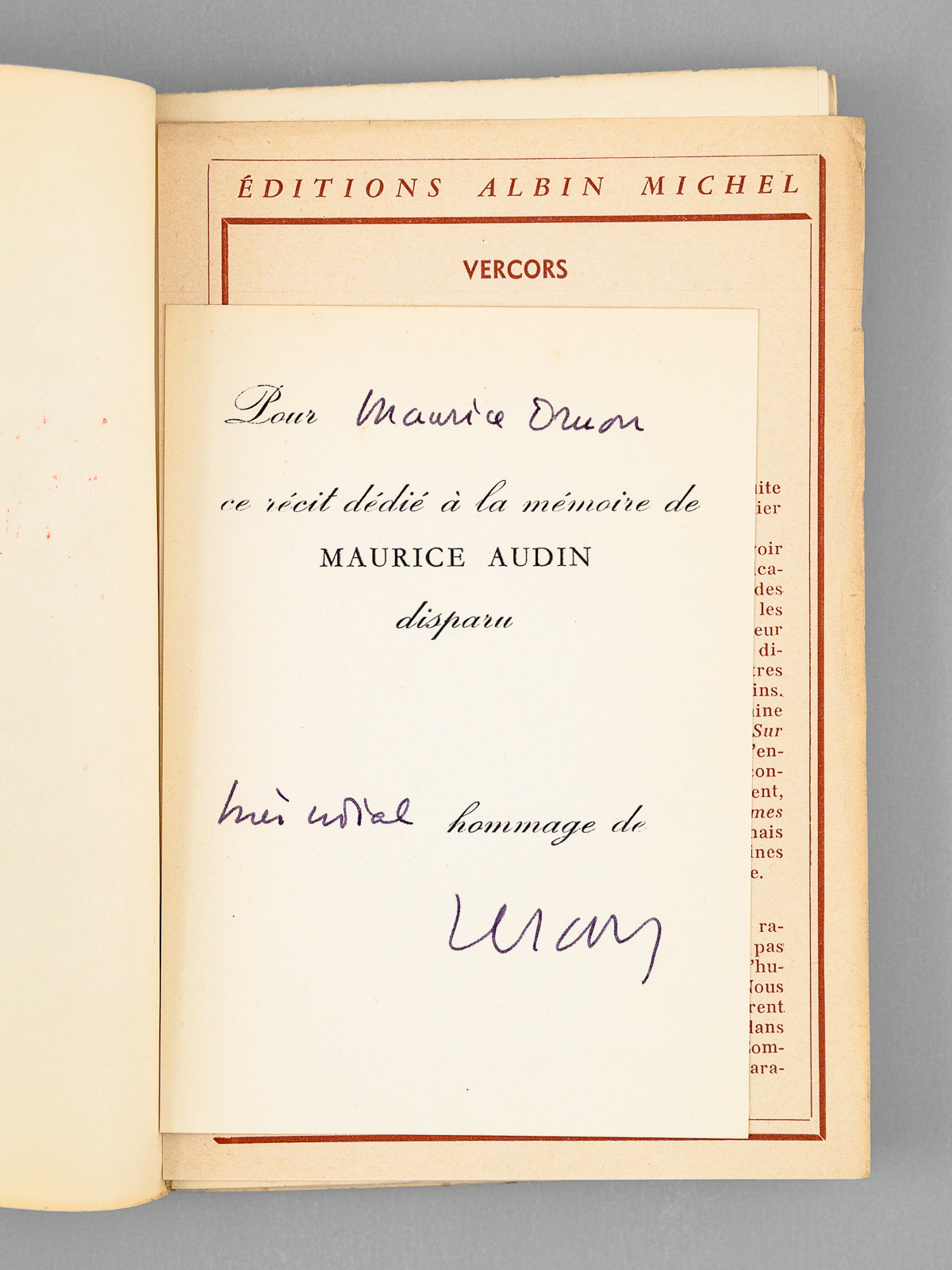 Exemplaire du service de presse marqué S.P., 1 vol. in-12 br., Albin Michel, Paris, 1958, 156 pp. Commentaire : L'ouvrage est complet du 'Prière d'insérer' et on joint un carte pré-imprimée, remplie par Vercors : 'Pour Maurice Druon, ce récit dédié à la mémoire de Maurice Audin disparu, très cordial hommage de Vercors'. Bon état pour le premier tome de cette série. L'ouvrage est consacré au thème de la torture : comment un ancien résistant devient un tortionnaire... Superbe provenance, de la bibliothèque du grand écrivain Maurice Druon, Secrétaire Perpétuel de l'Académie Française de 1985 à 1999 et immortel auteur avec son oncle Joseph Kessek du 'Chant des Partisans' .