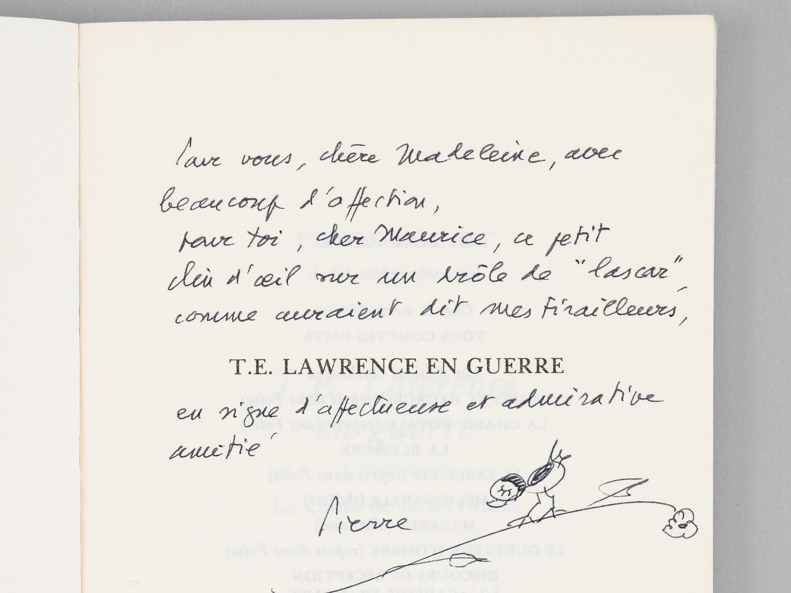 1 vol. in-12 br., Quai Voltaire, 1994, 83 pp. Commentaire : Envoi illustré de l'auteur à Maurice Druon et à son épouse : 'Pour vous, chère Madeleine, avec beaucoup d'affection, pour toi cher Maurice, ce petit clin d'oeil sur un drôle de 'lascar' comme aurait dit mes tirailleurs. En signe d'affectueuse et admirative amitié. Pierre [et dessin de moineau] ' Bon état. Maurice Druon (1918-2009), neveu de Joseph Kessel, fut résistant, écrivain auteur notamment de la saga des Rois maudits, homme politique. Elu à l'Académie Française en 1968, il en devint le Secrétaire Perpétuel en 1985. Quant à Pierre Moinot, résistant puis haut-fonctionnaire, il fut élu à l'Académie en 1982. Exemplaire avec un bel envoi à un destinataire prestigieux.