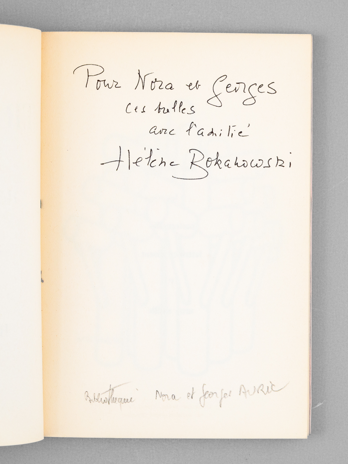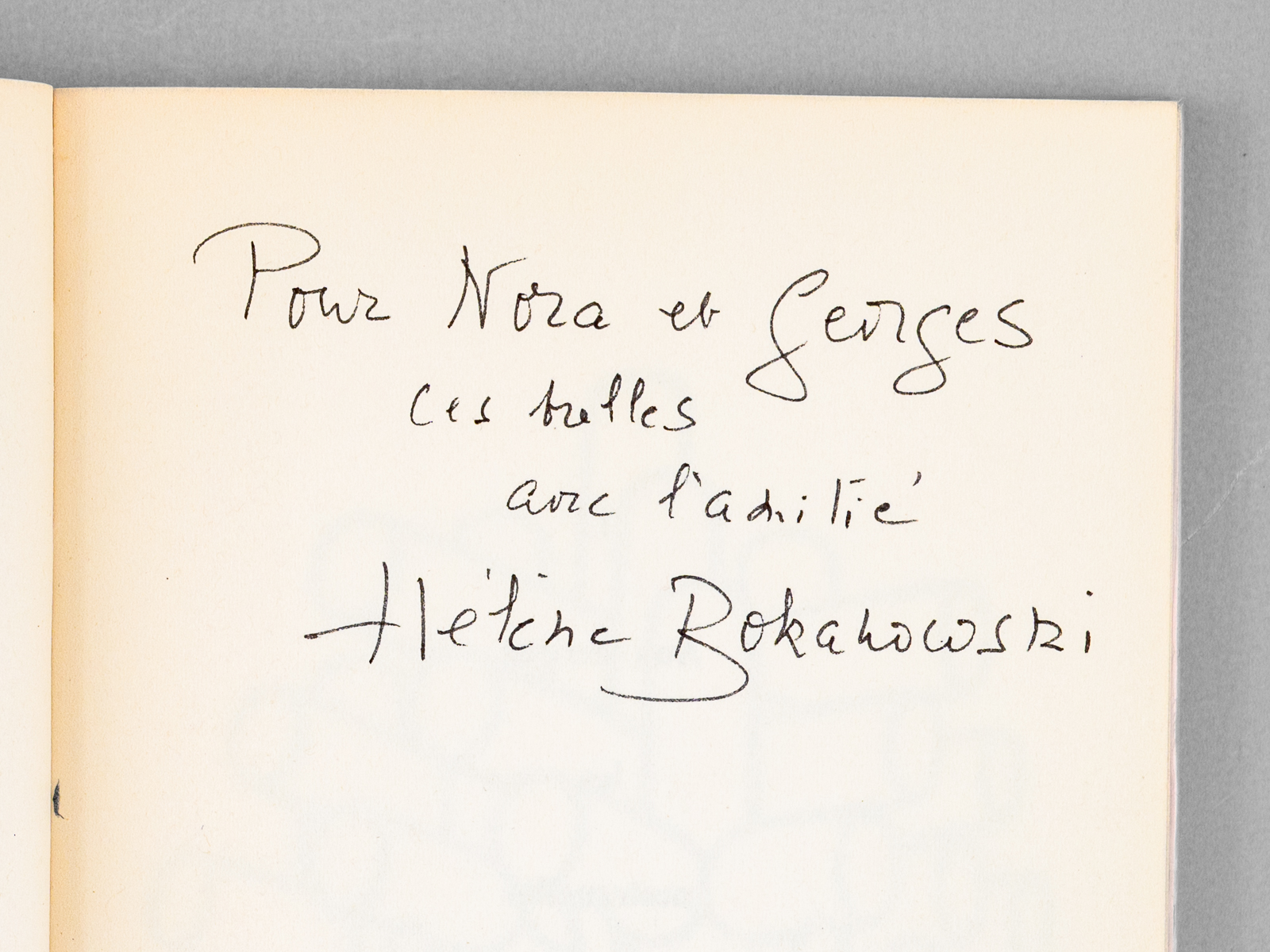 En voi ms. de l'auteur, un des 200 exemplaire H.C. sur vélin d'Arches, 1 vol. in-12 br., DB Dominique Bedou, 1979. 24 poèmes, avec pour chacun un dessin en vis-à-vis. Commentaire : Très bon état pour cet exemplaire dédicacé au compositeur Georges Auric (1899-1983) et à son épouse, la peintre et décoratrice Nora Auric (Eleanore Vilter dite, 1930-1982) : 'Pour Nora et Georges, ces bulles avec l'amitié'. L'auteur, Hélène Bokanowski (1910-2000) était la nièce du grand collectionneur d'art Alphonse Kann, et l'épouse de Michel Maurice-Bokanowski, député-maire d'Asnières (Hauts-de-Seine) et ministre sous de Gaulle puis Pompidou.