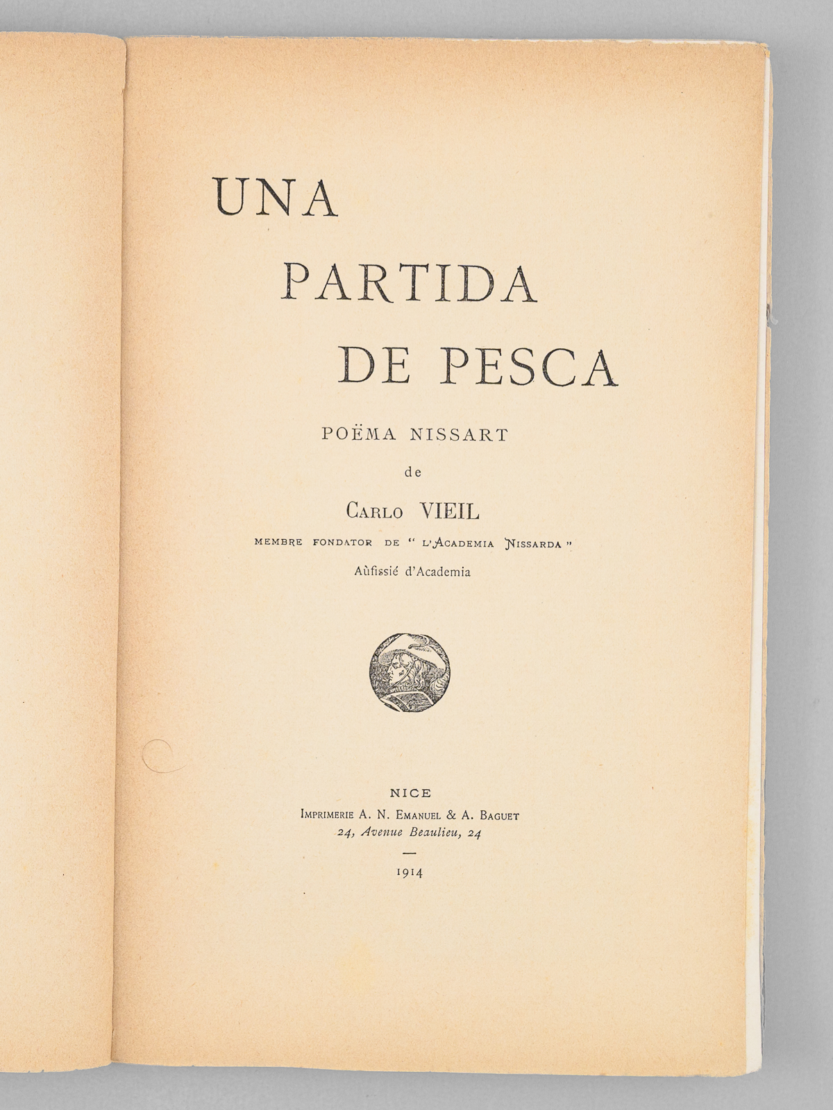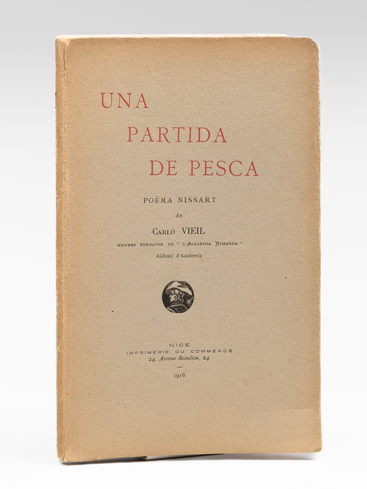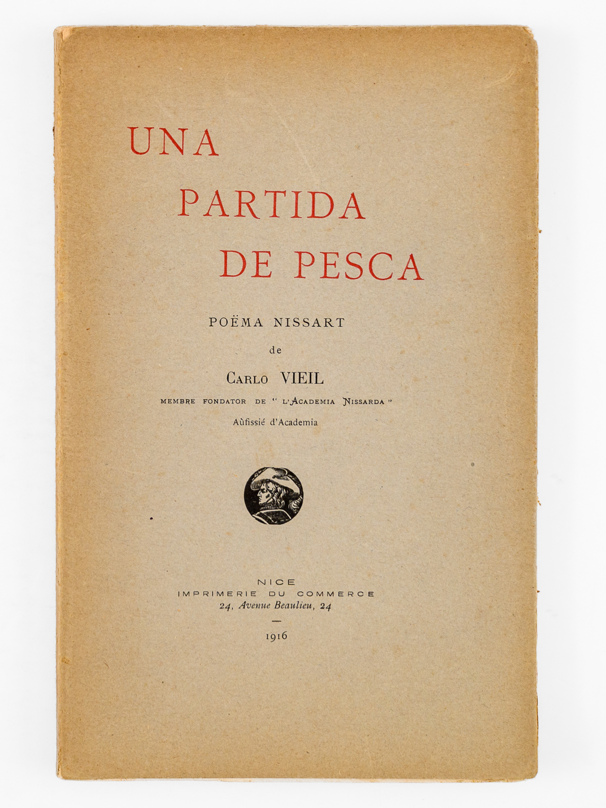 De Carlo Vieil, Membre fondator de 'L'Academia Nissarda', Aùfissié d'Academia, 1 vol. in-8 br., , Nice, Imprimerie A.N. Emanuel & A. Baguet, 1914 (Imprimerie du Commerce, 1916 en couverture), Nice, 107 pp.