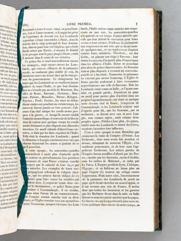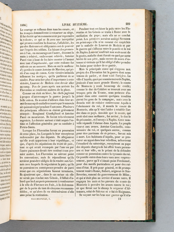 Avec une notice biographique, par J.A.C. Buchon, 1 vol. in-4 reliure demi-veau vert, dos à 5 nerfs plats ornés, tranches marbrées, Auguste Desrez, Paris, 1837, LXVIII-648 et 698 pp.. Rappel du titre complet : Oeuvres complètes de N. Macchiavelli (2 Tomes - Complet) Tome I : Ouvrages Historiques. Ouvrages relatifs à l'art militaire. Ouvrages philosophiques et politiques ; Tome II : Ouvrages dramatiques. Poésies diverses. Oeuvres diverses en prose. Légations et missions. Correspondance. Commentaire : Complet. Agréable exemplaire (restauration discrète en dos, dos insolés, qq. rouss., très bon état par ailleurs) pour cette édition peu commune des oeuvres complètes de Machiavel (en français)