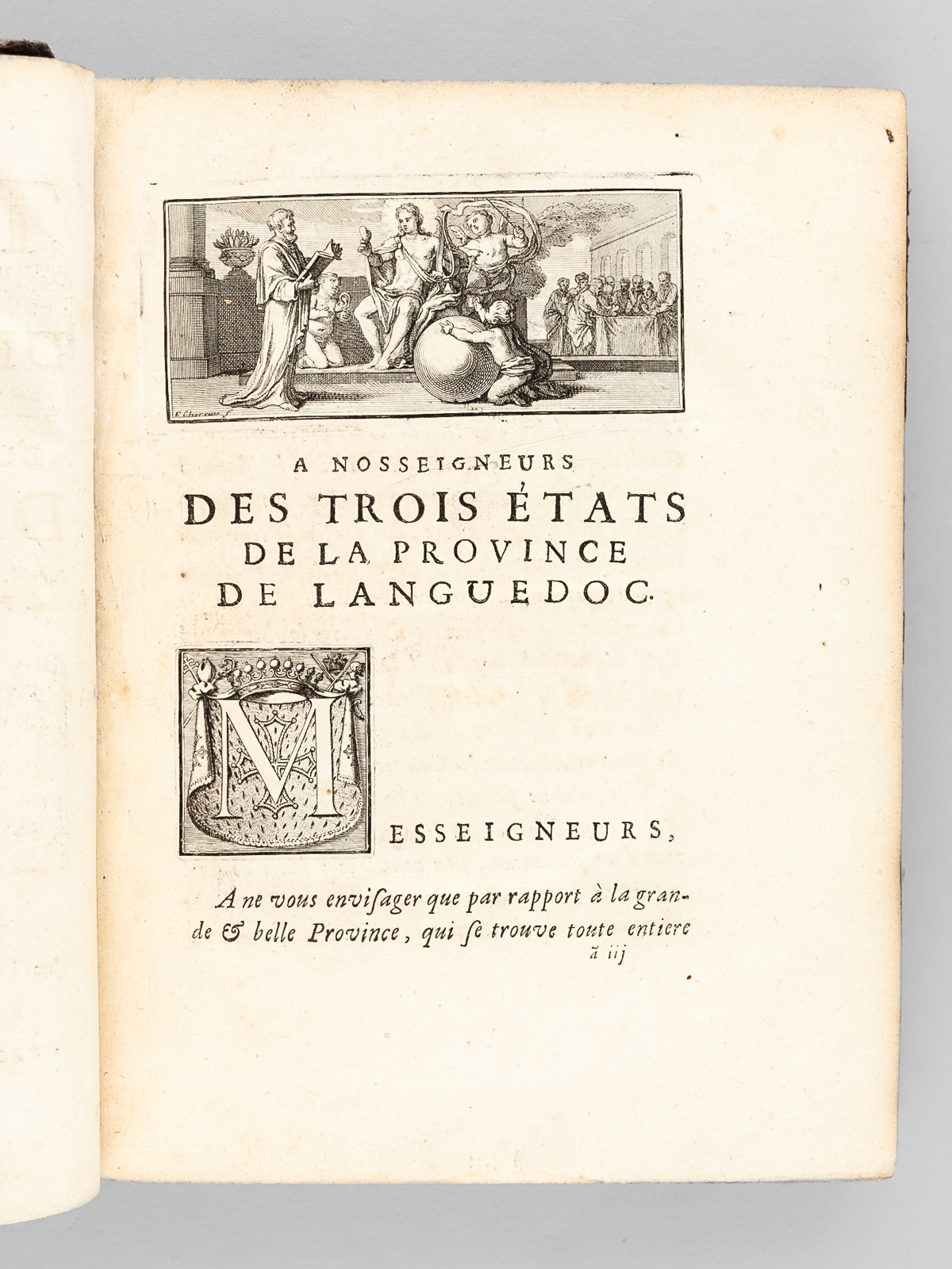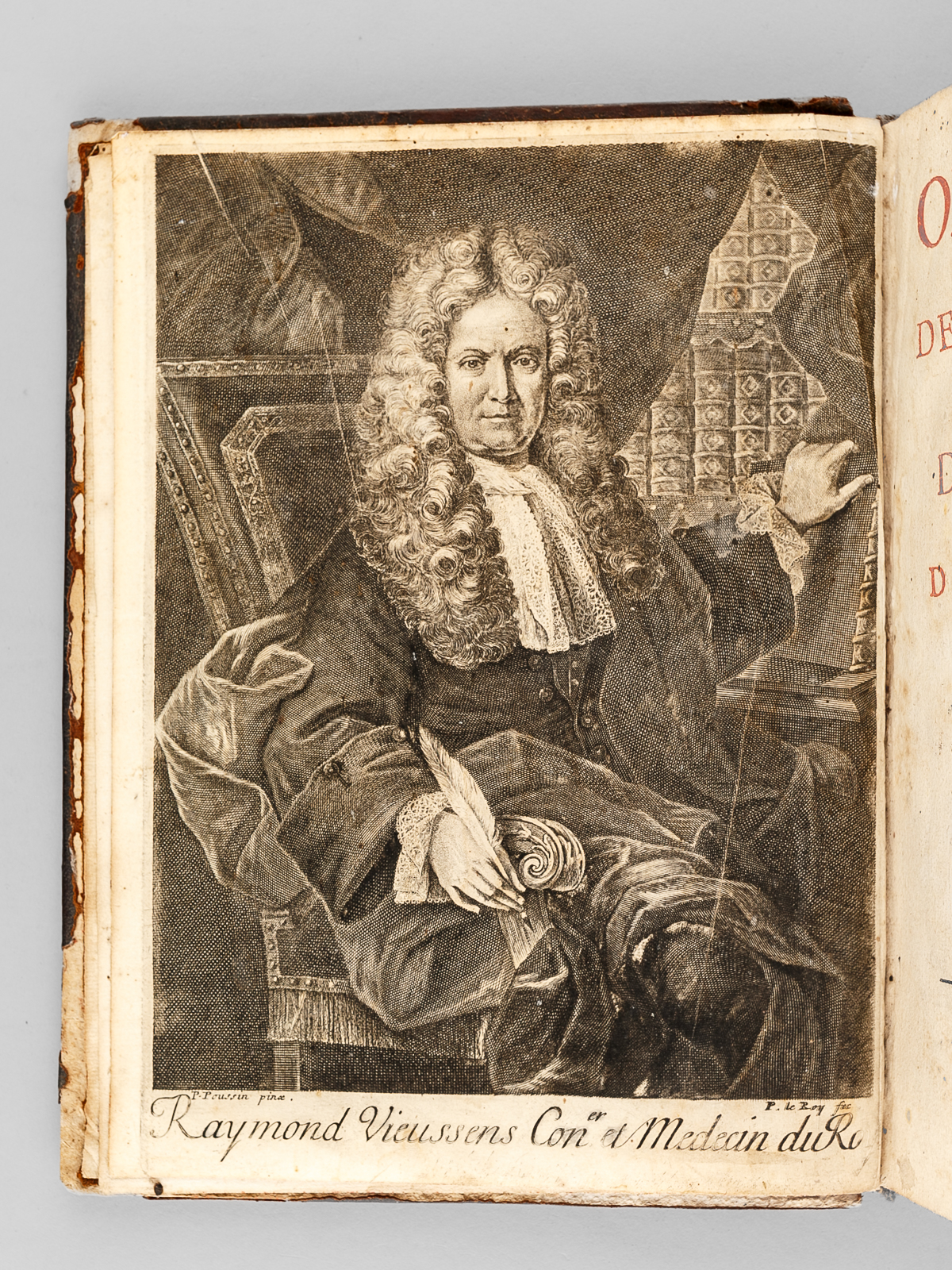Oeuvres Françoises de M. Vieussens dediées à Nosseigneurs des Etats de la Province de Languedoc (3 Titres en 2 Volumes - Complet), en 2 vol. in-4 reliure de l'époque pleine basane marron, dos à 5 nerfs orné, avec DANS LE PREMIER VOLUME : Traité Nouveau de la Structure et des Causes du Mouvement Naturel du Coeur. Première édition et Traité Nouveau de la Structure de l'Oreille. Première édition, Chez Jean Guillemette, Toulouse, 1715 (Coeur) et 1714 (Oreille), portrait de Vieussens par Poussin en frontispice, titre général (avec belle vignette aux armes du Languedoc), titre du Traité du Coeur (avec belle vignette allégorique), 4 ff. (Epistre avec beau bandeau et letre historiée), 8 ff. (préface et privilège), 1 f. (Tables), 141 pp., 5 ff. n. ch. (faux-titre du Traité de l'Oreille et tables), 1 f. (Titre), 5 ff. (Préface, Epistloa et Table des Chapitres), 102 pp. et 3 ff. n. ch. (Tables), avec les 14 planches dépliantes du Traité du Coeur (2 planches numérotées 11), et les 6 planches du Traité de l'Oreille - Et DANS LE SECOND VOLUME : Traité Nouveau des Liqueurs du Corps Humain. Première édition. Chez Jean Guillemette, Toulouse, 1715 , 2 ff. (titre général et titre du Traité des Liqueurs), 4 ff. (Préface et tables), 388 pp., 8 ff. n. ch. (tables) et 1 f.blanc, avec insertion de 2 ff. paginés de 255* à 258 * entre les pages 386 et 387, et avec 1 planche 'dessinée par M. Lafon et gravée par Simonneau'