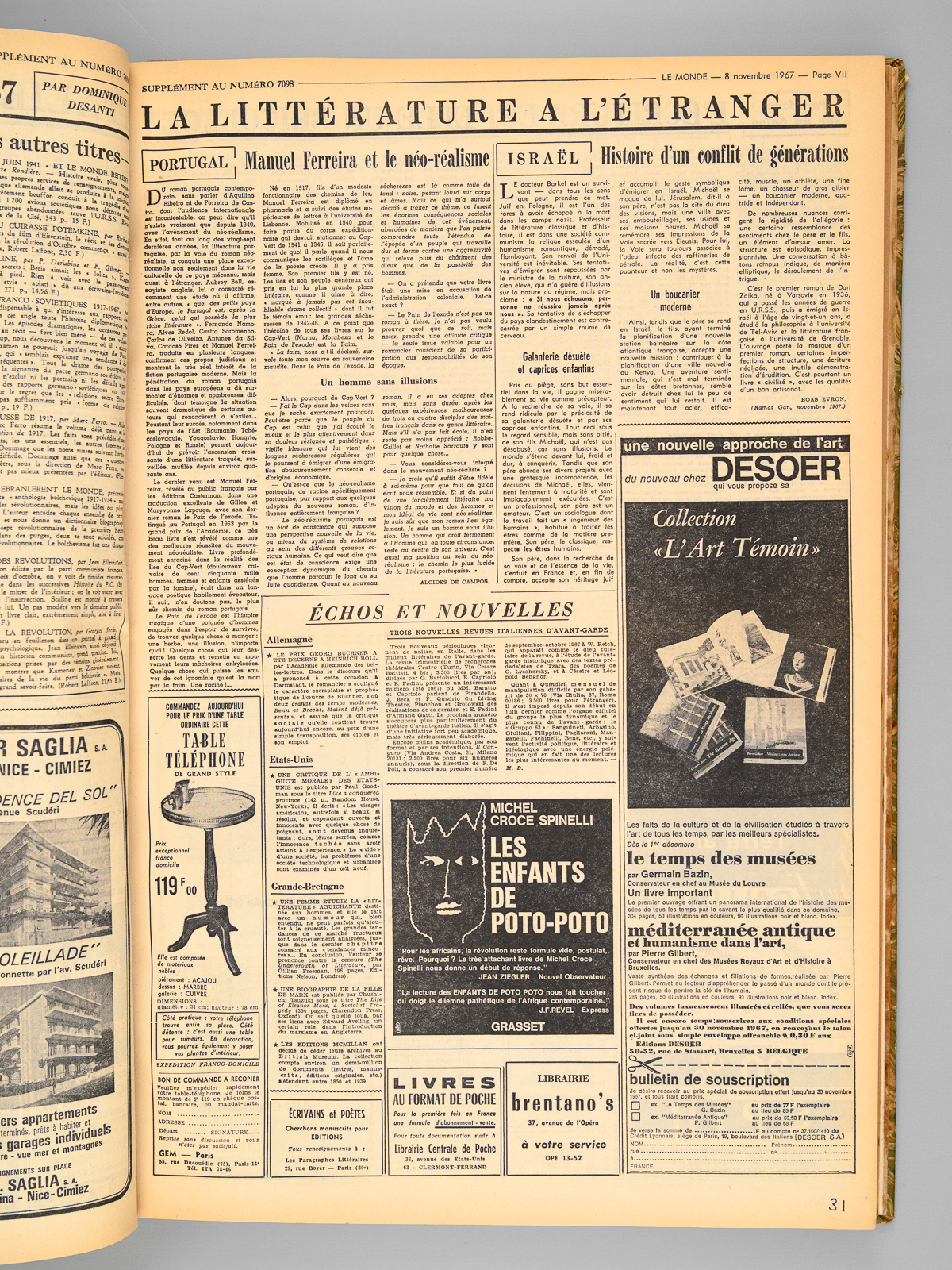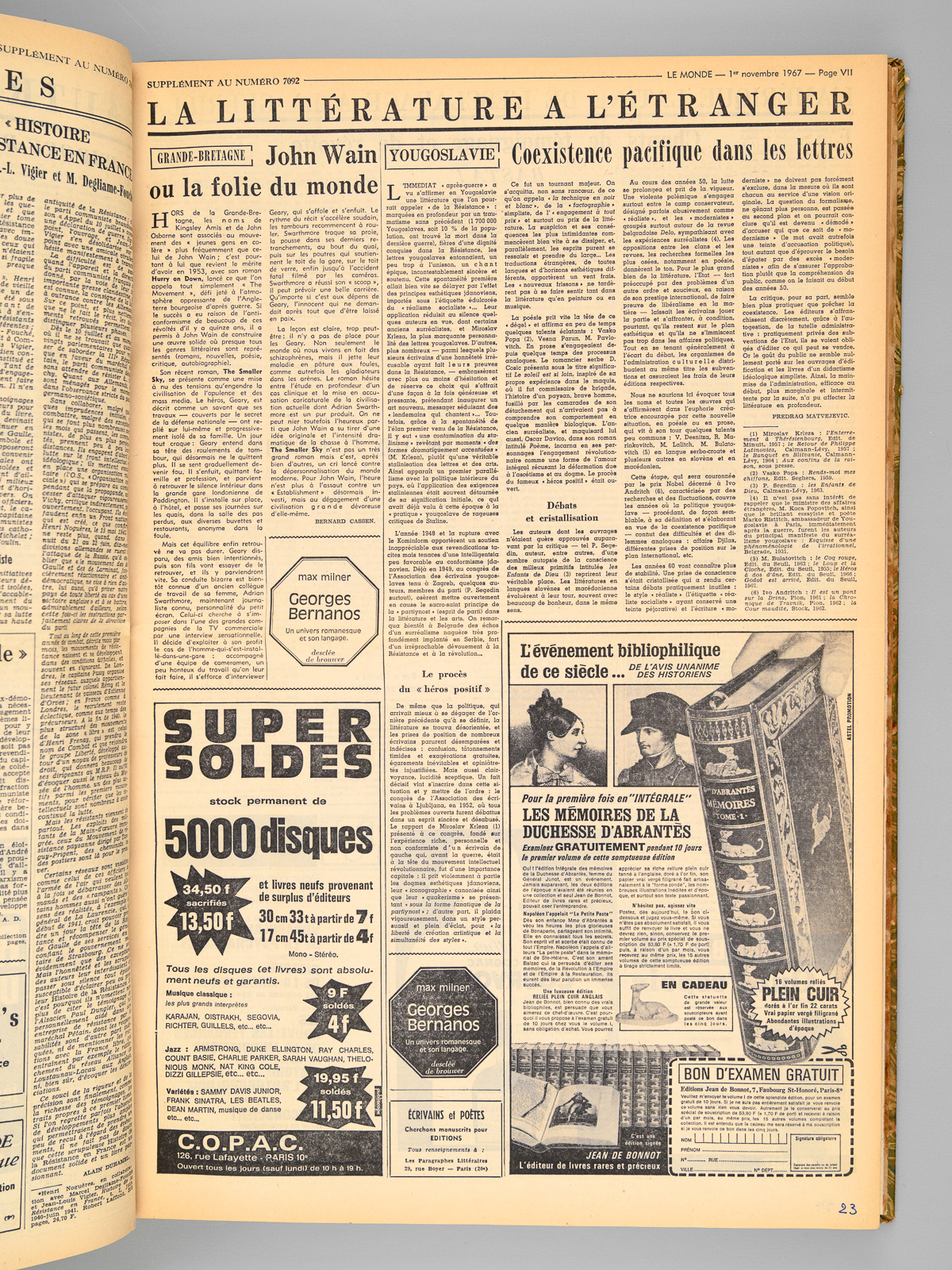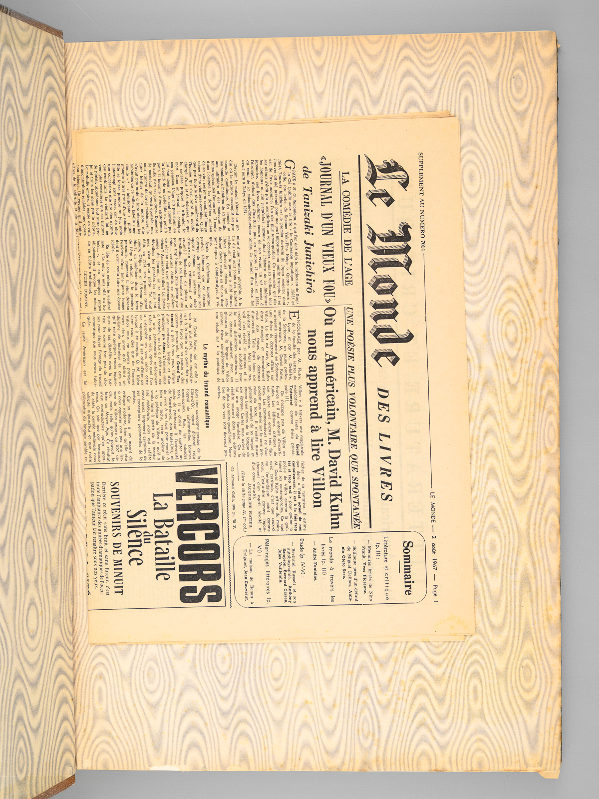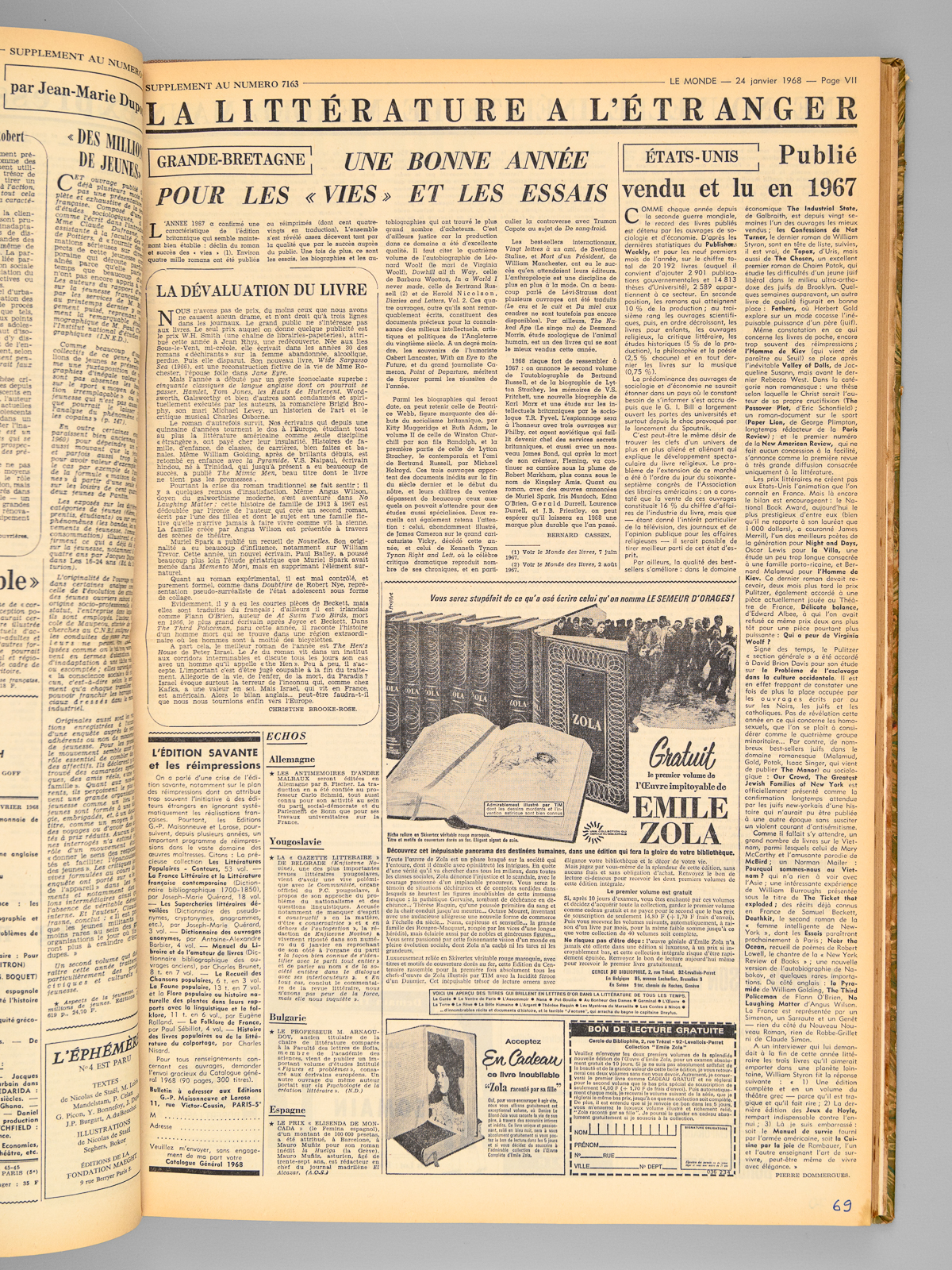 Commentaire : Exemplaire relié du supplément littéraire du Journal 'Le Monde', non suivi, réunissant 41 numéros pour la fin de l'année 1967 et l'année 1968 (on joint le numéro du 17 août 1968, volant). Bon état. Une lecture passionnante que celle de ce supplément littéraire, dont le format a rarement conduit à sa conservation.