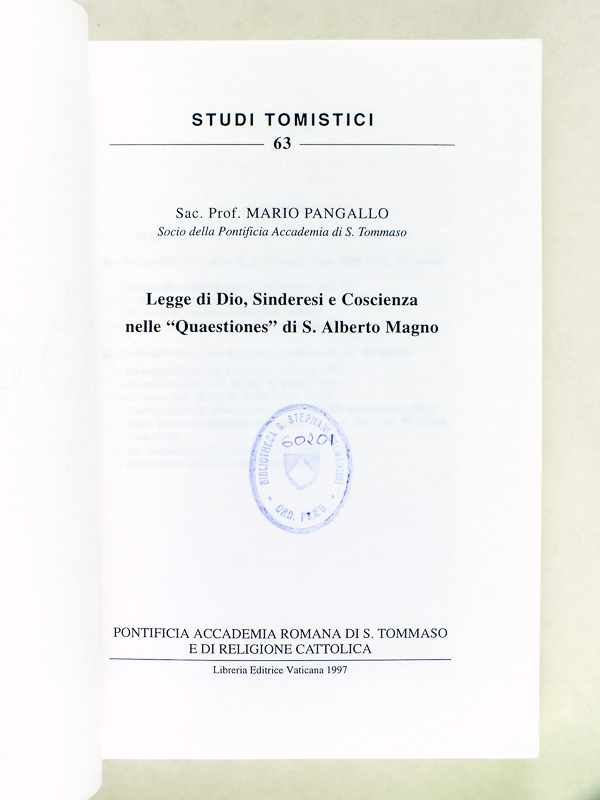 1 vol. in-8 br., coll. Studi Tomistici, Pontificia Academia Romana di S. Tommaso e di Religione Cattolica, 1 vol. in-8 br., Libreria Editrice Vaticana, 1997, 331 pp. Commentaire : Etat très satisfaisant (ancien cachet de bibliothèque et étiquette de cote au dos en queue).