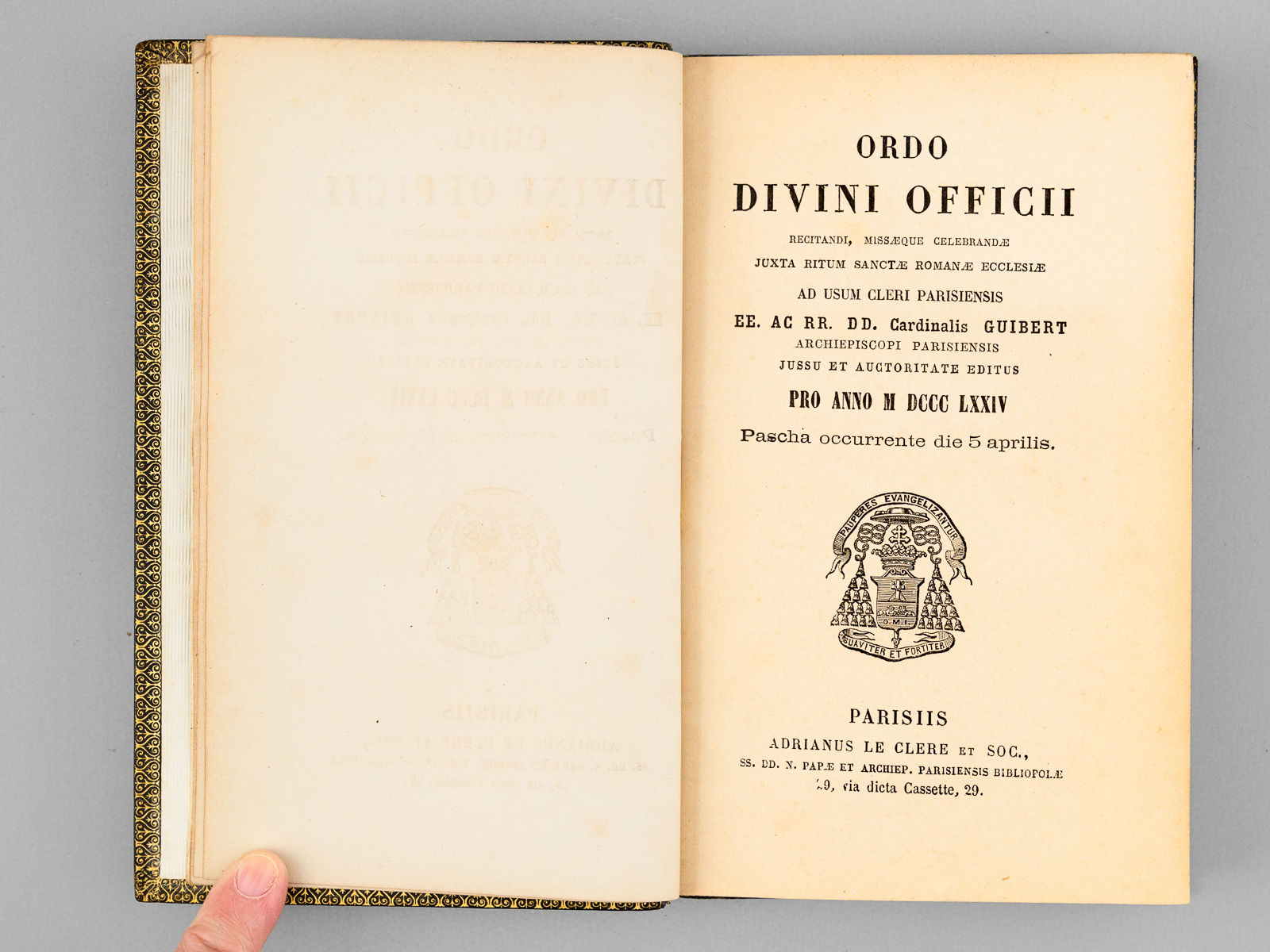Commentaire : Bon ensemble (ex libris moderne en garde, très bon état par ailleurs). L'ordo est le calendrier annuel des offices, pour un diocèse. Mais il est complété par un Etat des Cures et Succursales du diocèse de Paris, qui permet de suivre l'historique du clergé ainsi que la population de chaque paroisse. Il contient aussi une nécrologie du clergé du diocèse. L'ensemble proposé ici était destiné au clergé du diocèse de Paris, alors confié au Cardinal Guibert. Le Cardinal Guibert fut archevêque de Paris, de 1871 à 1886, succédant à Mgr Darboy, fussilé par les Communards.
