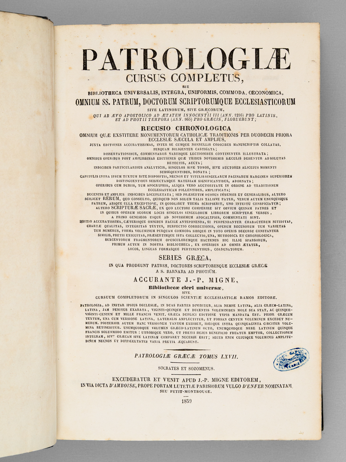 Accurante et denuo recognoscente J.P. Migne, 1 vol. in-4 reliure de l'époque demi-chagrin vert, dos à 4 nerfs dorés, Apud J.P. Migne, Petit-Montrouge, 1859, 1724 colonnes Rappel du Titre complet : Socratis Scholastici, Hermiae Sozomeni Historia Ecclesiastica (1 Tome - Complet). Patrologiae Cursus completus. Series Graeca. Tomus LXVII [ Patrologia Graeca Tome 67 - Socrate le Scolastique et Sozomène ] Commentaire : Rare exemplaire en bon état, bien relié, du tome 67 de la Patrologie grecque de Migne, bien complet des oeuvres de Socrate le Scolastique et Sozomène. Avec le texte grec et la traduction latine en regard (coupes lég. frottées, ancien cachet de monastère, rares rouss., très bon état par ailleurs). Peu commun, surtout en si bon état. A rare, well-bound, and in good condition copy of Volume 67 of Migne's Greek Patrology, complete with the Works of Socrates Scholasticus and Sozomenus. With the Greek text and the Latin translation opposite.