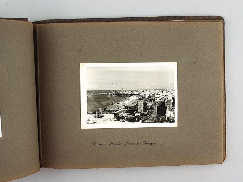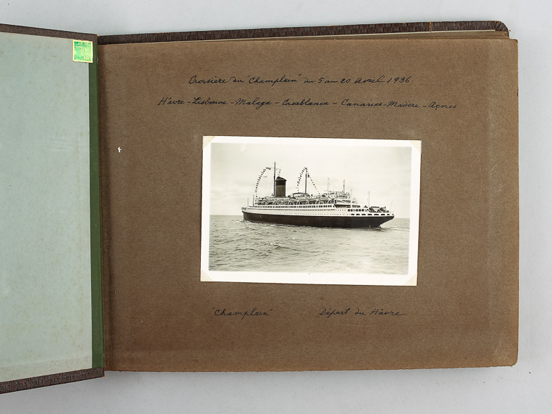 Album photo oblong format, avec 24 photos format Contient : Album Photo : Croisière du 'Champlain' du 5 au 20 avril 1936 Le Havre - Lisbonne - Malaga - Casablanca - Canaries - Madère - Açores [ Contient : ] Champlain Départ du Havre - Lisbonne. Cathédrale Le cloître - Cintra Le château - Entre Malaga et Grenade - L'Alhambra - Gitanes à l'entrée des jardins du Generalife - Gibraltar - Rabat. Jardin des Oudayas - Canaries. Pic de Teyde - Vieille femme au jardin botanique d'Orotava - Le Champlain à Funchal - Toboggan de Terreiro da Lucta à Funchal - Chars à boeufs à Funchal - Madère. Toboggan - Le Champlain entre Madère et les Açores. Bénédiction de la mer [Avec Paul Chack, Abbé Guinchard, Commandant Sylvestre, Commissaire Ameil, Mme Cangardel, Mr Coquillat ] - Açores. Punta Delgada - Juan Miguel des Açores. Geysers à Furnas Commentaire : Exploité par la Compagnie Générale Transatlantique, mis en service en juin 1932, le Champlain coulera sur une mine allemande en juin 1940. Bon état (second plat un peu frotté avec pliure, bon exemplaire par ailleurs).
