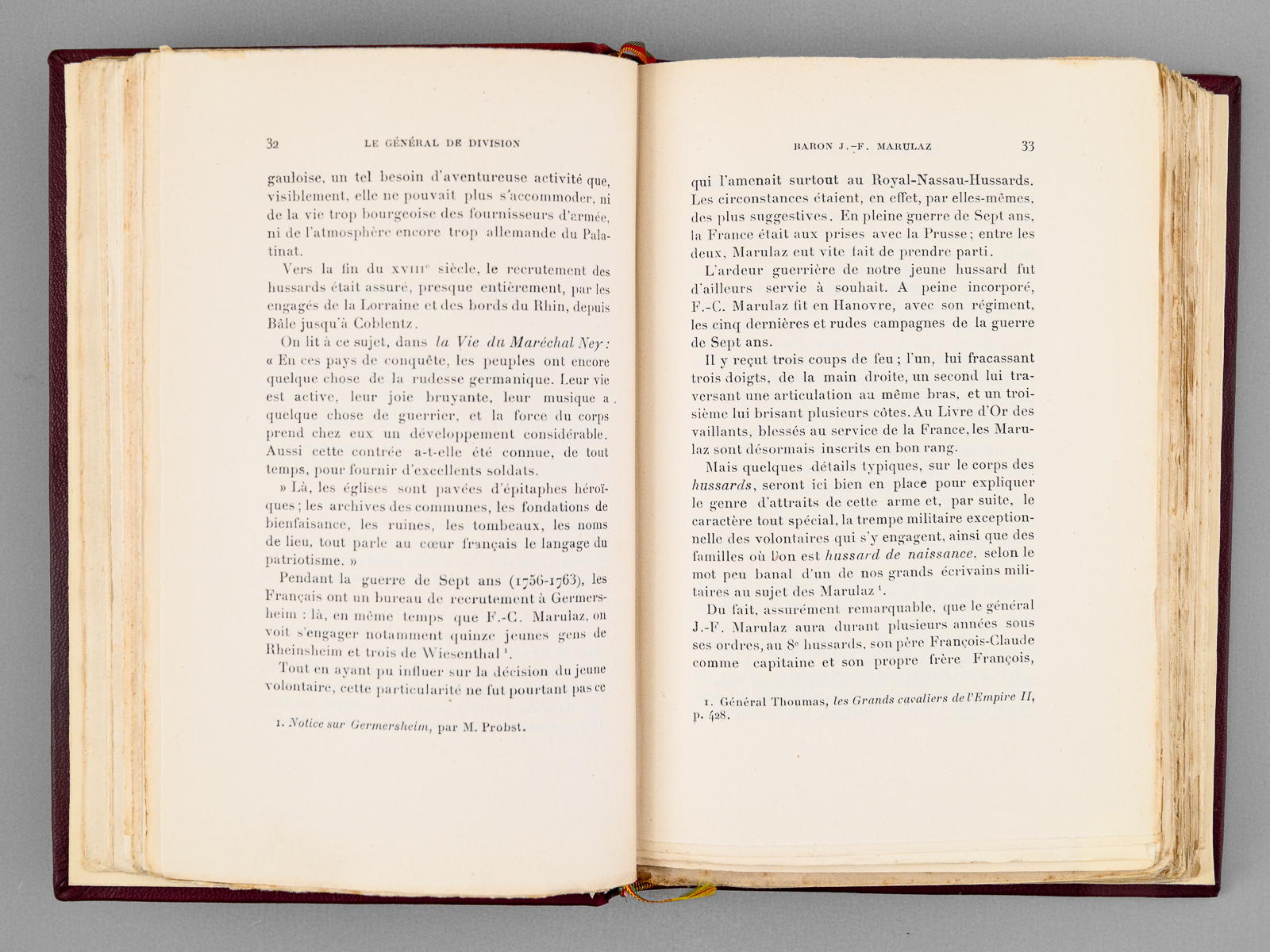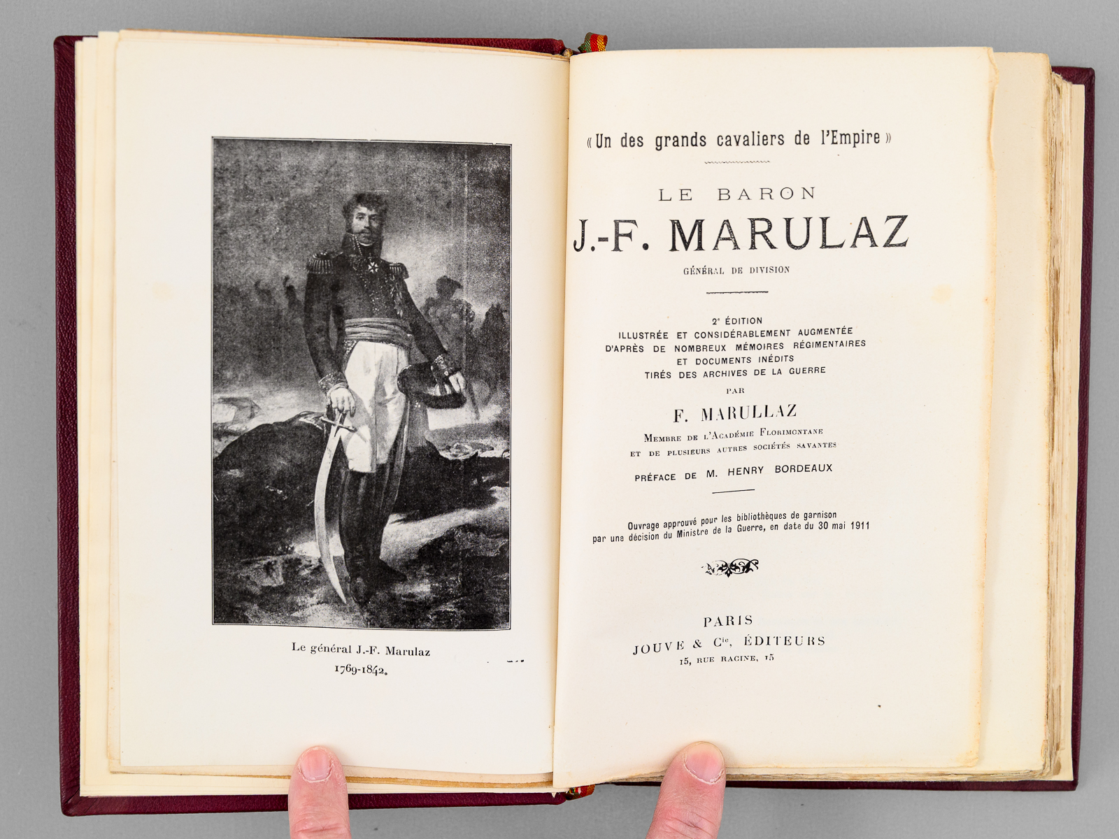 2e édition illustrée et considérablement augmentée d'après de nombreux mémoires régimentaires et documents inédits tirés des Archives de la Guerre, Préface de M. Henry Bordeaux, 1 vol. in-8 reliure postérieure plein chagrin bordeaux, dos à 5 nerfs, couv. conservée, Jouve & Cie, Paris, s.d. [ circa 1918 ], XXIII-552 pp. avec qq. planches hors texte Commentaire : Le général Jacob-François Marola ou Marulaz (1769-1842) charge à Eylau, est blessé à Essling et enlève 11 canons à Wagram, et défend Besançon pendant la campagne de France. Durant toute sa carrière, il reçoit dix-neuf blessures et a 26 chevaux tués sous lui ! Rare et bon exemplaire de la seconde édition très enrichie, en très bon état