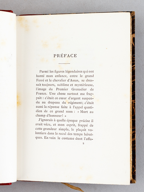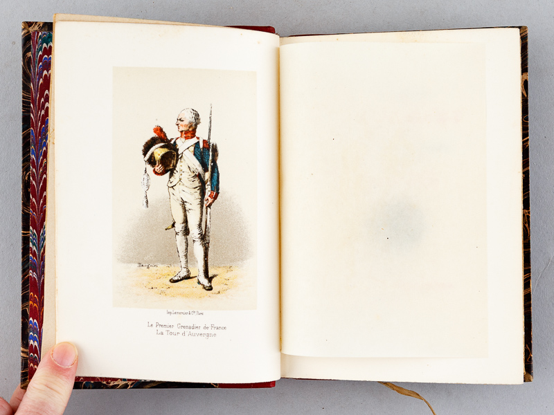 Edouard Detaille, Berne-Bellecour, Le Blant et Baugnies peintres, Ferdinandus dessinateur, Lemercier et Nordmann chromistes, 1 vol. in-12 reliure de l'époque demi-chagrin maroquiné rouge, dos lisse orné en long, tête dorée, double filet doré en mors, Georges Hurtrel, Paris, 1886, 272 pp. Commentaire : Bon état (qq. rouss., brunissure au second mors, très bon état par ailleurs). Militaire français né à Carhaix, Théophile Malo de la Tour d'Auvergne-Corret (1743-1800) reçut de Napoléon le titre de 'premier grenadier de la République'. Sa figure fut très souvent reprise à titre d'exemple sous la Troisième République, par ses partisans comme ici par l'un de ses fameux adversaires., le créateur de la Ligues des patriotes Paul Déroulède.