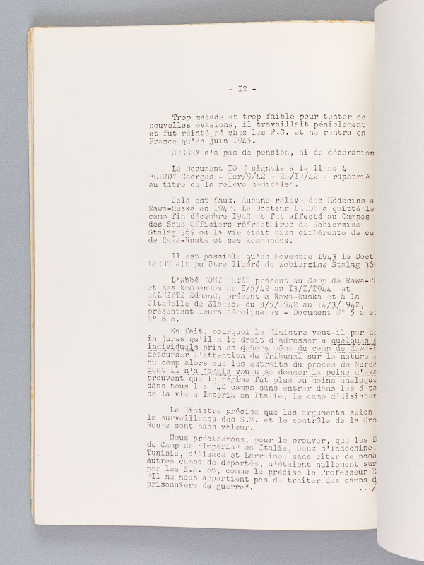 Par le Docteur O. Liévain, Président National de l'Association 'Ceux de Rawa Ruska', 1 vol. in-4 dactylographié et agrafé sous demi-toile, Paris, 68 rue de la Chaussée d'Antin, s.d. [circa 1961 ]10-19-22-5 ff.