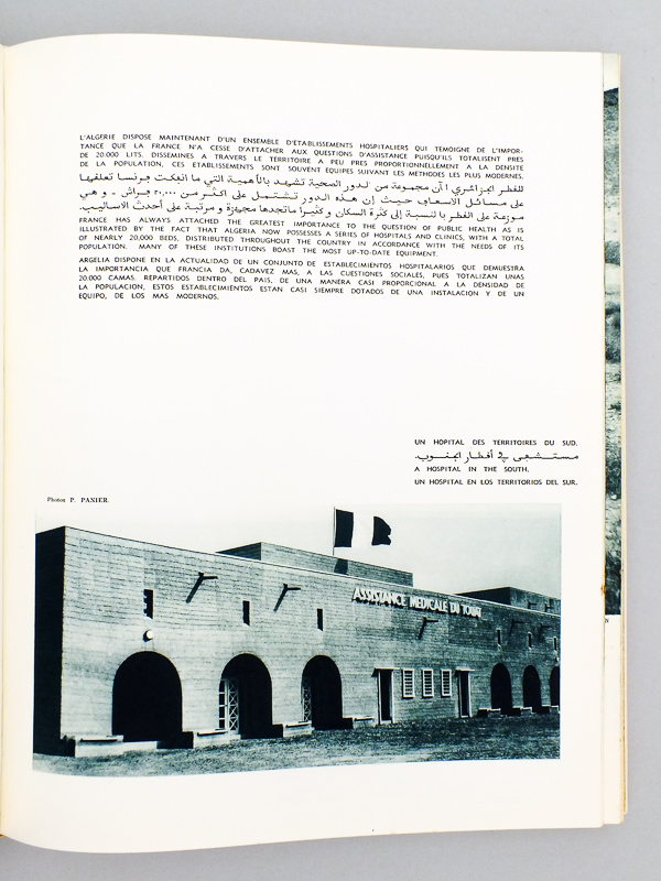 1 vol. in-4 br. sous couv. rempliée et papier cristal, nombr. photos noir et blanc, légendes des photos en français, arabe, anglais et espagnol, Imprimerie Baconnier, Alger, 1951, env. 200 pp. (non paginé) Commentaire : Bon état pour cet album photographique destiné à servir le prestige de la France en Algérie