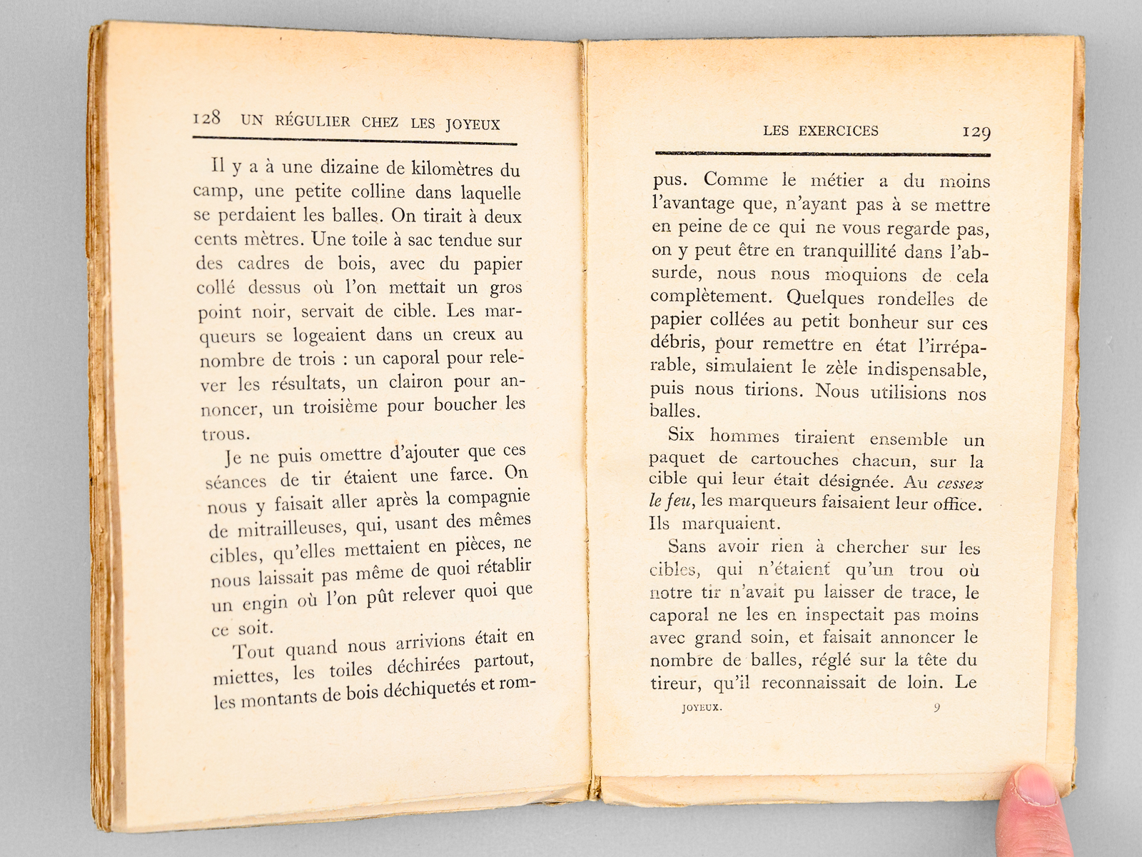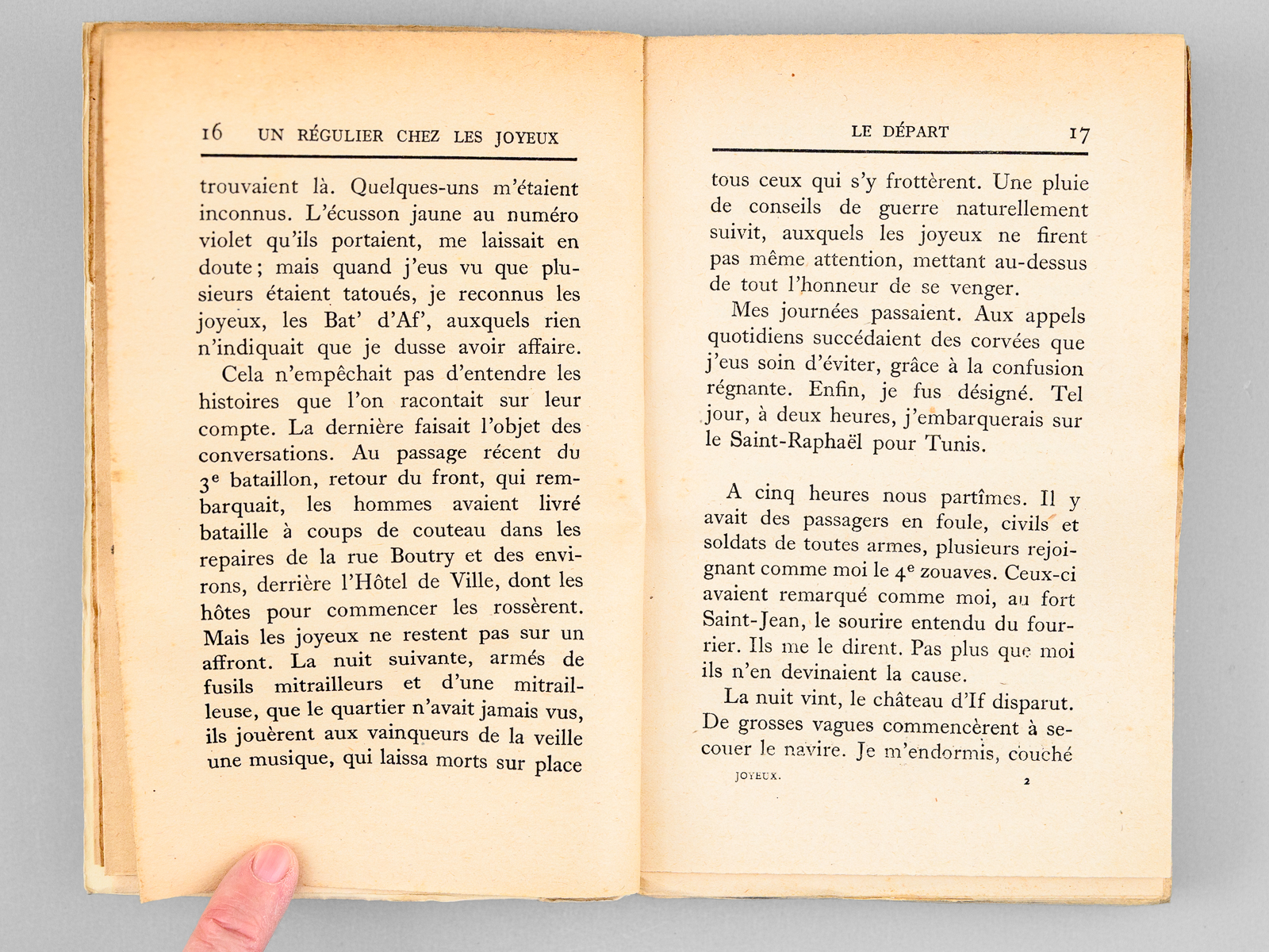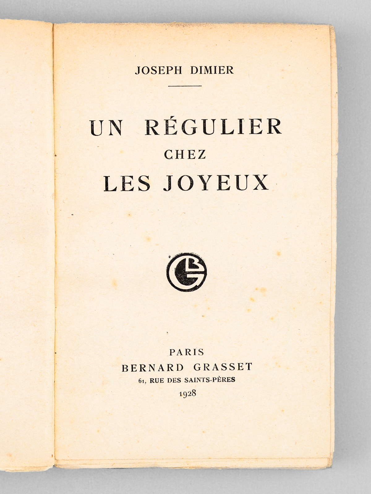 1 vol. in-12 br., Bernard Grasset, Paris, 1928, 259 pp. Commentaire : Bon état. Pour information, dans l'Armée française en Afrique, le surnom de 'réguliers' désignait les non-légionnaires. Quant aux 'Joyeux', il s'agissait de ceux qui étaient passés par le Bat d'Af.. Un ouvrage au ton léger, par un auteur qui eut un parcours personnel étonnant. Issu d'une famille d'intellectuels (son père était agrégé de philosophie), très catholiques et originaire de Savoie, après des études à Louis-le-Grand, il s'engagea en 1916 dans les Chasseurs Alpins. Blessé et décoré, il ne fut pas pas démobilisé dès la fin du conflit, mais fit un séjour de 'volontaire désigné nominativement' pour aider à l'encadrement des troupes de l'Armée d'Afrique. Cette expérience est le sujet du présent livre. Il verra de nouveau le feu pendant la Seconde Guerre Mondiale, notamment sur le Chemin des Dames où, fait curieux, il avait déjà combattu à l'automne 1917. Plus étonnant encore, en 1928, Joseph Dimier entra en religion comme moine trappiste, sous le nom de Père Anselme. Ordonné prêtre en 1932, il deviendra un spécialiste de l'art cistercien. Il passa les 30 dernières années de sa vie à l'abbaye Notre-Dame de Scourmont (Chimay, Belgique]. Ouvrage peu courant.