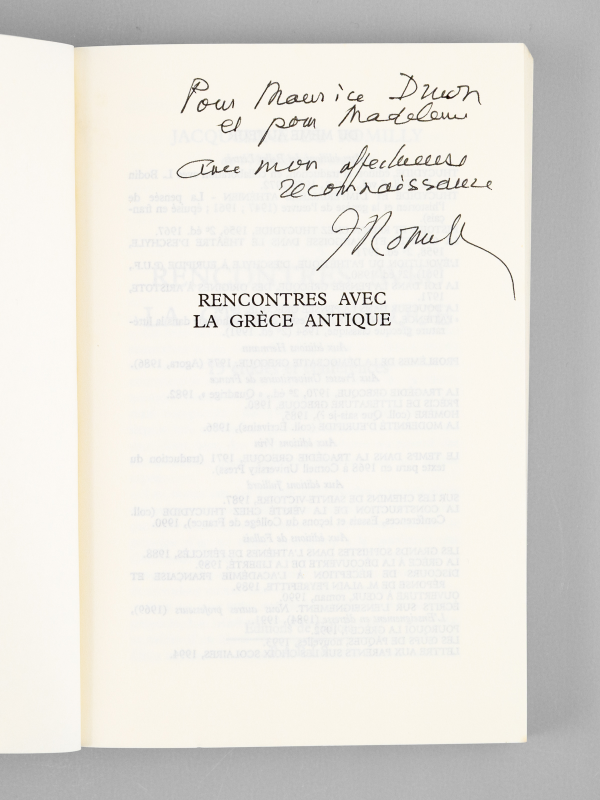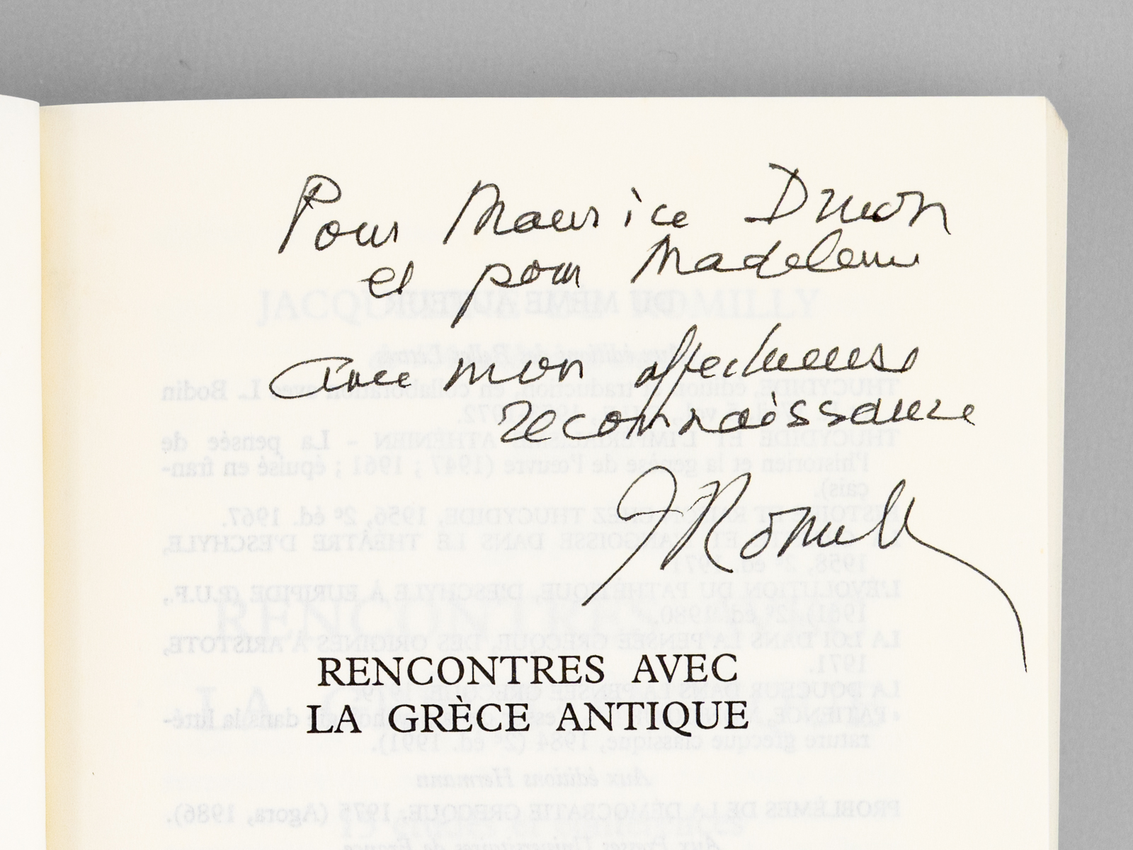 Envoi ms. de l'auteur, 1 vol. in-12 br., Editions de Fallois, Paris, 1995, 298 pp. Commentaire : Envoi de l'auteur à l'académicien Maurice Druon et à son épouse : 'Pour Maurice Druon et pour Madeleine, avec mon affectueuse reconnaissance.' Maurice Druon (1918-2009), auteur notamment de la célèbre saga historique des Rois maudits, fut élu à l'Académie Française en 1968. Il en devint le Secrétaire Perpétuel, de 1985 à 1999. Jacqueline de Romilly, quant à elle, fut élue à l'Académie Française en 1988. Etat très satisfaisant (lég. rouss. sur tr. sup., bon état par ailleurs) pour cet exemplaire, d'une origine prestigieuse.
